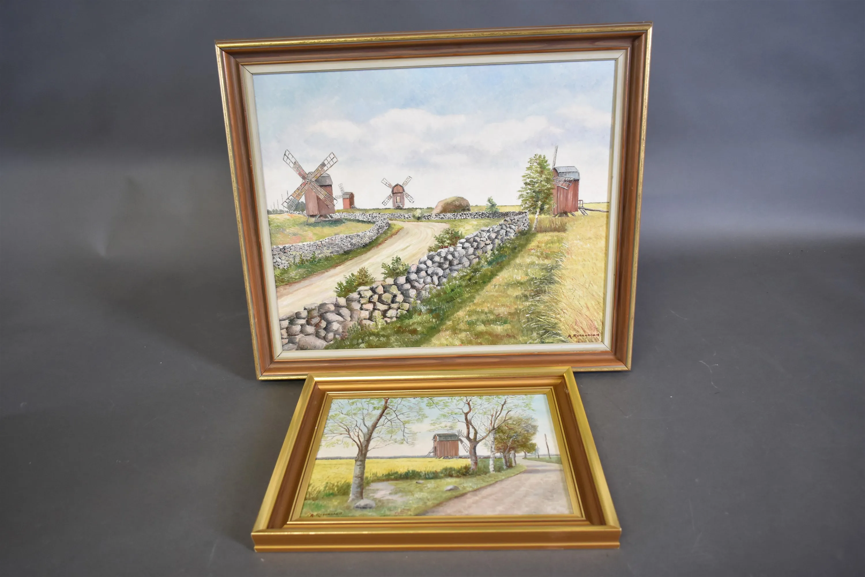 16452. A Rosenblad oljor på pannå 2 st, väderkvarnsmotiv, största mått 63x54 cm
