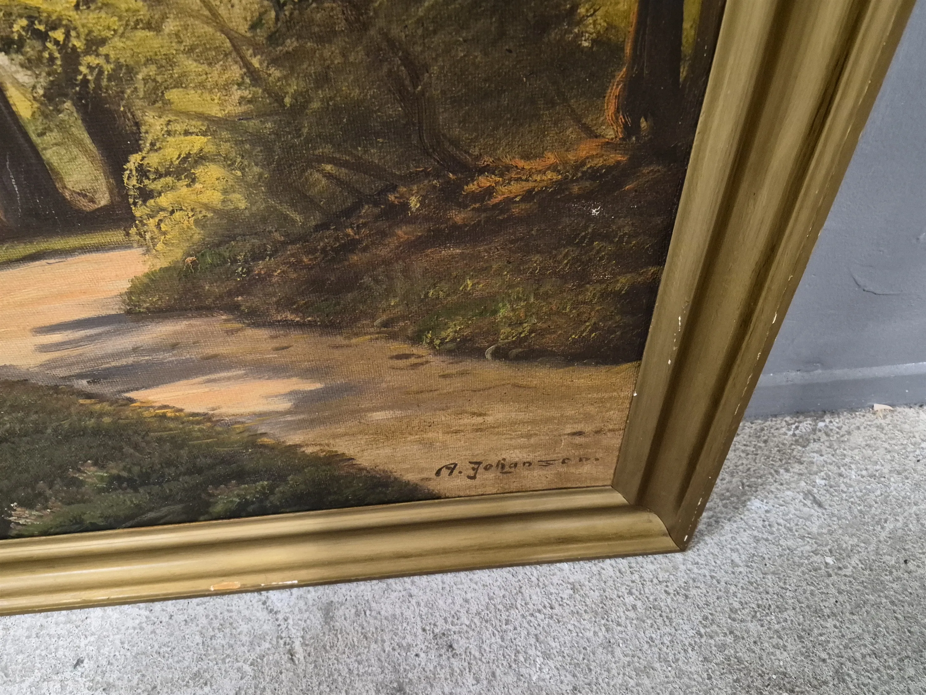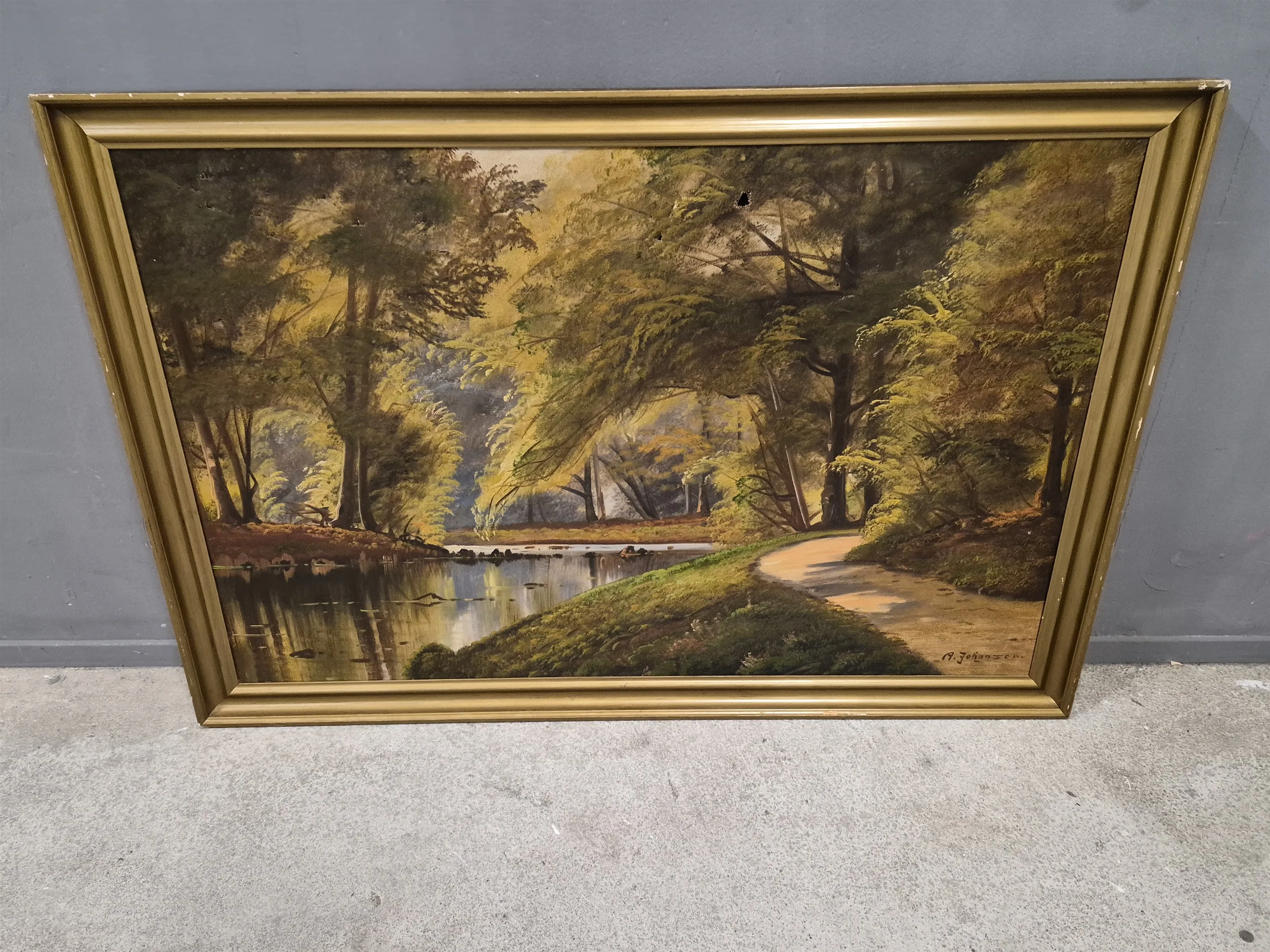 18600. A.Johansen "Å i landskap", olja på duk, tidigt 1900-tal, hål i duk finns