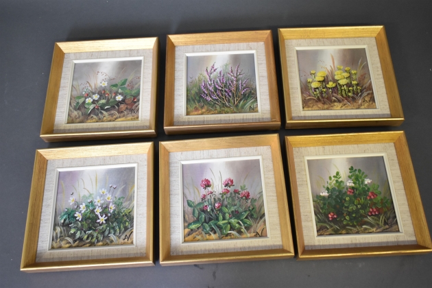 15400. Aino Vastamäki olja på pannå, 6 st, "Blommotiv", mått 23 x 23