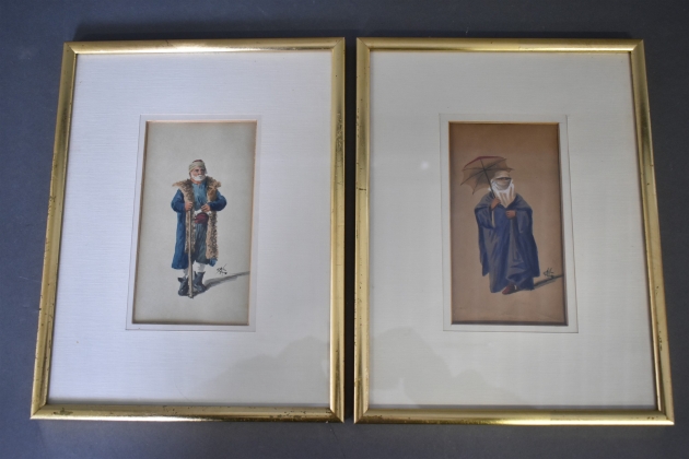 15585. Akvareller 1 par, signerade, "Man & Kvinna", mått 225 x 29 cm