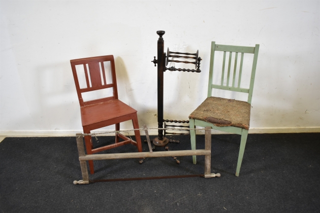 12598. Allmogeföremål, 4 del bl.a stolar högsta 107 cm