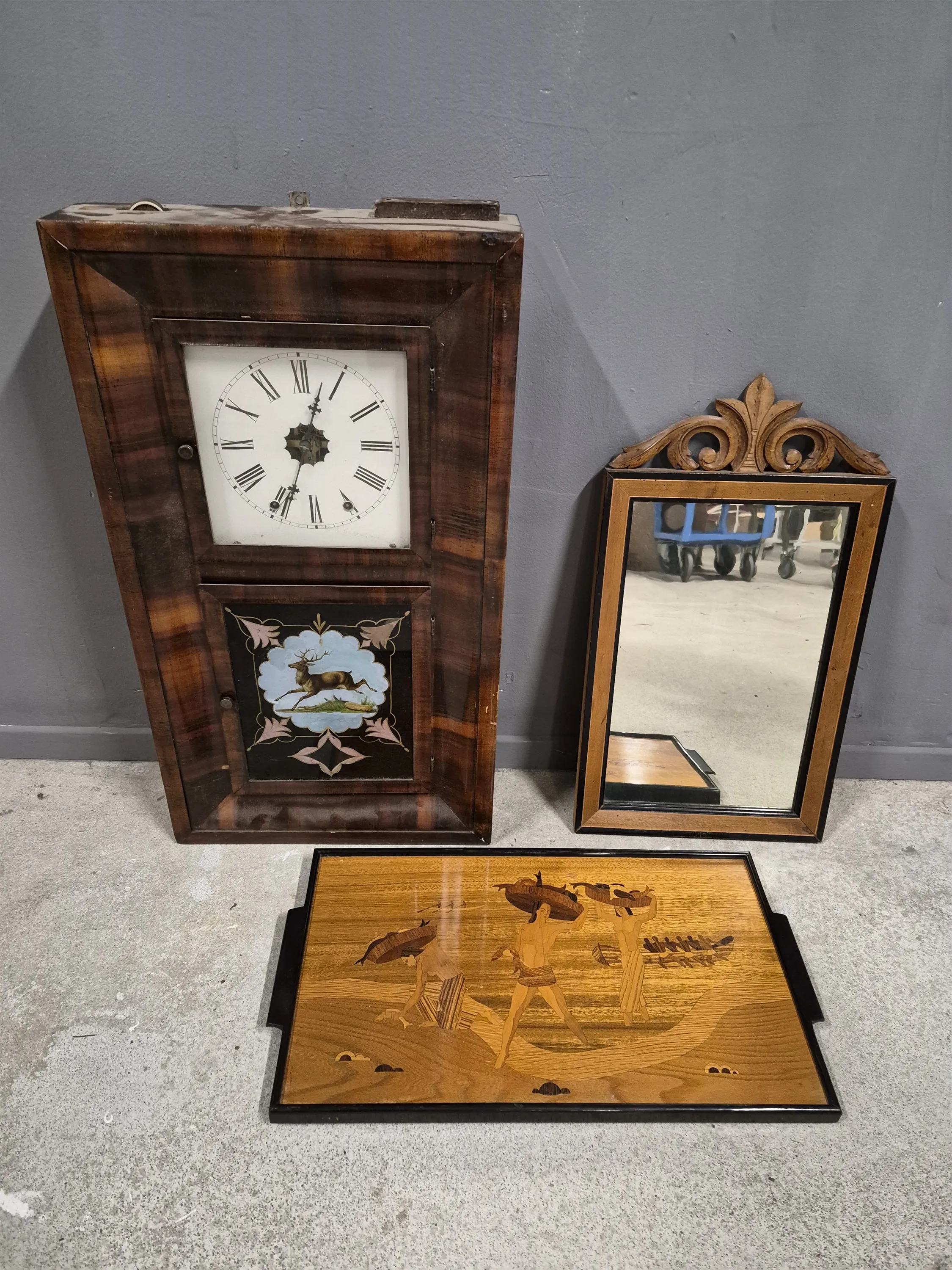 17269. Amerikaur, träbricka och spegel, lod saknas, mått på ur 76x52 cm