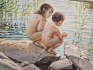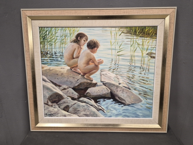 18799. Arne Bark olja på duk "Badande barn", mått 66 x 77 cm