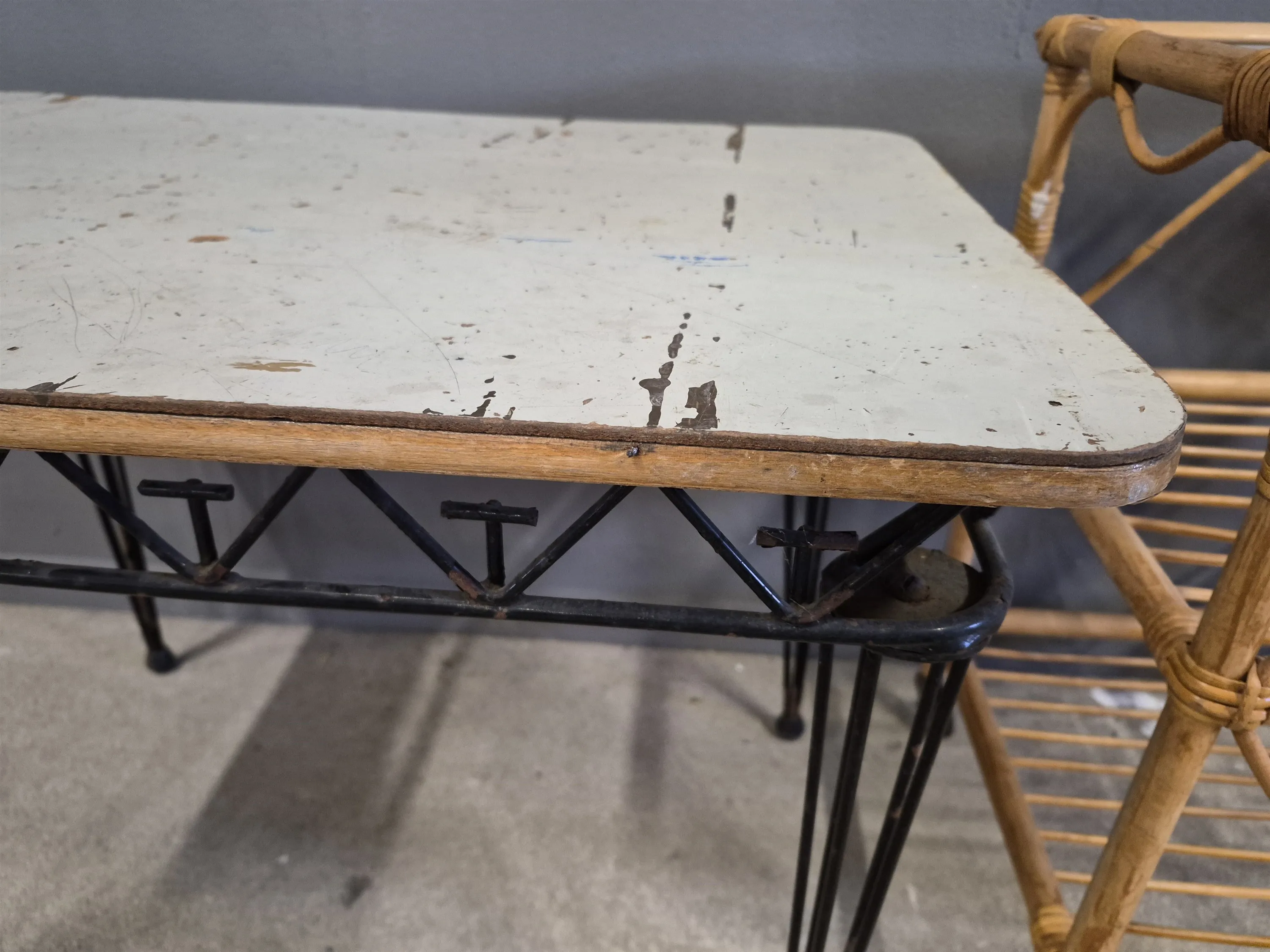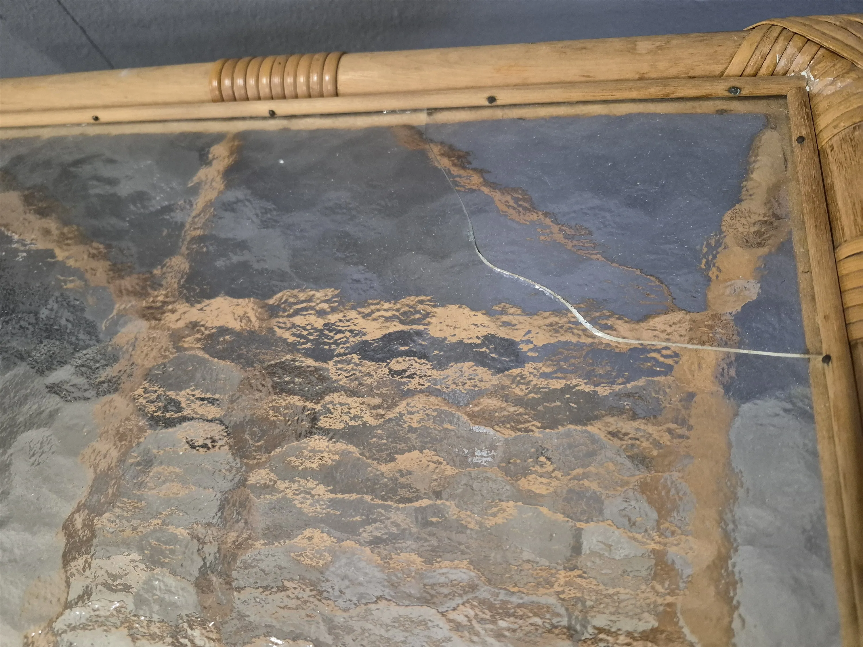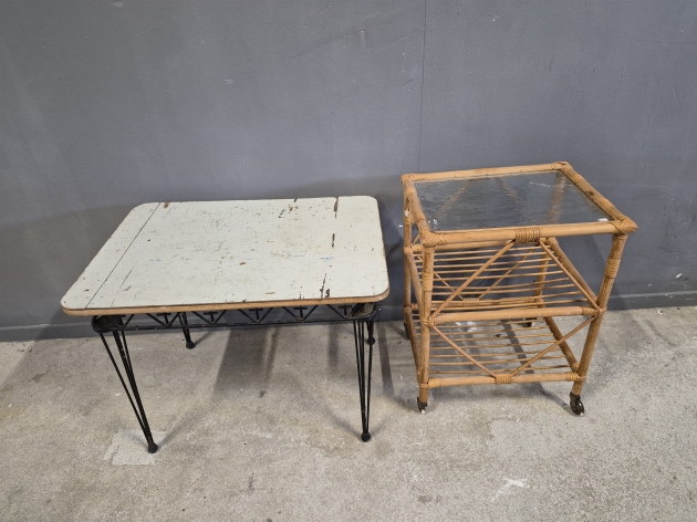 19302. Avlastningsbord 2 st bla rotting med hjul, spricka i glas, defekter finns, högsta höjd 58 cm