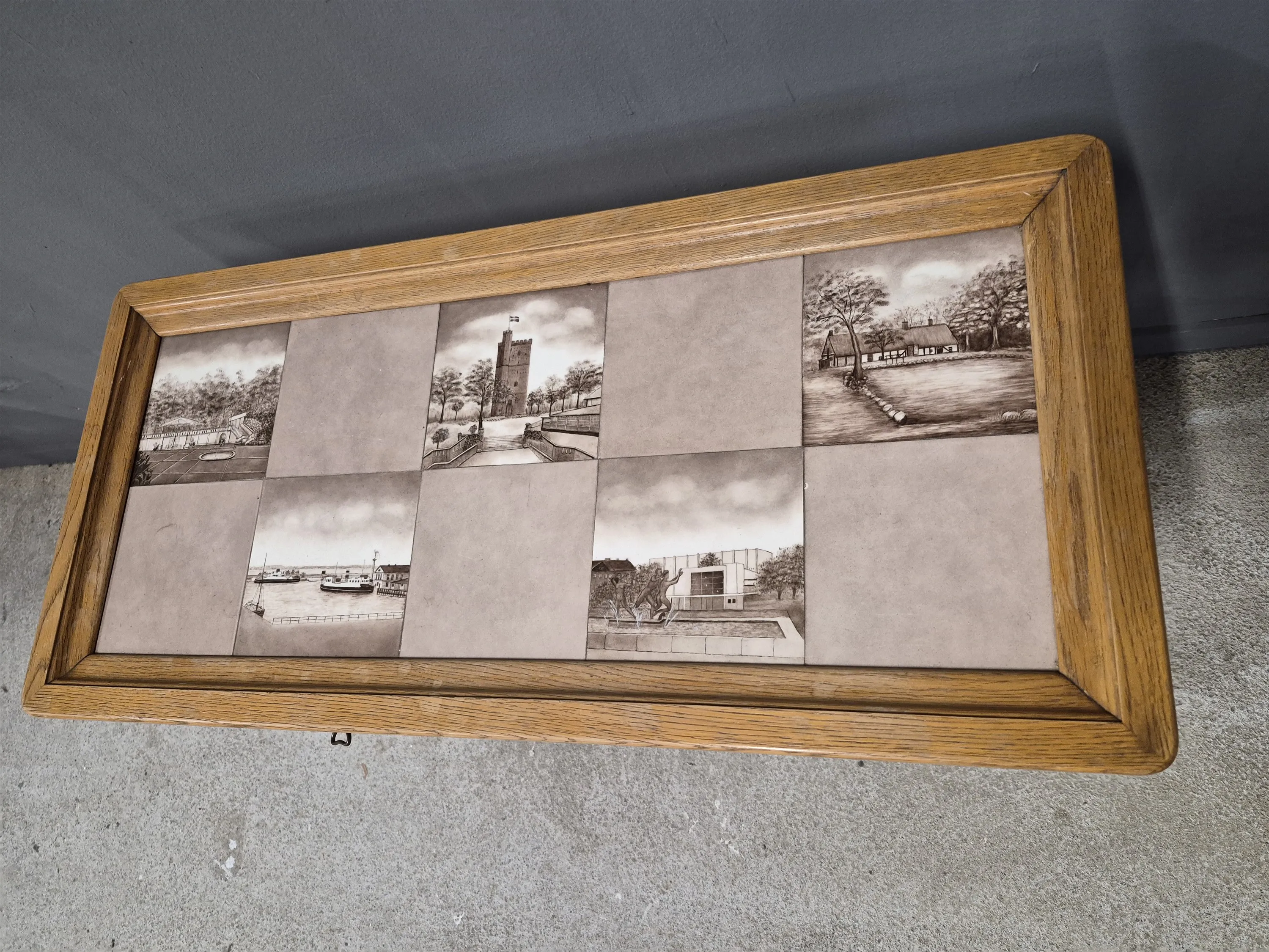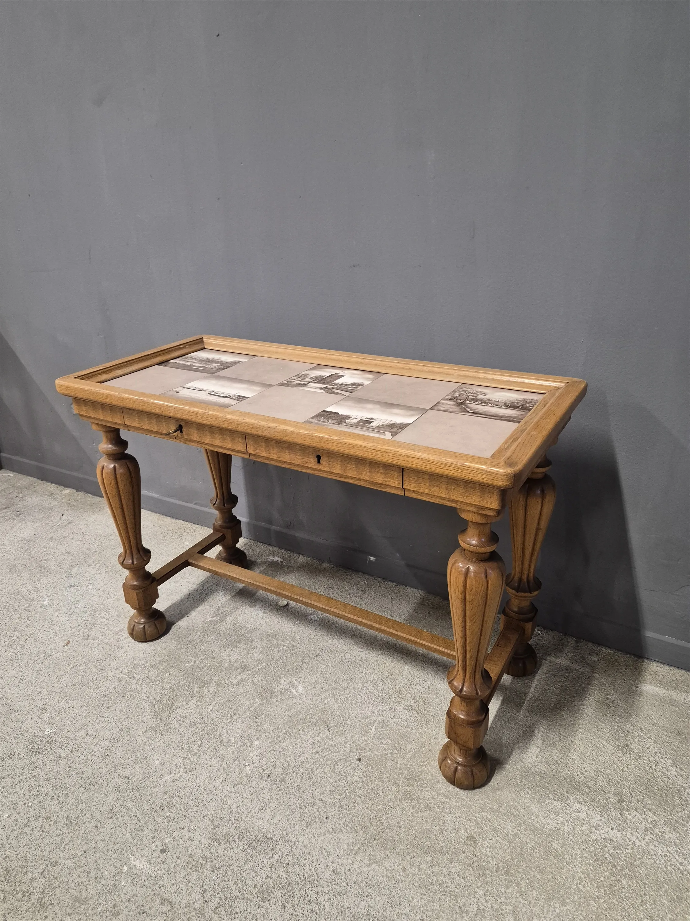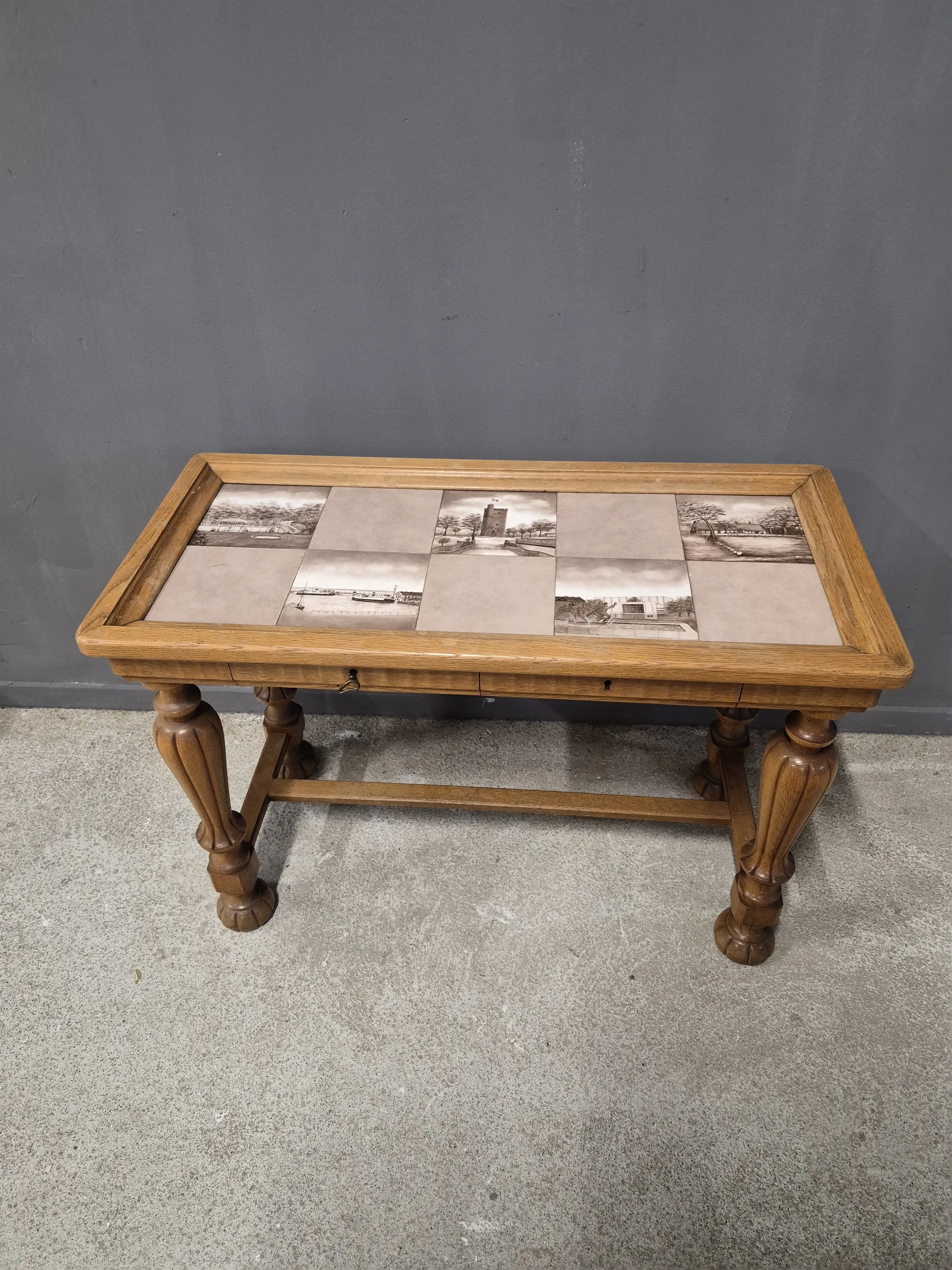 17088. Avlastningsbord med lådor, kakelskivor, Helsingsborgsmotiv höjd 59 cm mått 85 x 50 cm