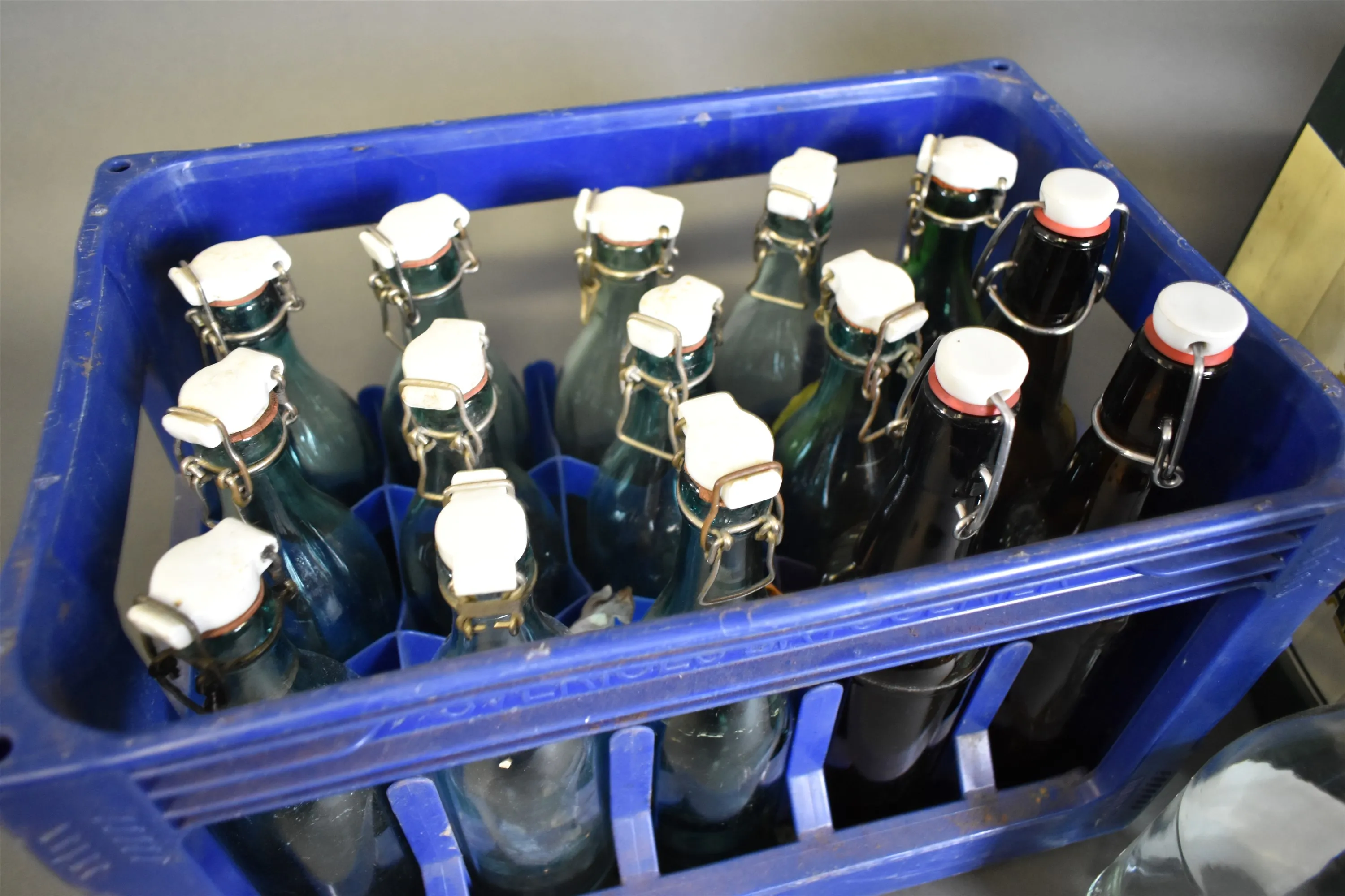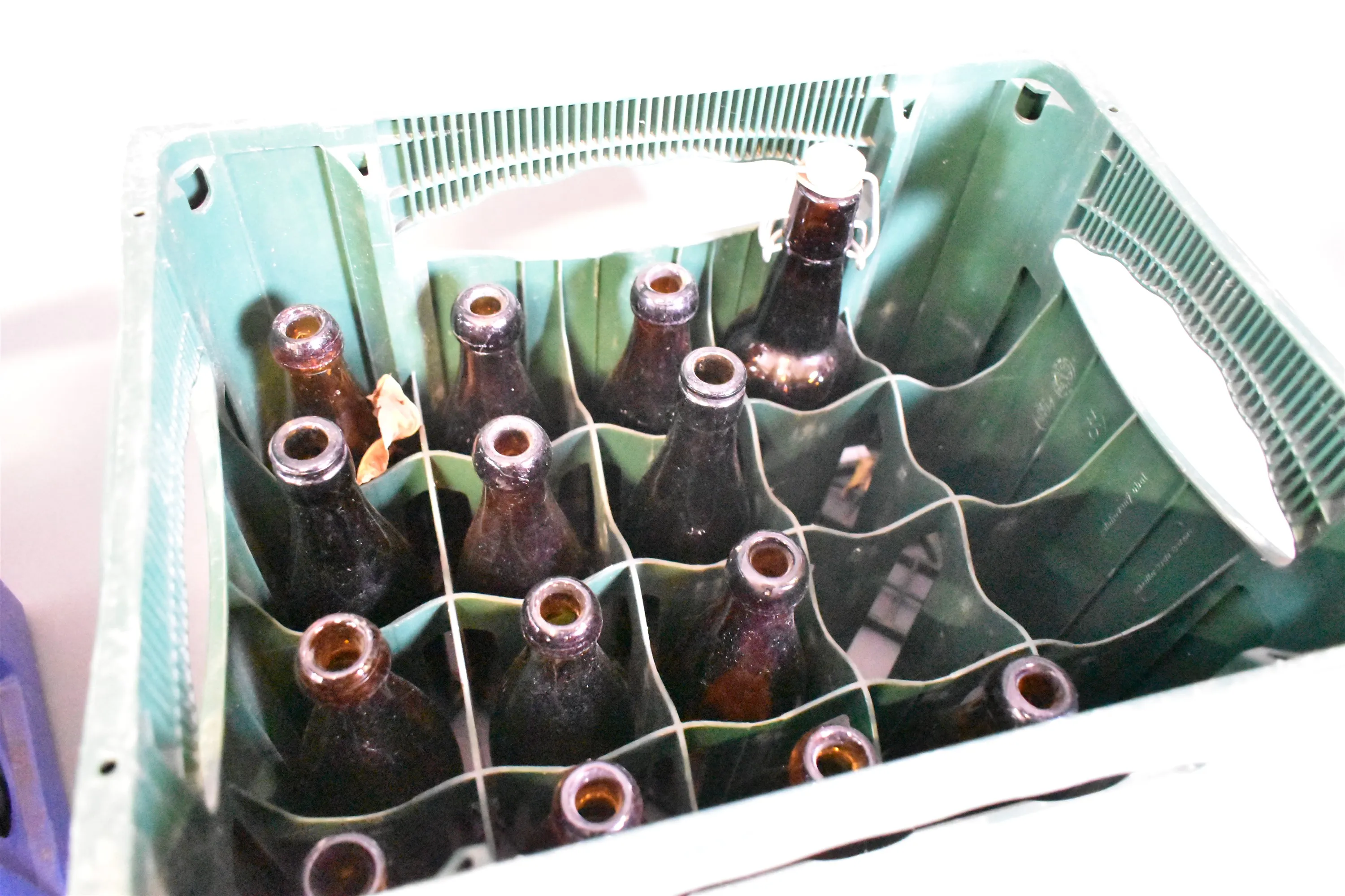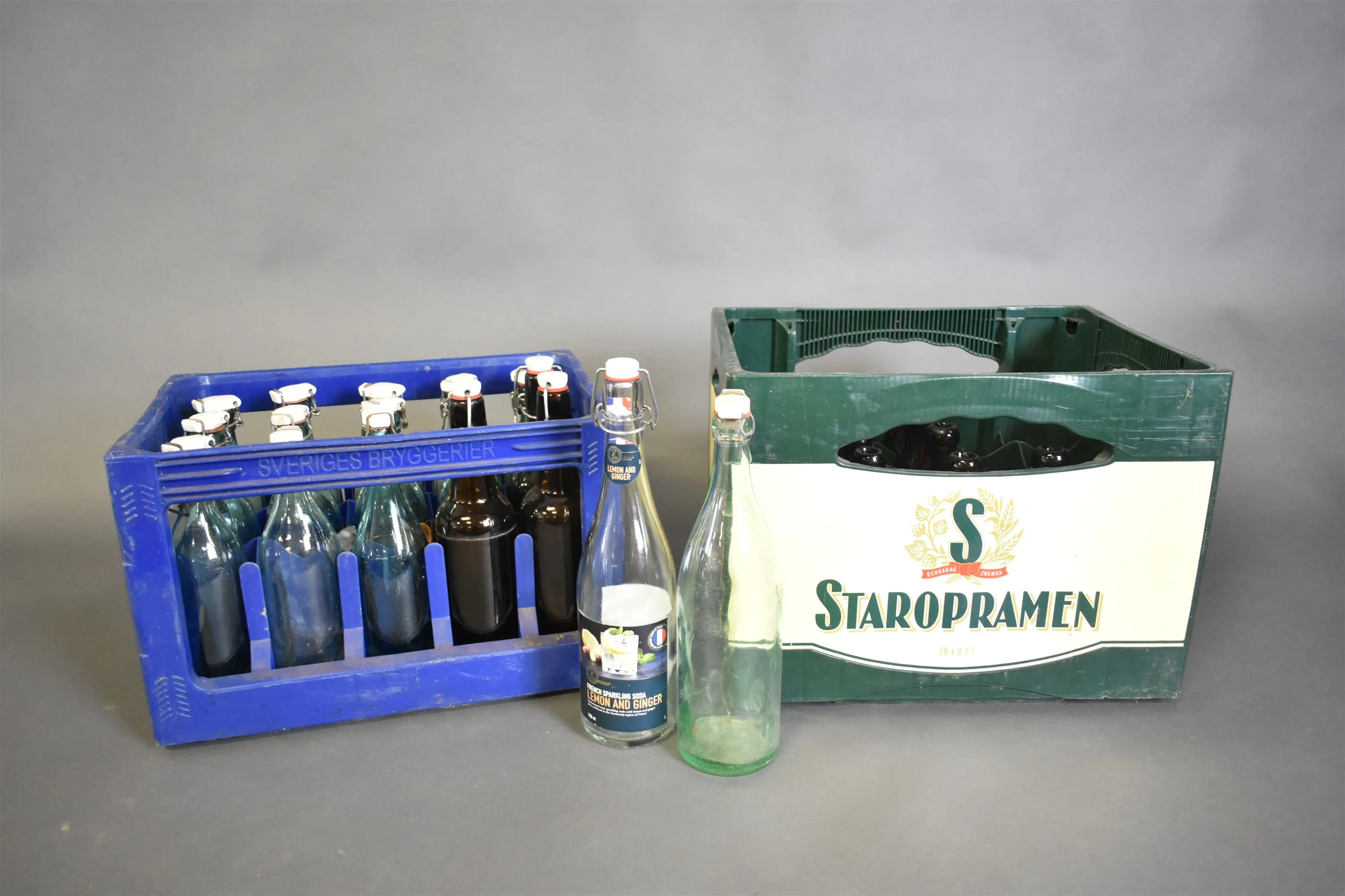 3887. Backar med glasflaskor 2 st, högsta höjd 32 cm