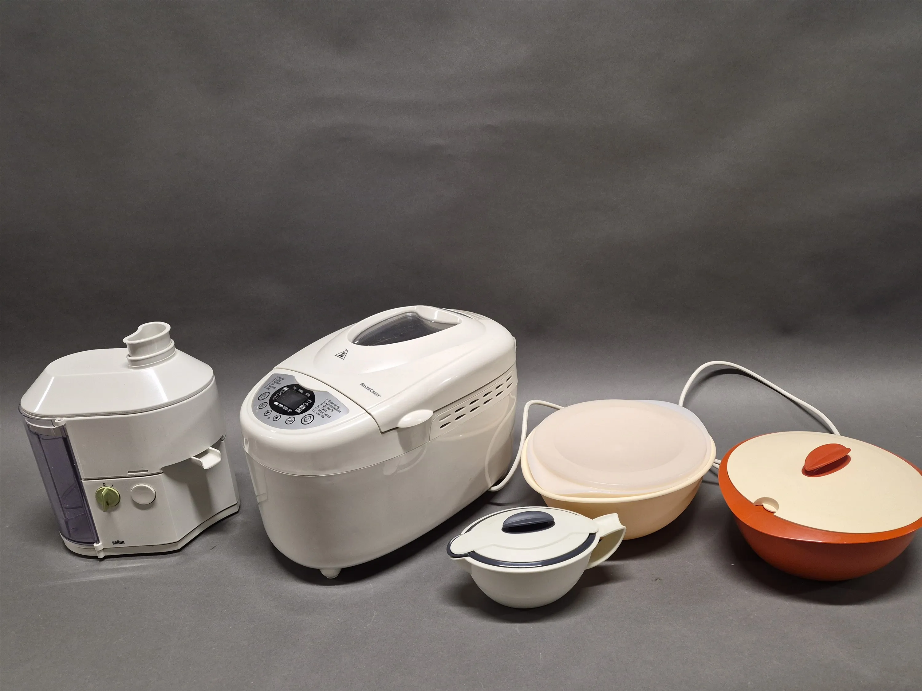 19536. Bakmaskin, juicemaskin och Tupperware, ej testat, högsta höjd 31 cm