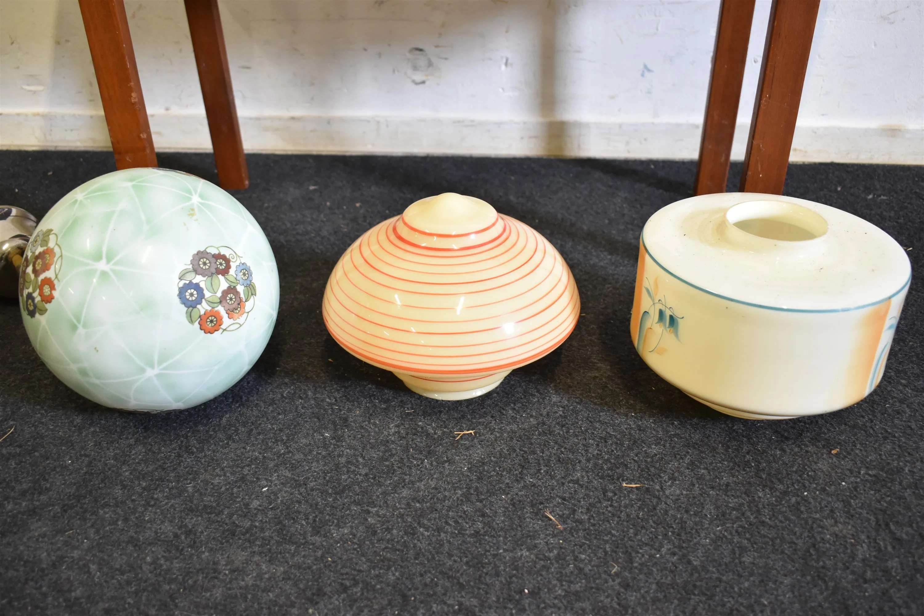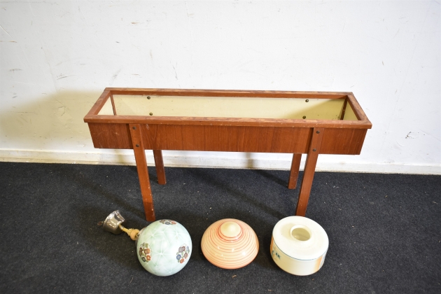 15711. Blombord och lampkupor 3 st, mått blombord längd 100 cm, höjd 53 cm, bredd 25 cm
