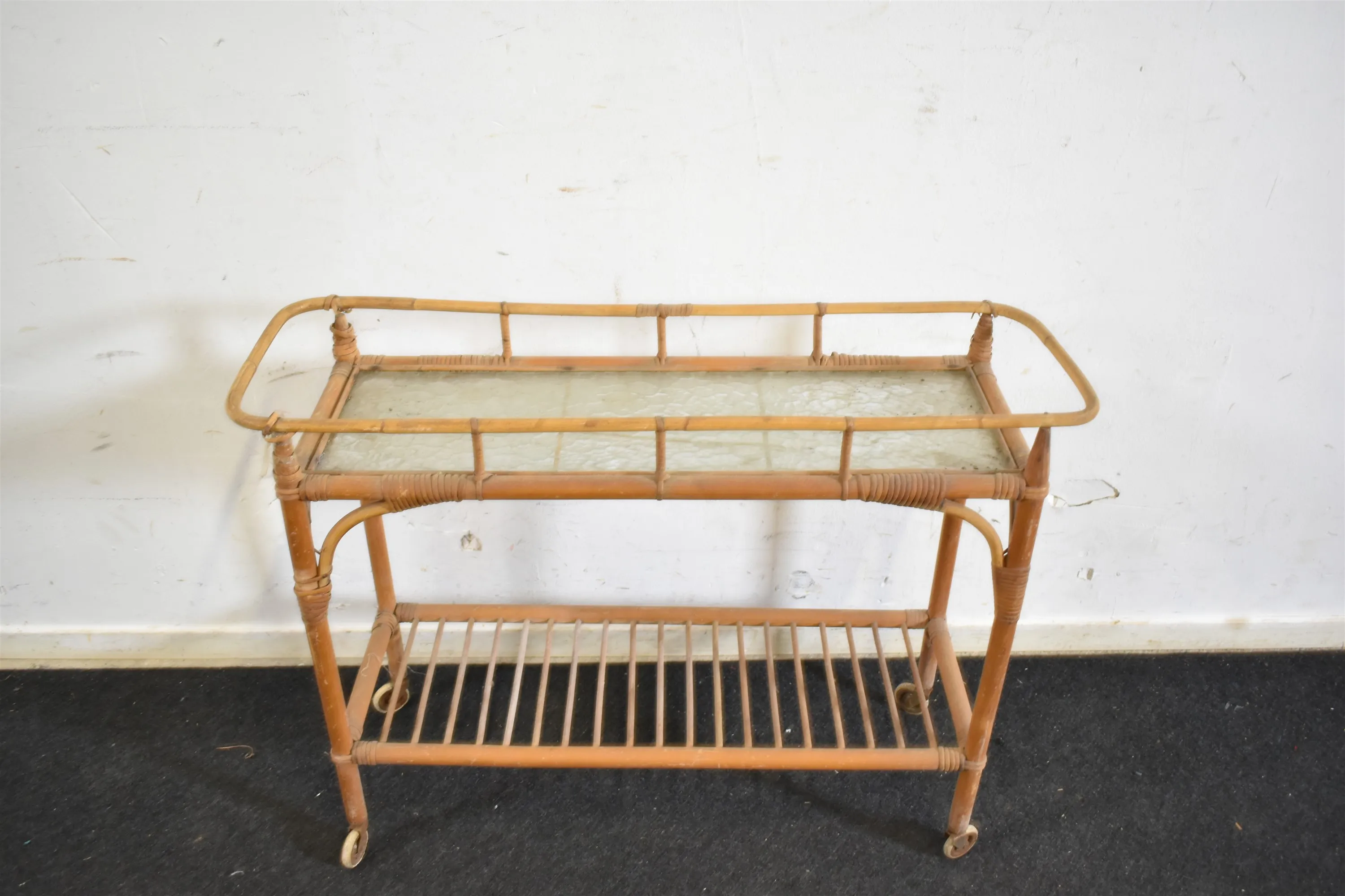 15364. Blombord på hjul, rotting, höjd 64 cm, längd 87 cm, bredd 27 cm