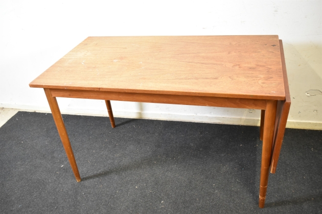 14371. Bord med klaff, teak, fläckar finns, höjd 73 cm, bredd 66 cm, längd 120 cm klaff 40 cm