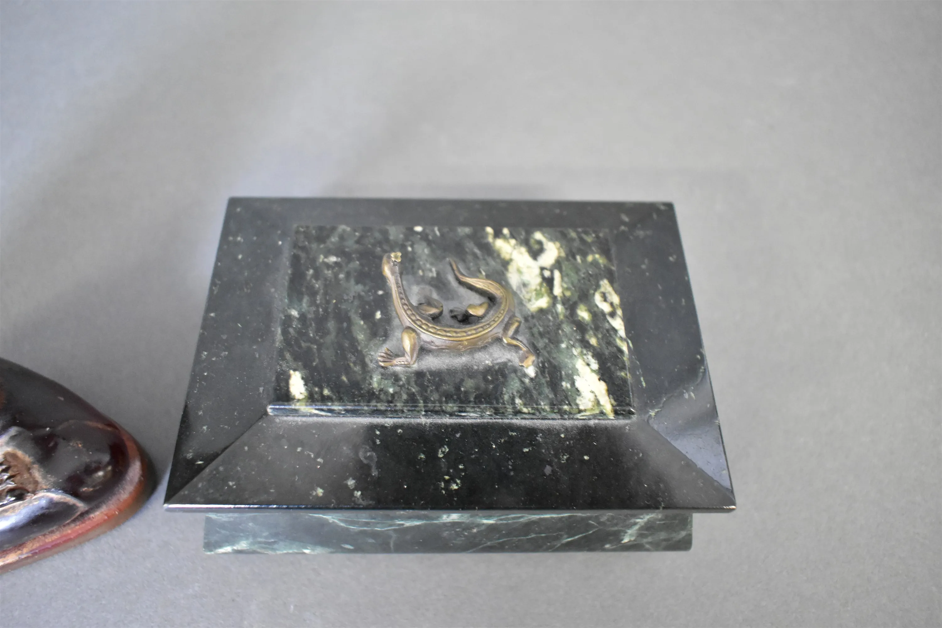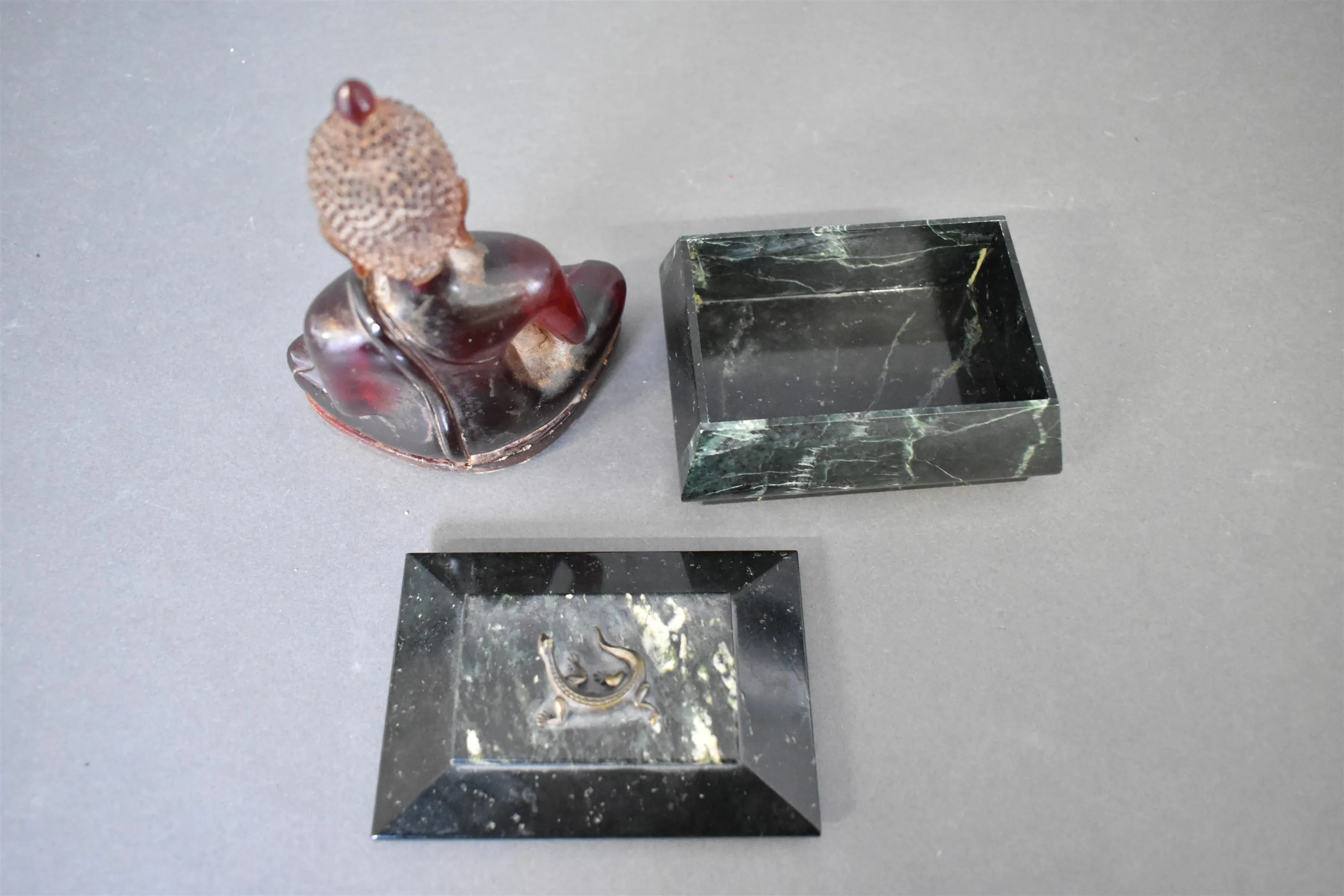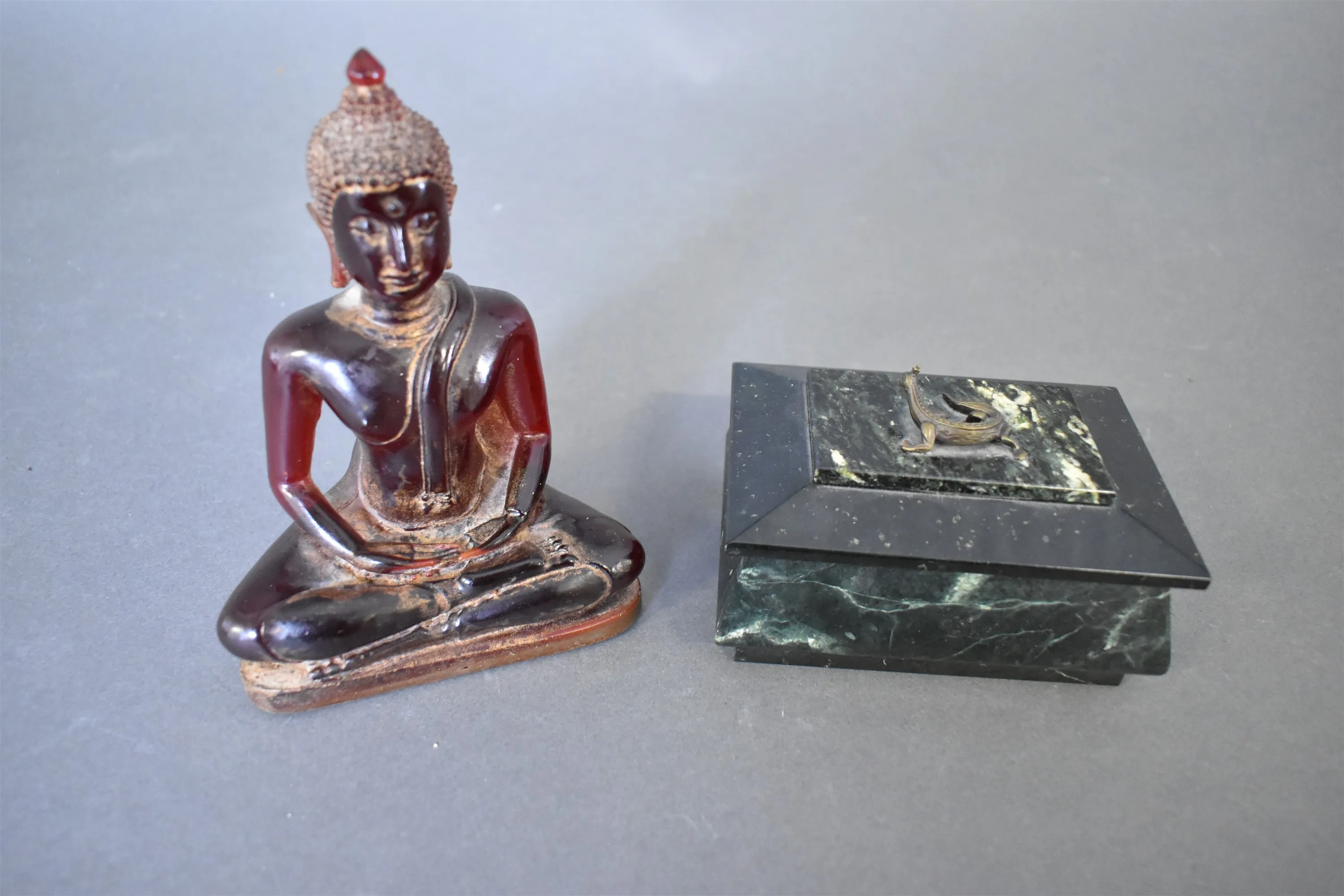 15014. Bordsfigur och lockburk i sten, orientaliska, höjd på figur ca 15 cm