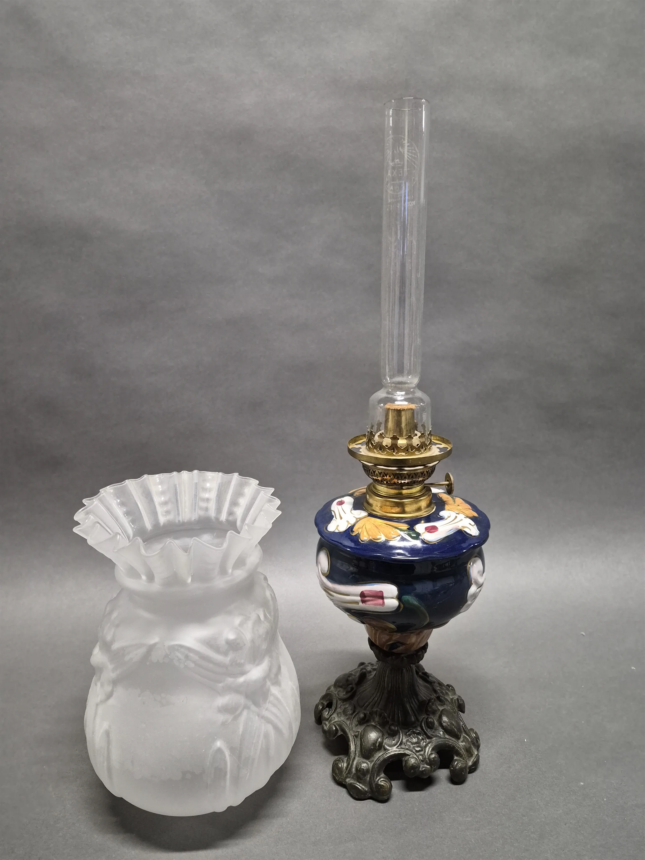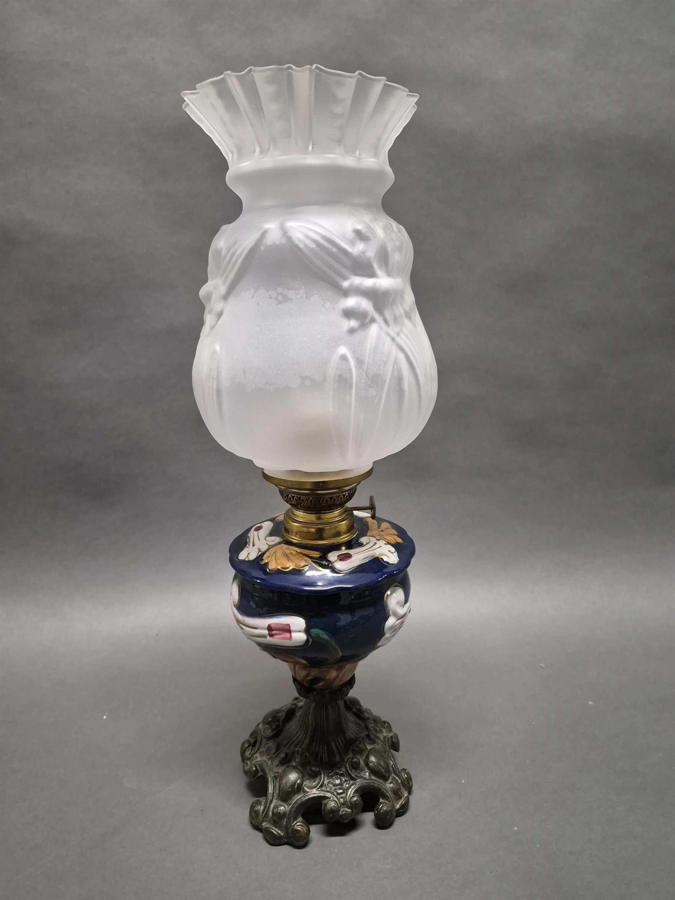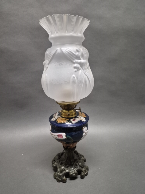 17979. Bordsfotogenlampa majolika, höjd 56 cm