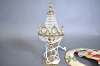 2408. Bordslampa med prismor & metallskylt, största mått 46 cm