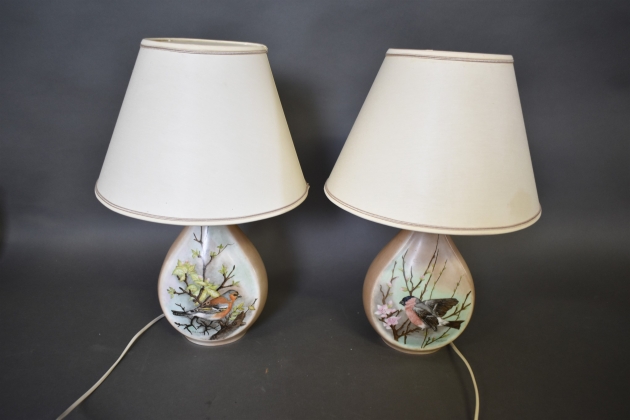 15525. Bordslampor 1 par, handmålade, "Fågelmotiv" signerade I-d Engert, höjd 45 cm