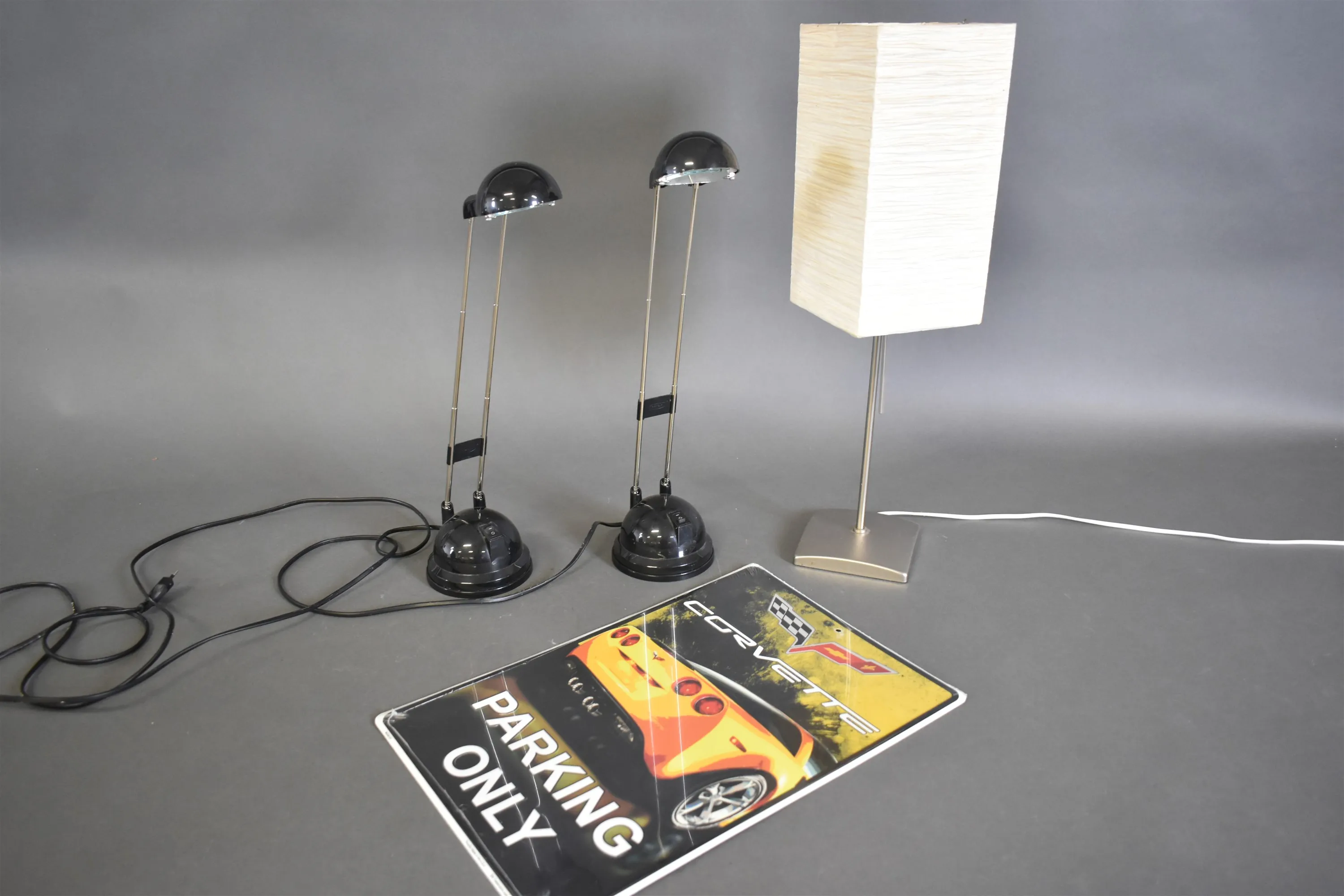 15226. Bordslampor 3 st och plåtskylt "Corvette parking only", inplastad, högsta höjd 58 cm