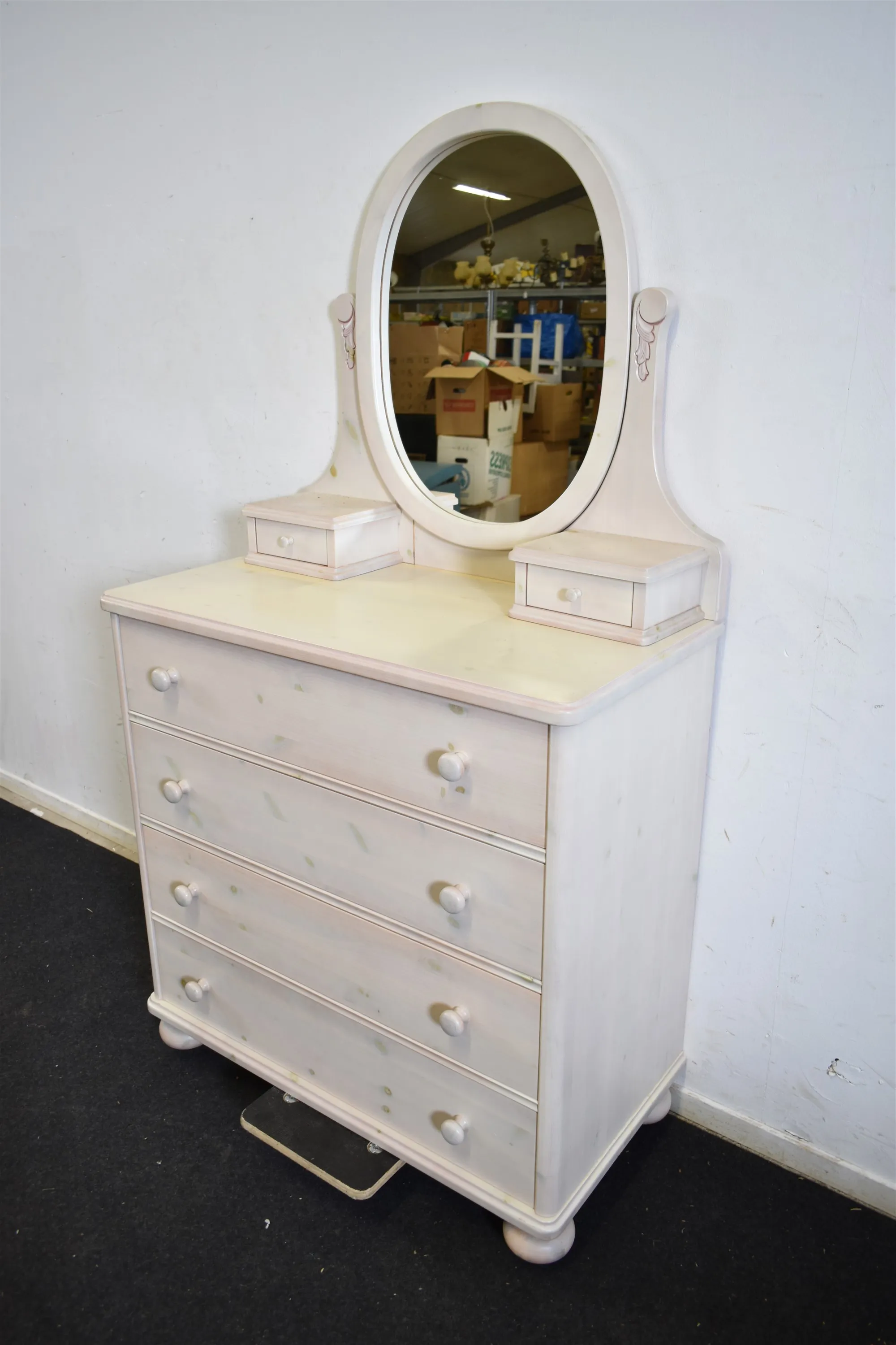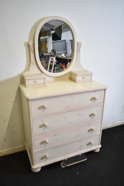 15699. Byrå med spegel, betsad furu, höjd 175 cm, bredd 93 cm, djup 48 cm