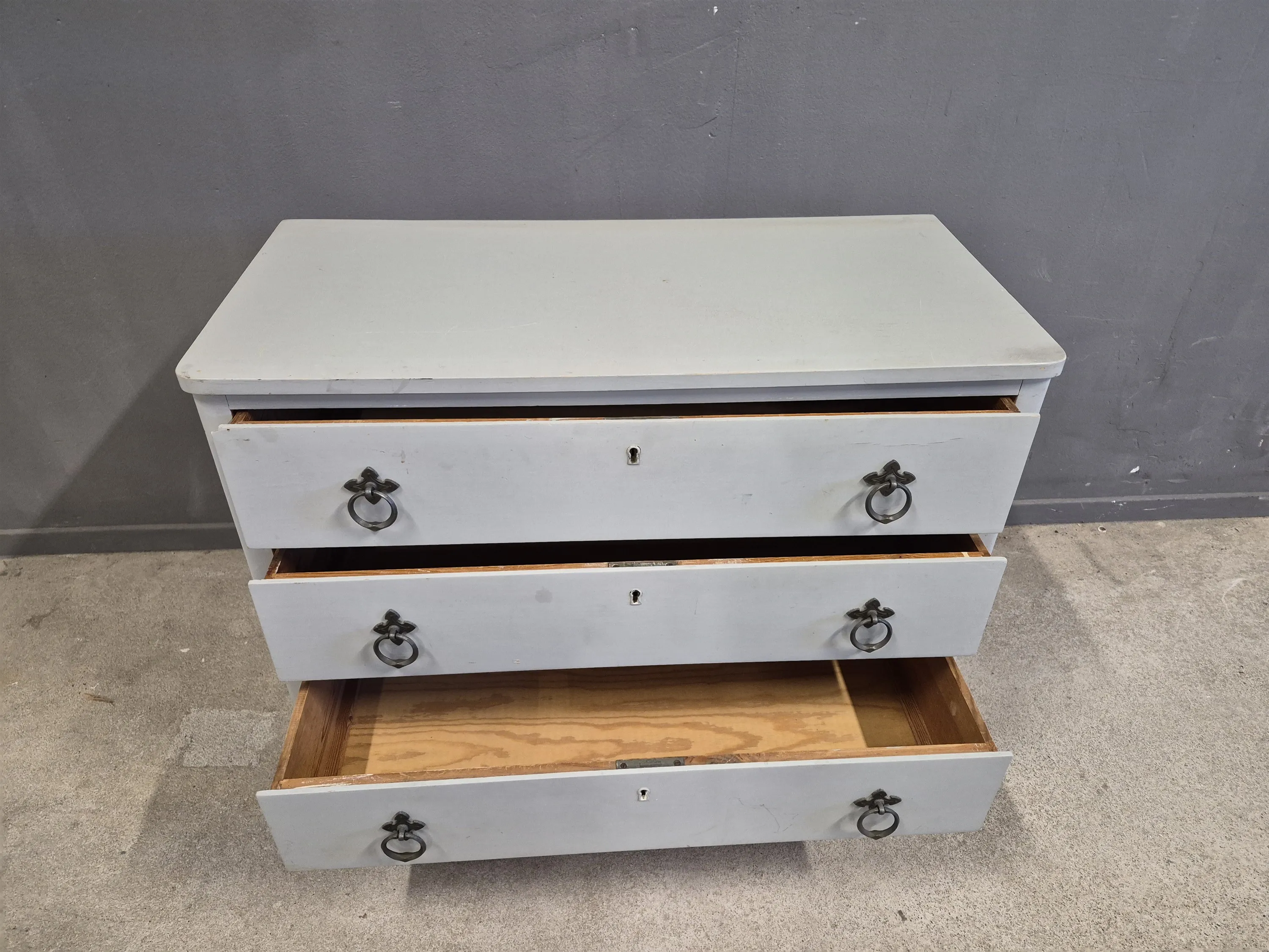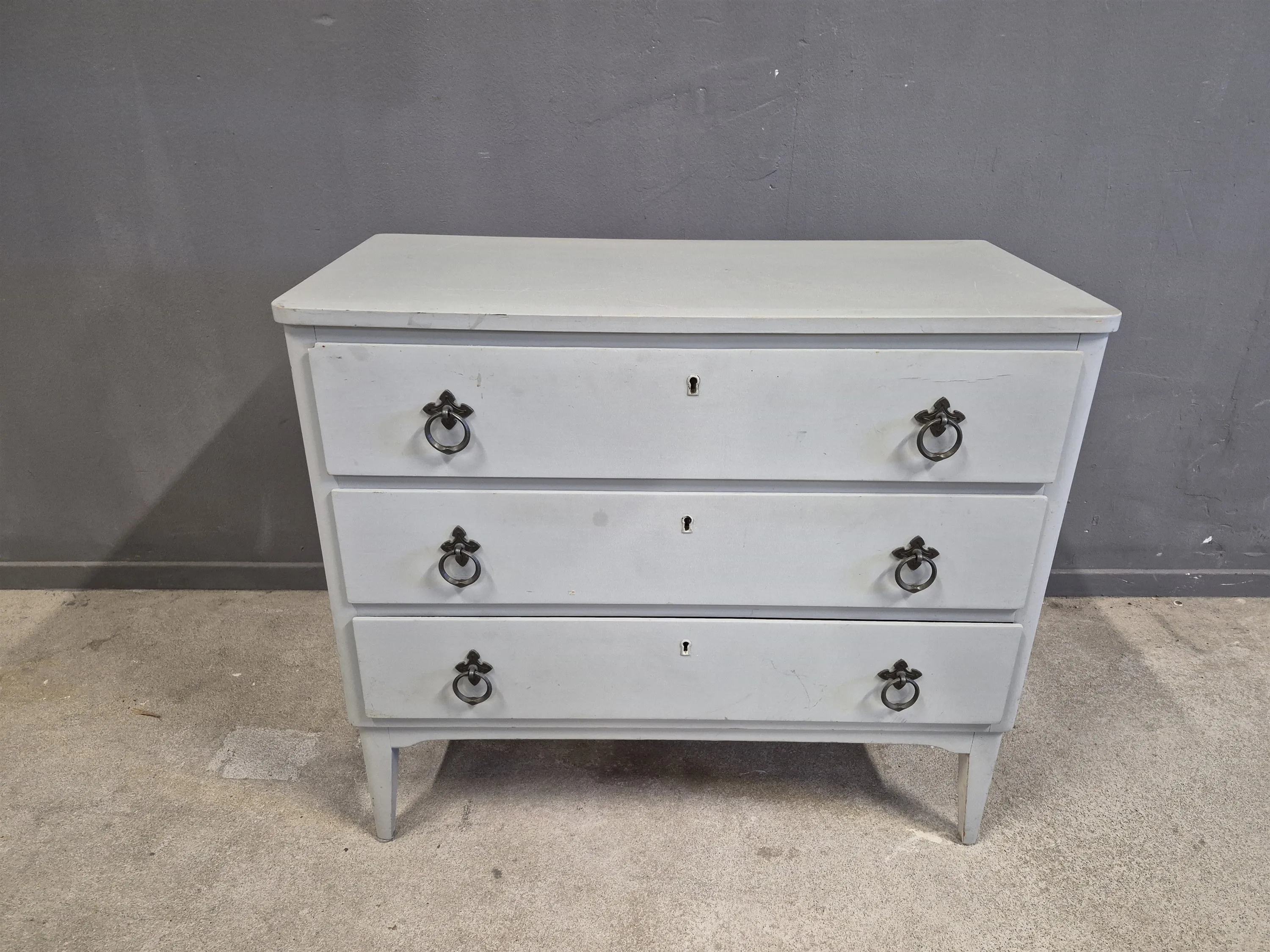 20477. Byrå på ben, 3 lådor, grålack, längd 84 cm bredd 41 cm, höjd 73 cm