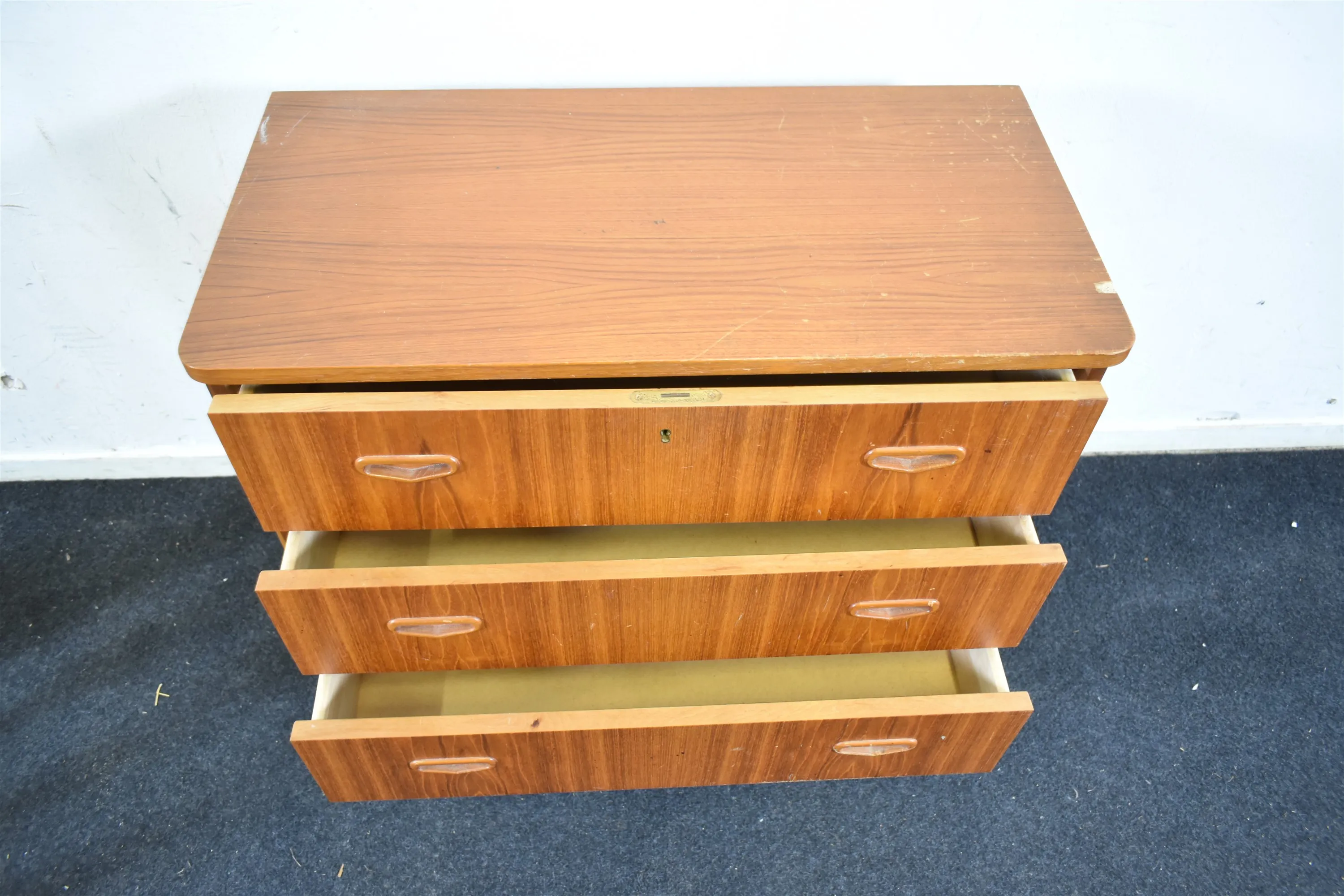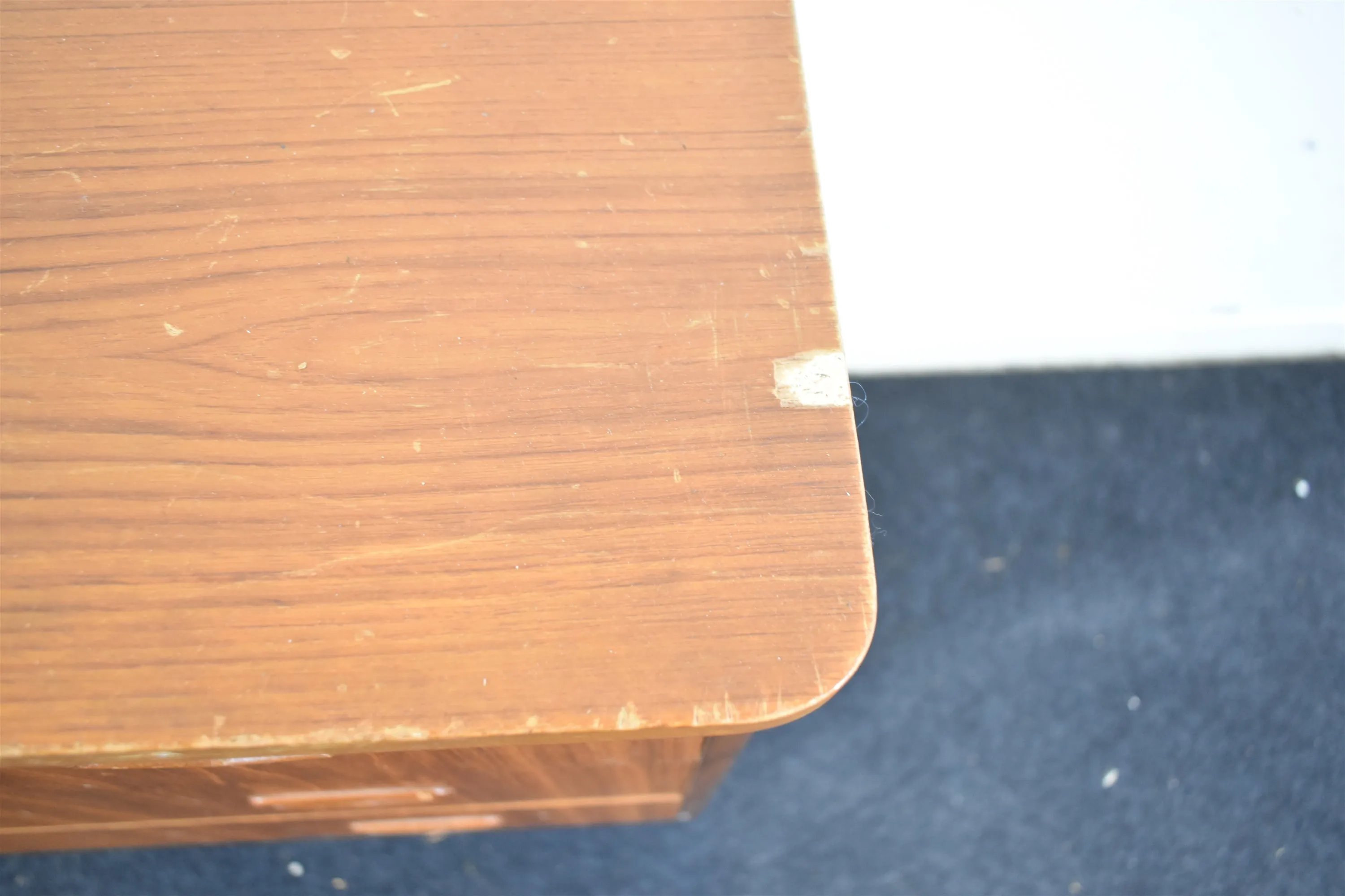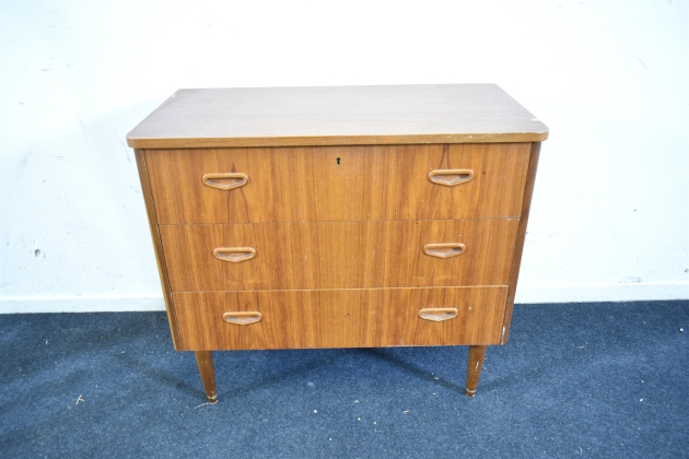 16179. Byrå teak 3 lådig, fanér defekt finns höjd 70 cm, bredd 75 cm, djup 35 cm