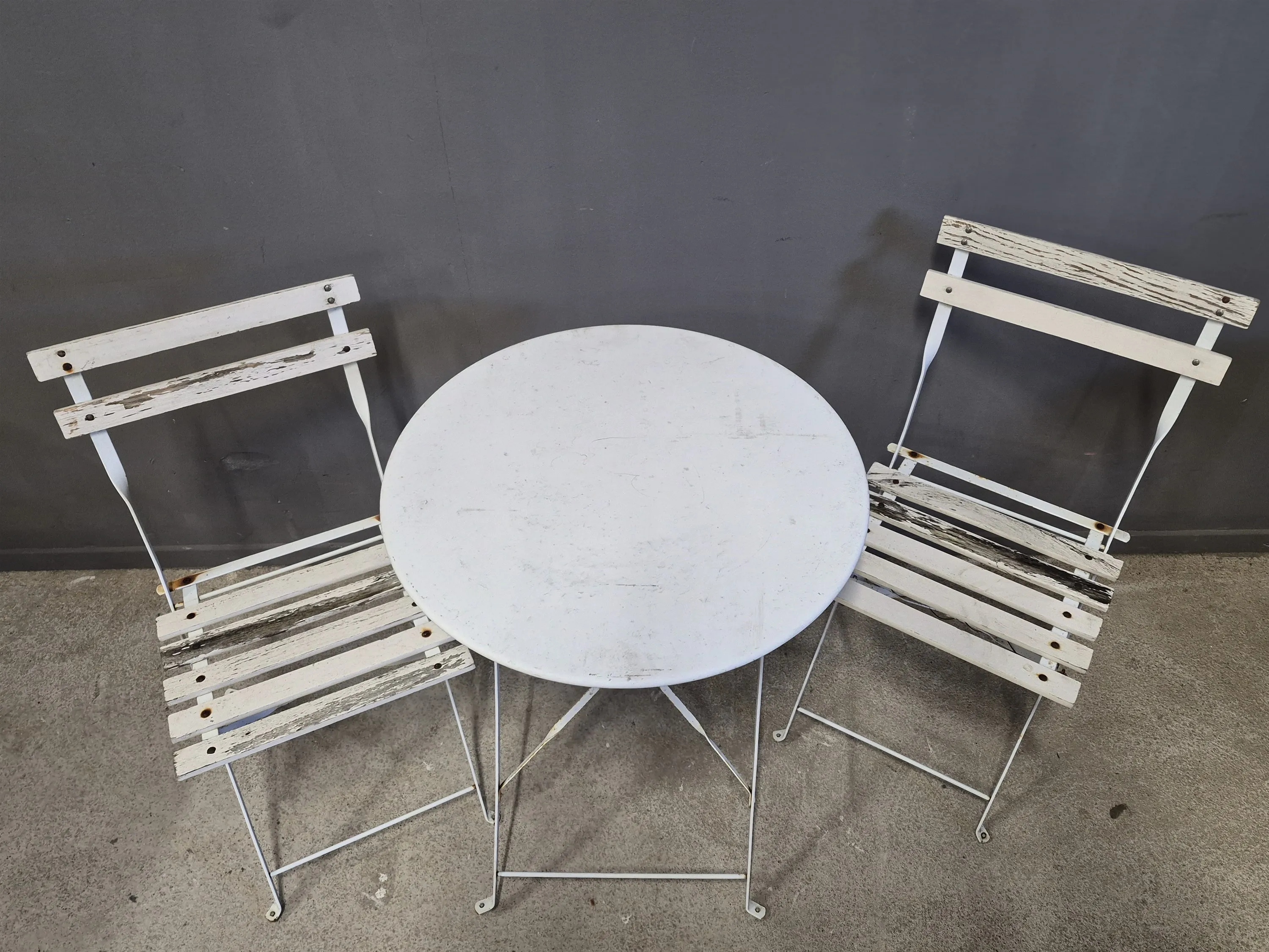 17852. Cafegrupp, 3 dell metall/trä, hopfällbart höjd stolar 80 cm, bord 70 cm