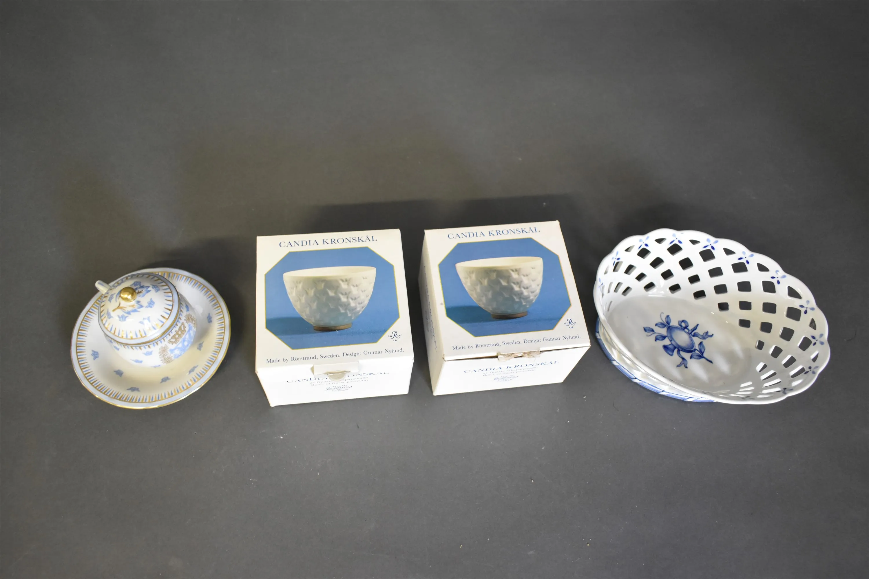 7632. Crémekopp, skålar 3 st Orrefors, bl.a Candia Kronskål längsta 18 cm