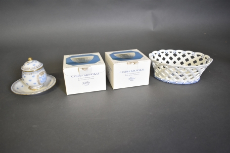 7632. Crémekopp, skålar 3 st Orrefors, bl.a Candia Kronskål längsta 18 cm