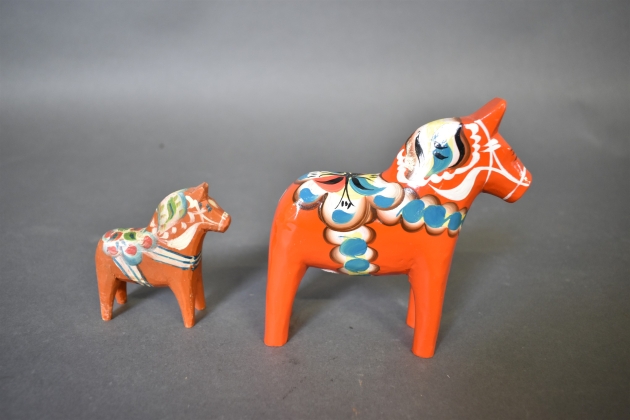 15807. Dalahästar 2 st, bl.a Yngve Tjäder Nusnäs, högsta 13 cm