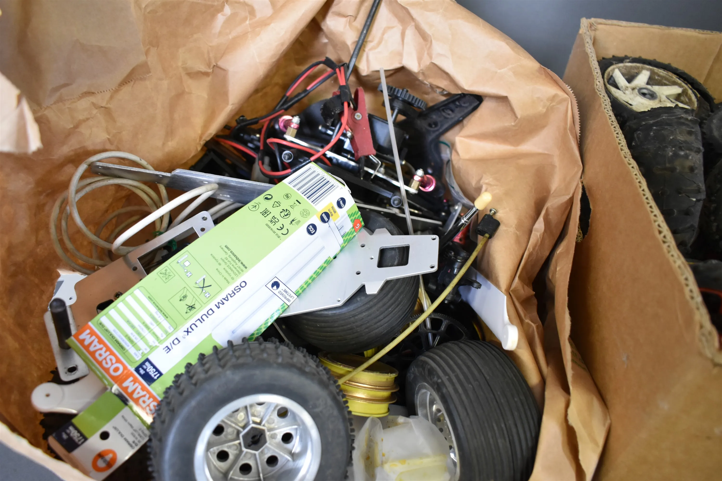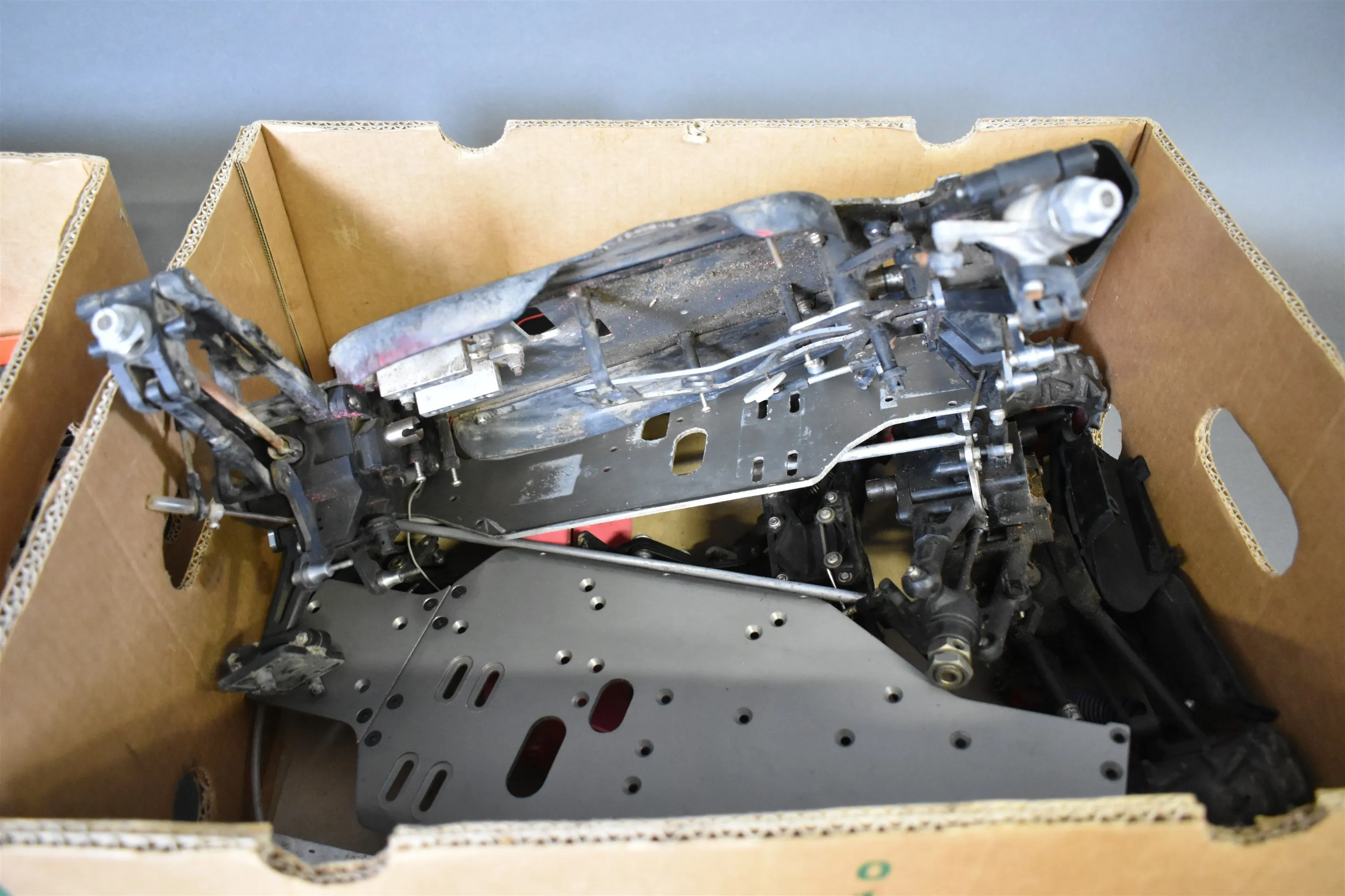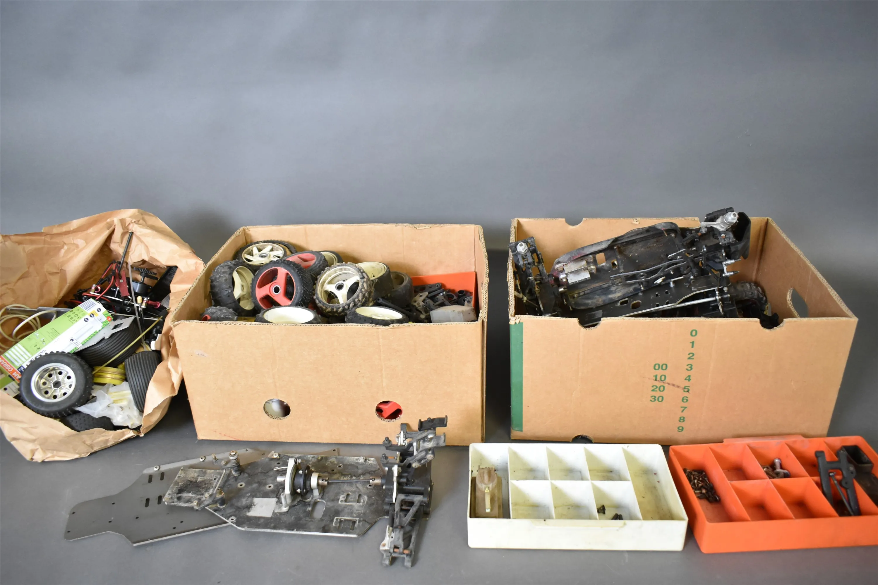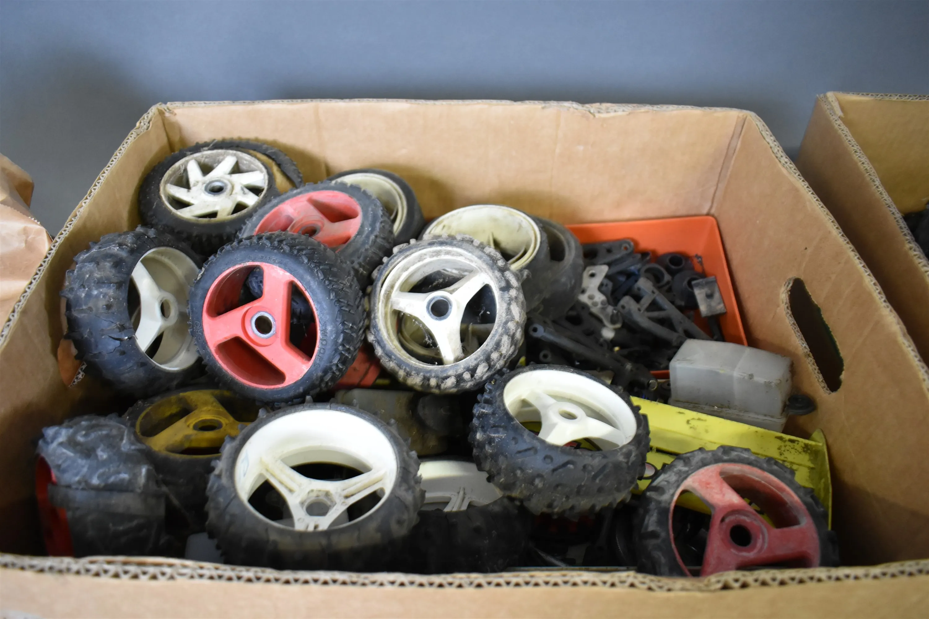 13514. Delar till radiostyrda bilar, 3 lådor, längd på låda 50 cm
