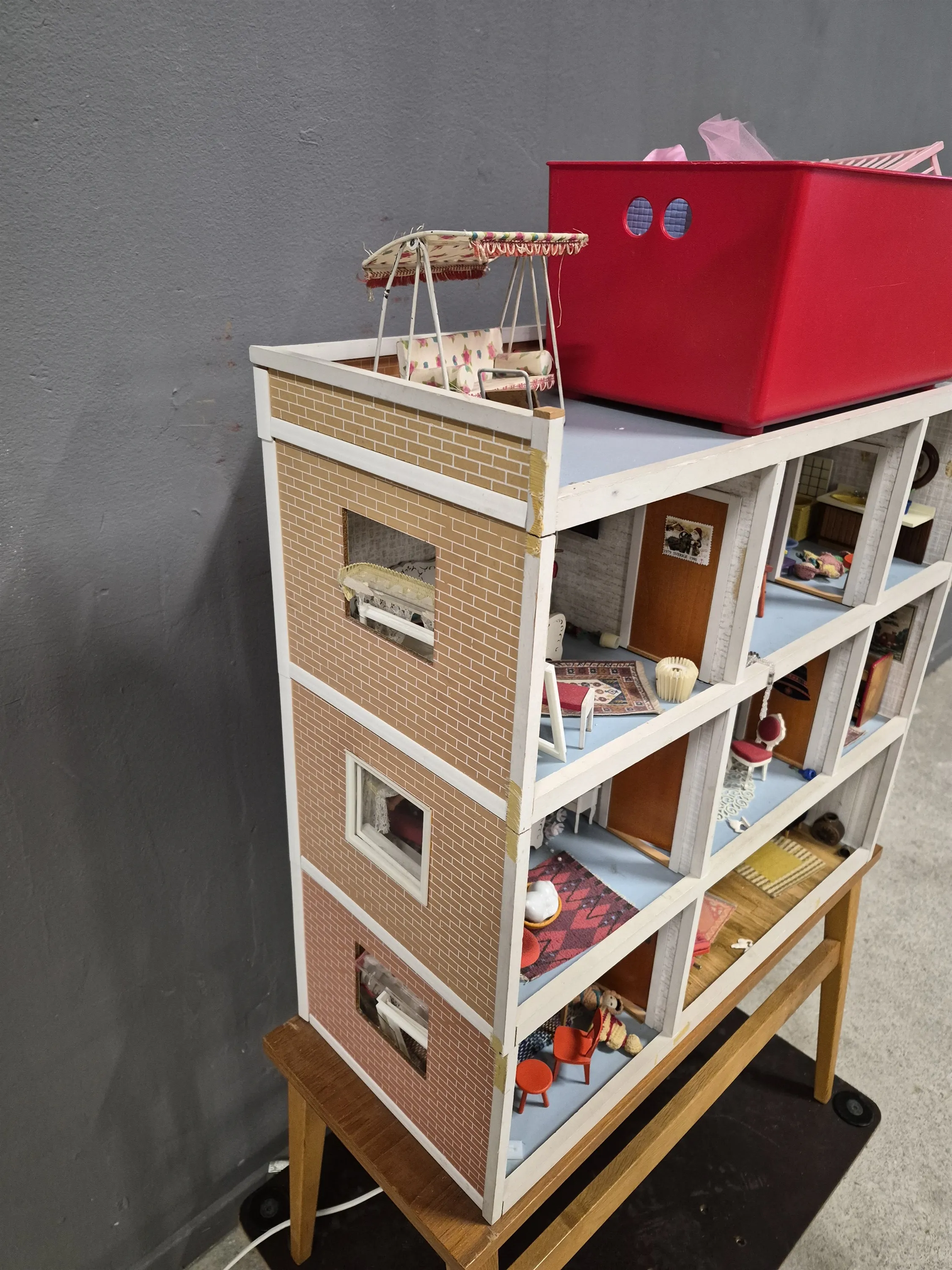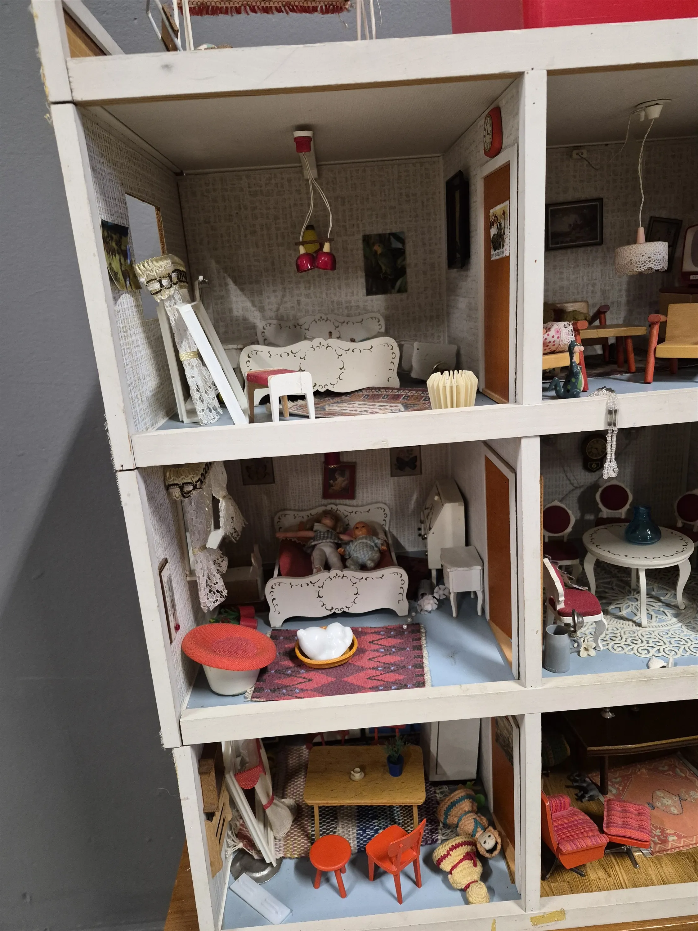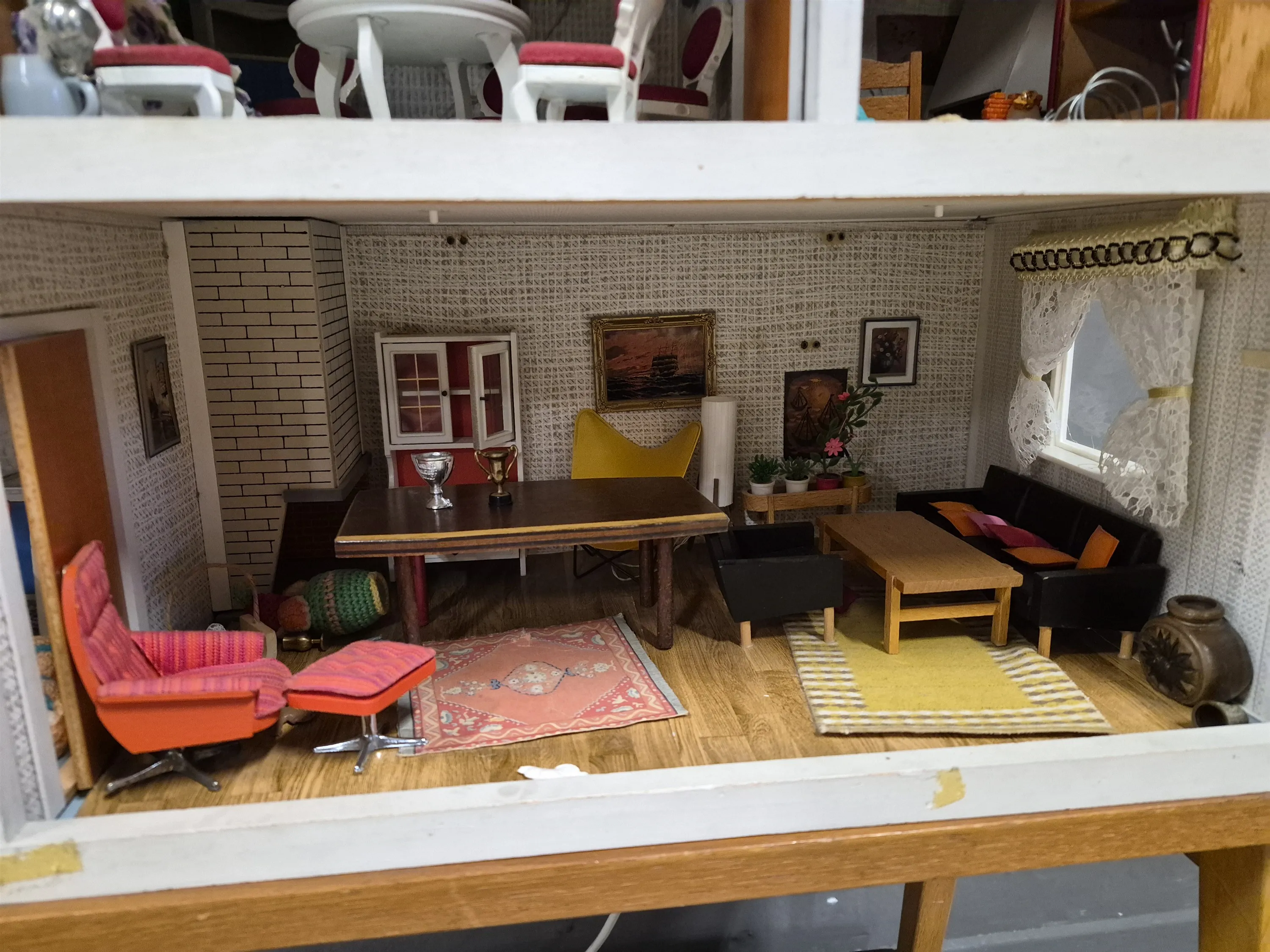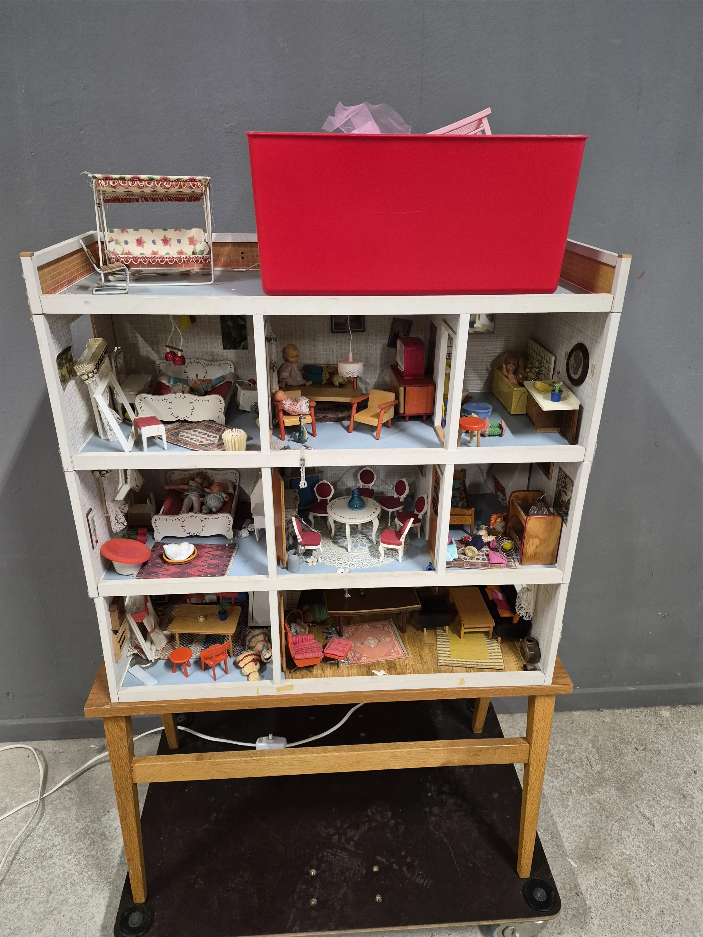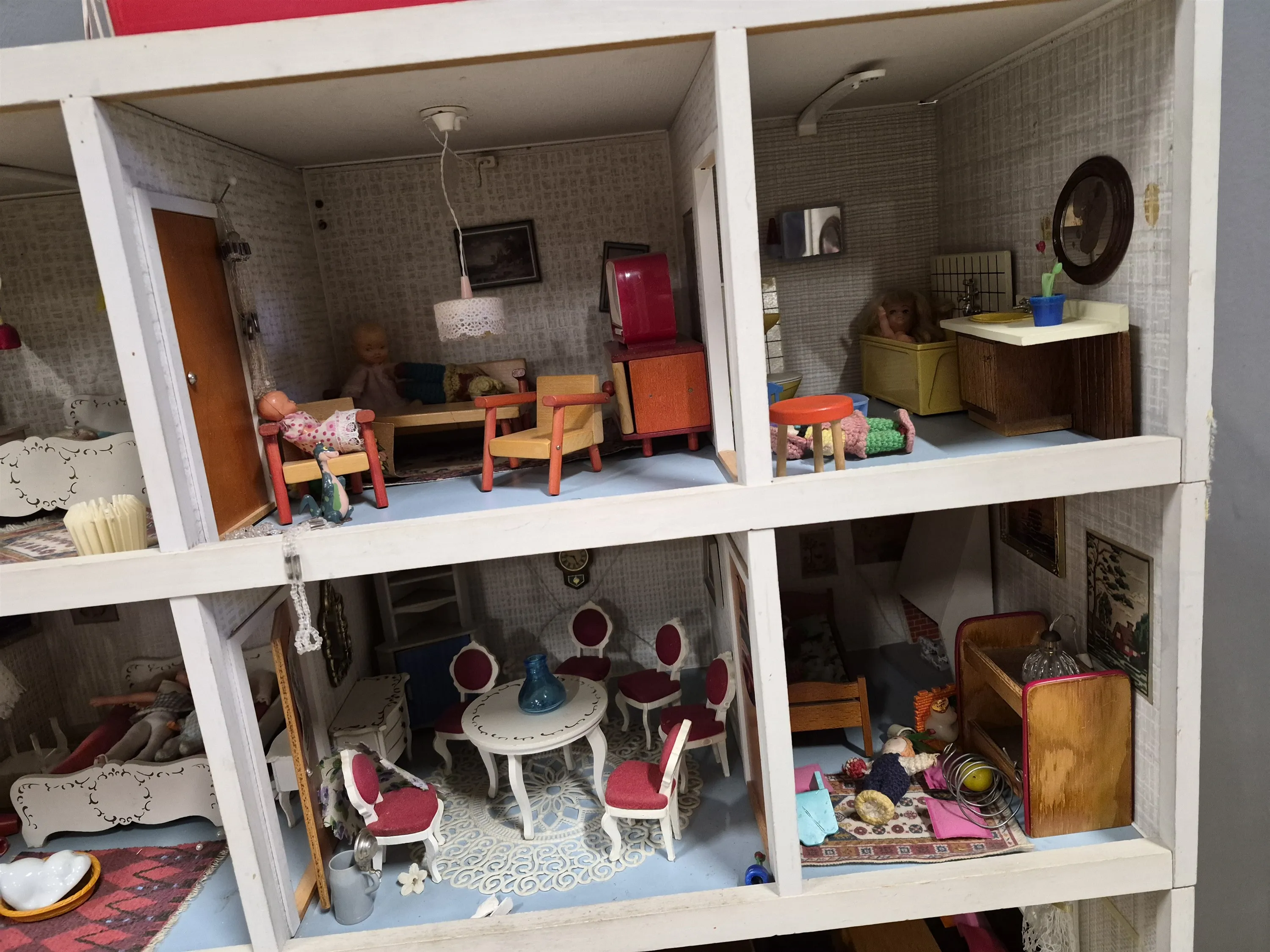 18980. Dockskåp Lundby med möbler, dockor och tillbehör, på bord, längd på hus 60 cm, bredd 58 cm