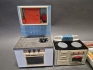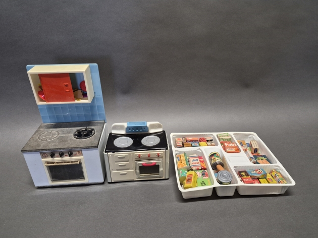 19002. Docktillbehör spisar med ugn och saker till affär, högsta höjd 29 cm