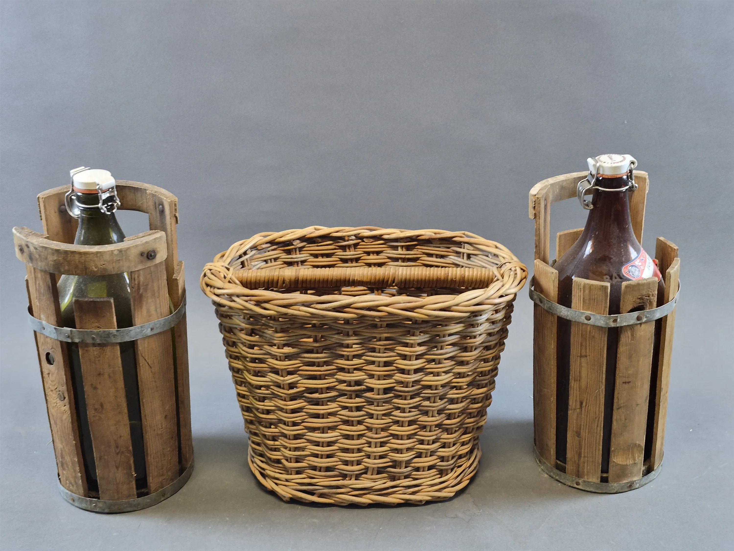 19767. Drickaflaskor 2 st & korg, högsta 48 cm