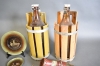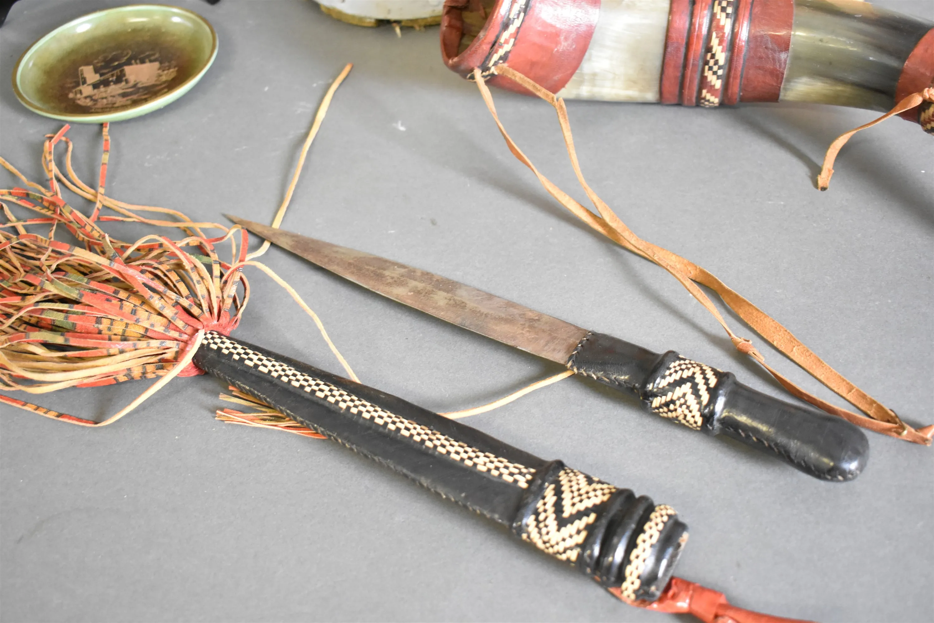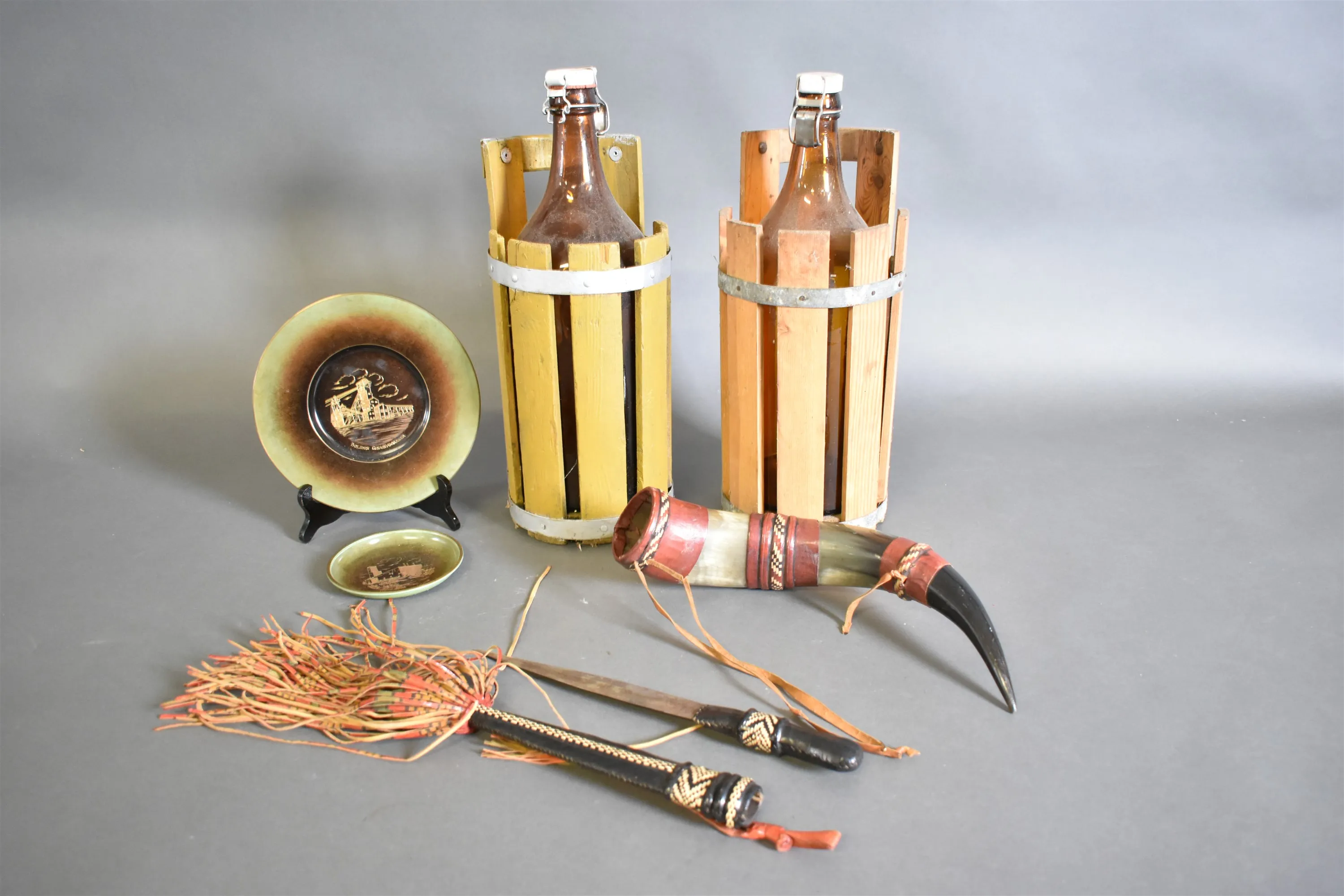 14277. Drickaflaskor i ställ 2 st, kniv och metallfat, högsta höjd 49 cm