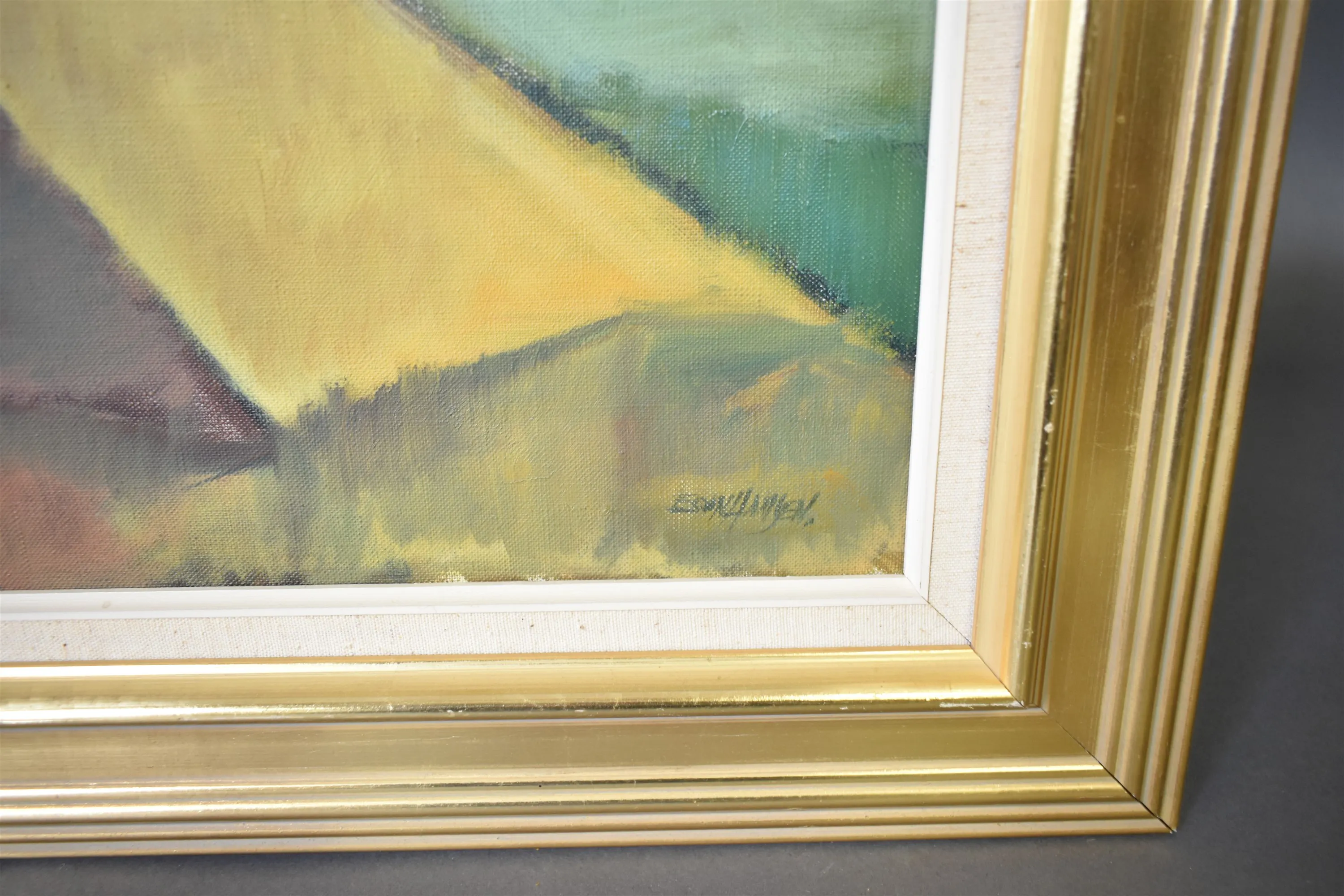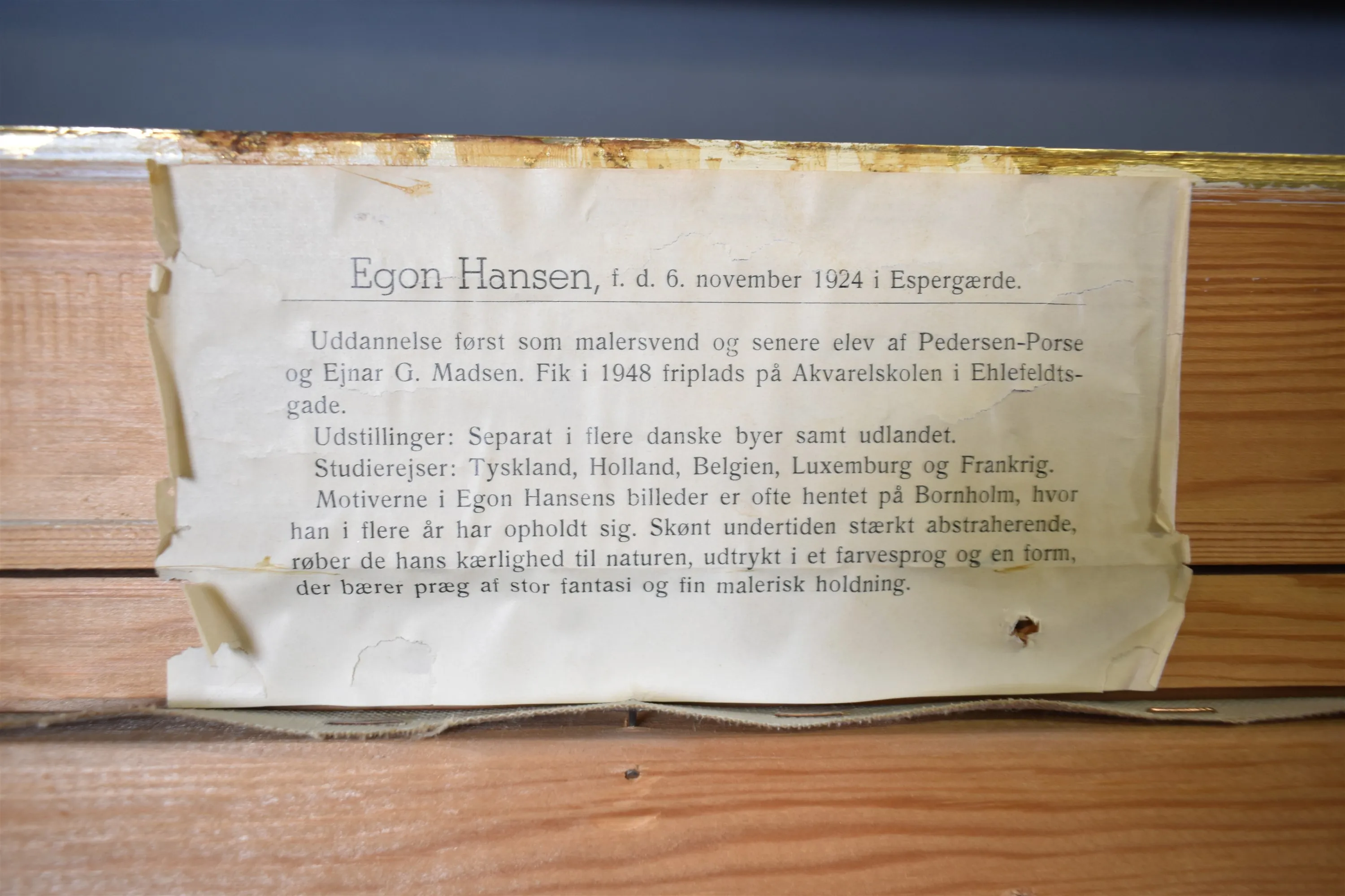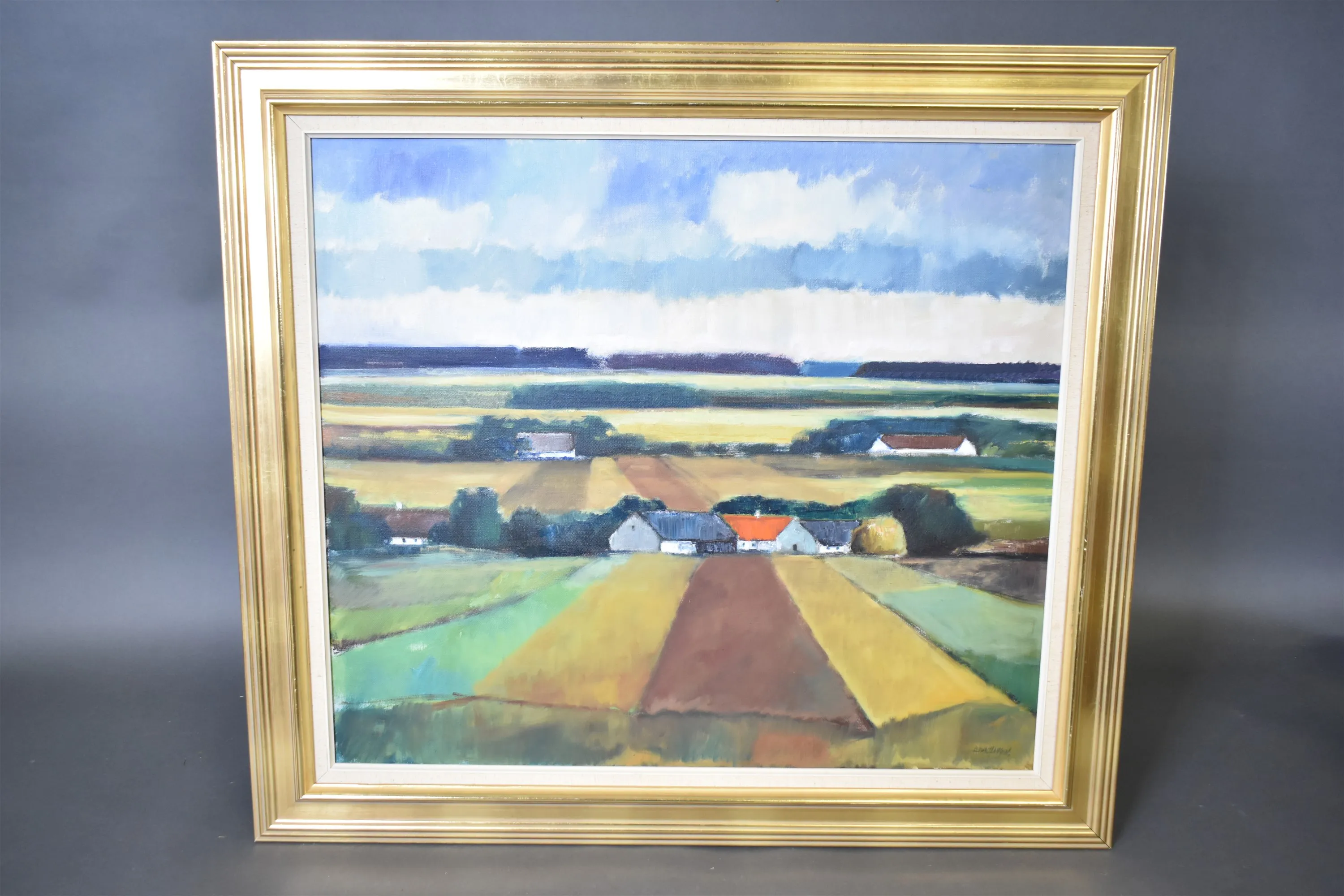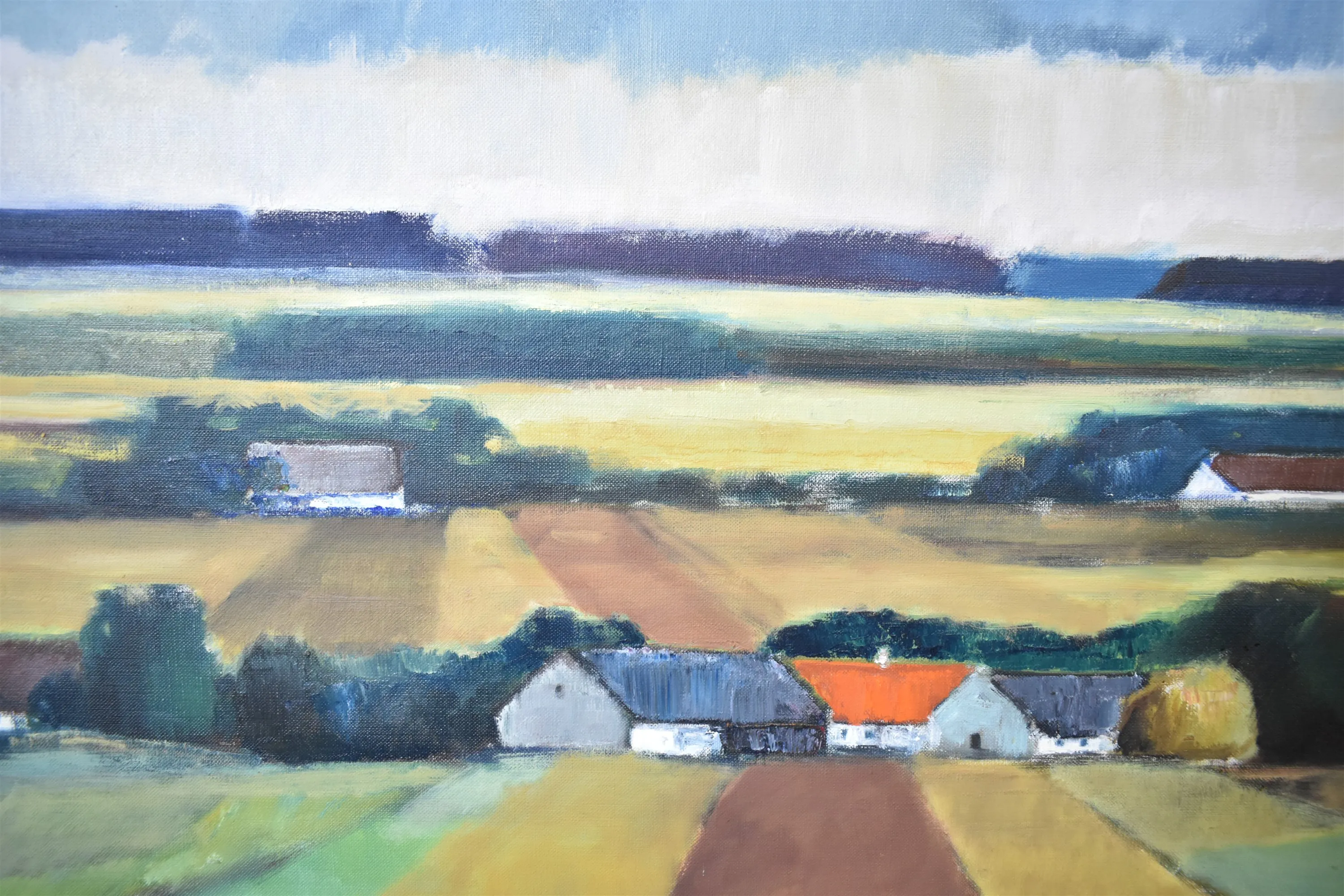 12642. Egon Hansen olja på duk, "Gårdar på slätten", mått 93 x 82 cm