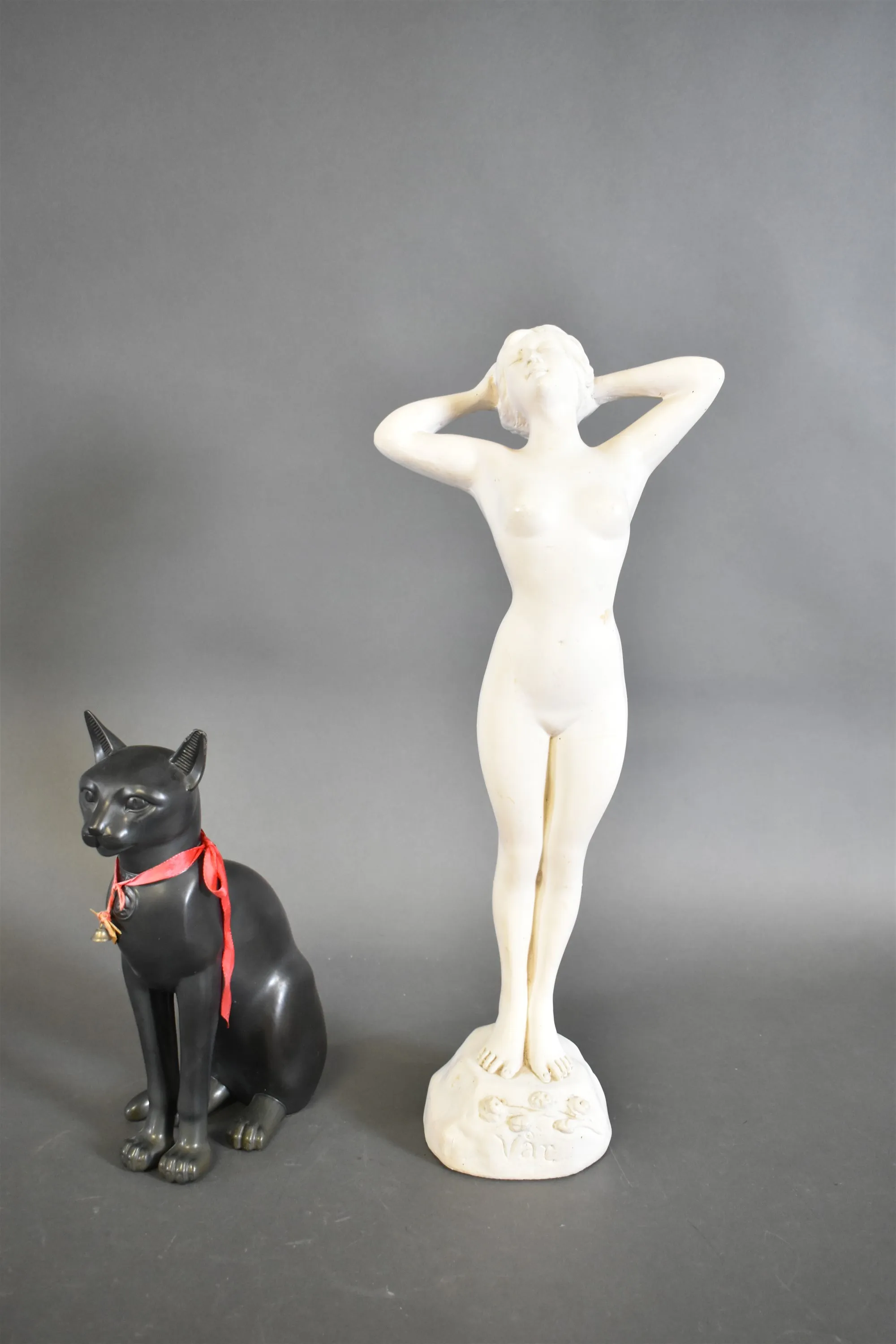 16455. Figuriner 2 st, kvinna i gips och katt Lladro, högsta höjd 61 cm
