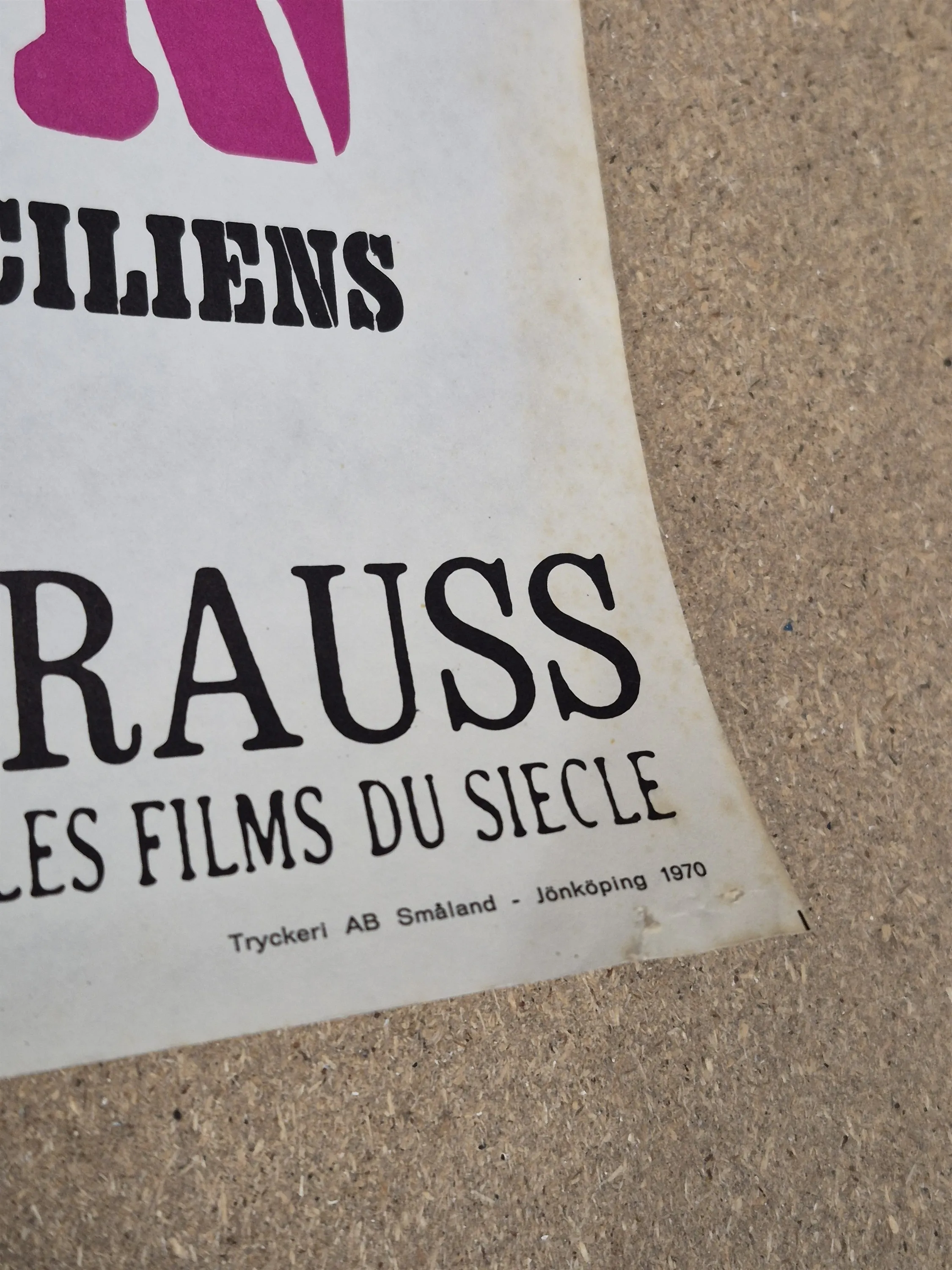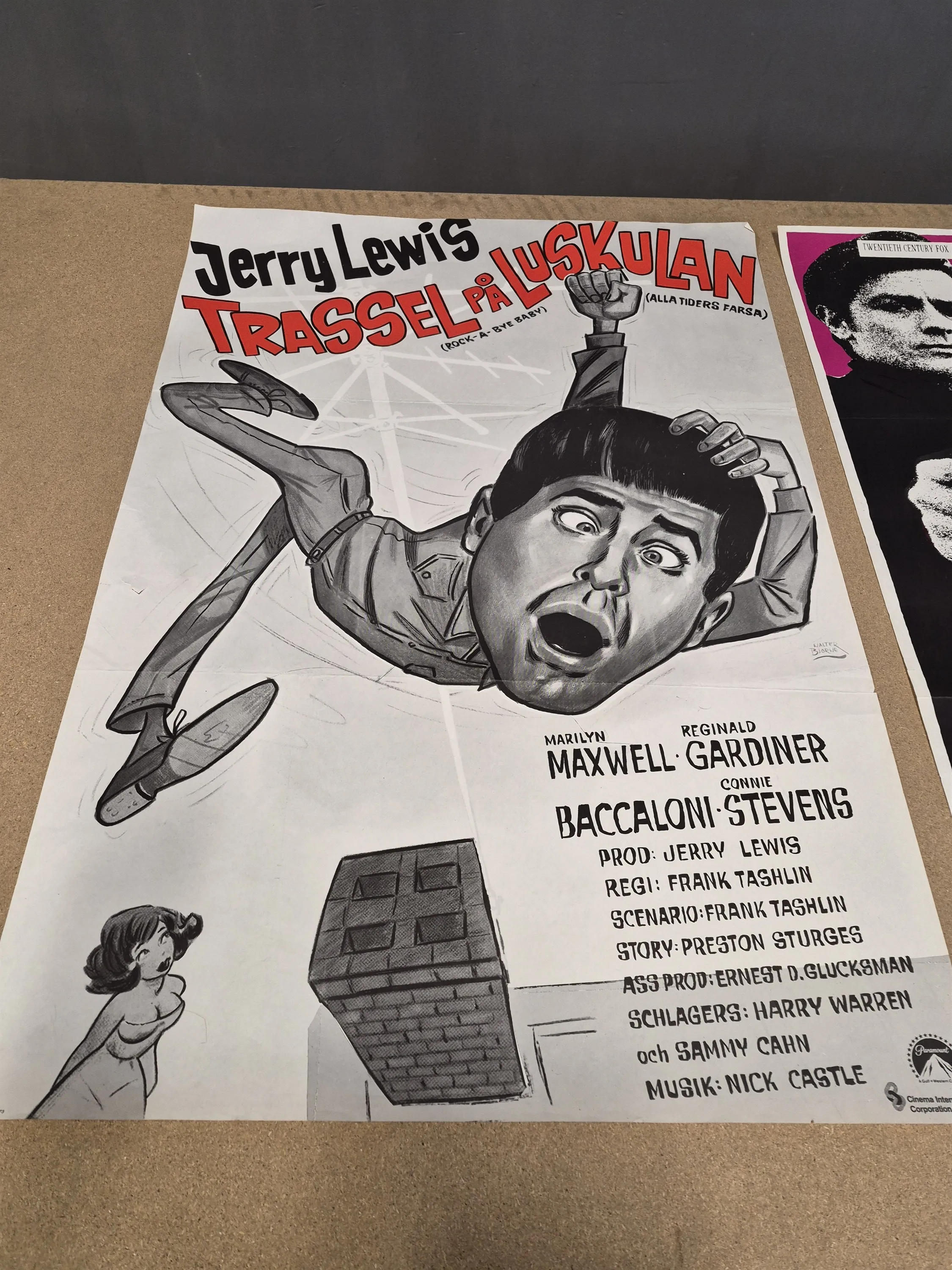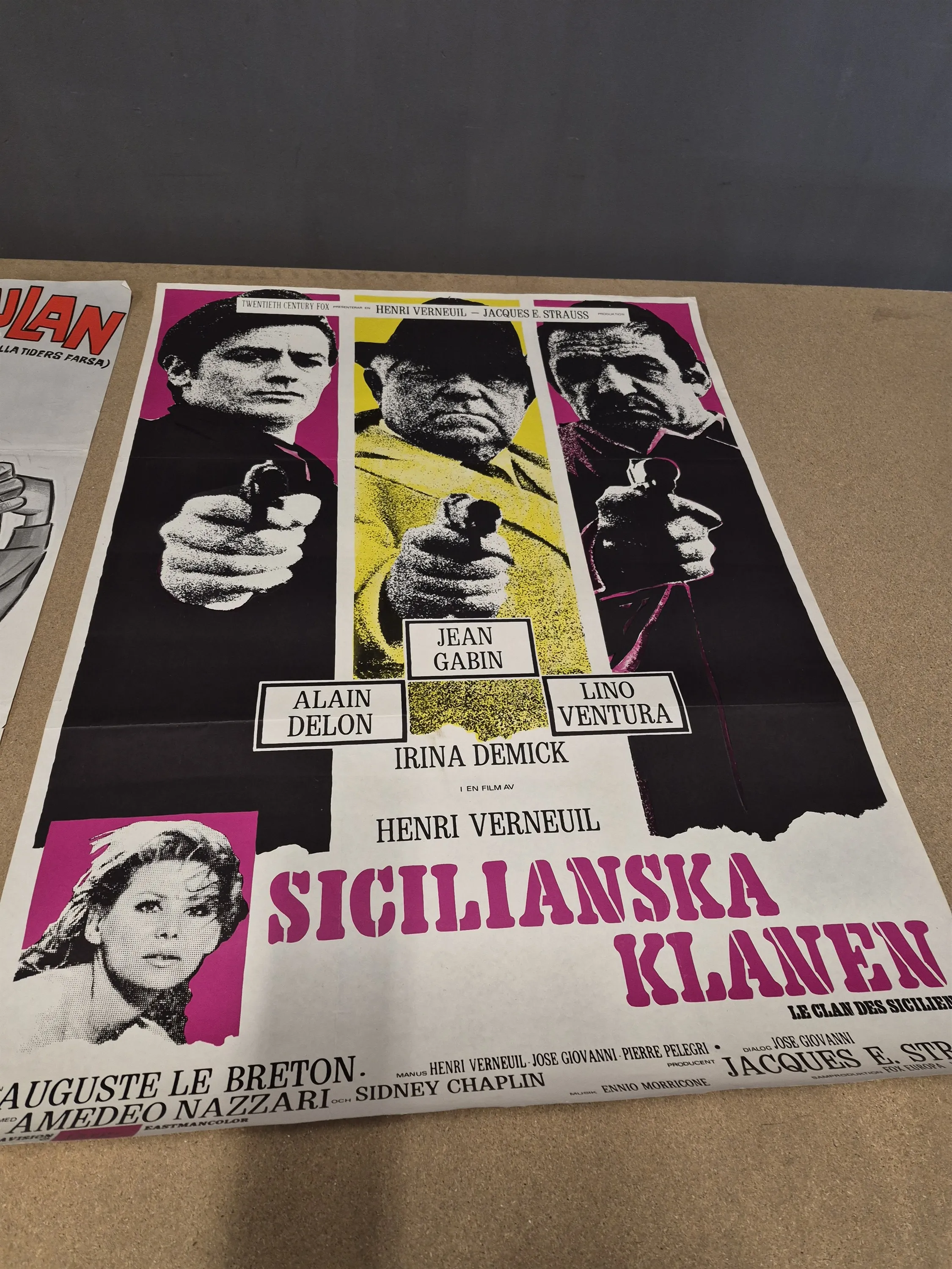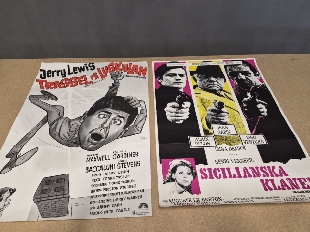 19942. Filmposters 2 st; Trassel på luskulan Jerry Lewis och Den sicilianska klanen, veck och någon reva finns, mått 100x70 cm