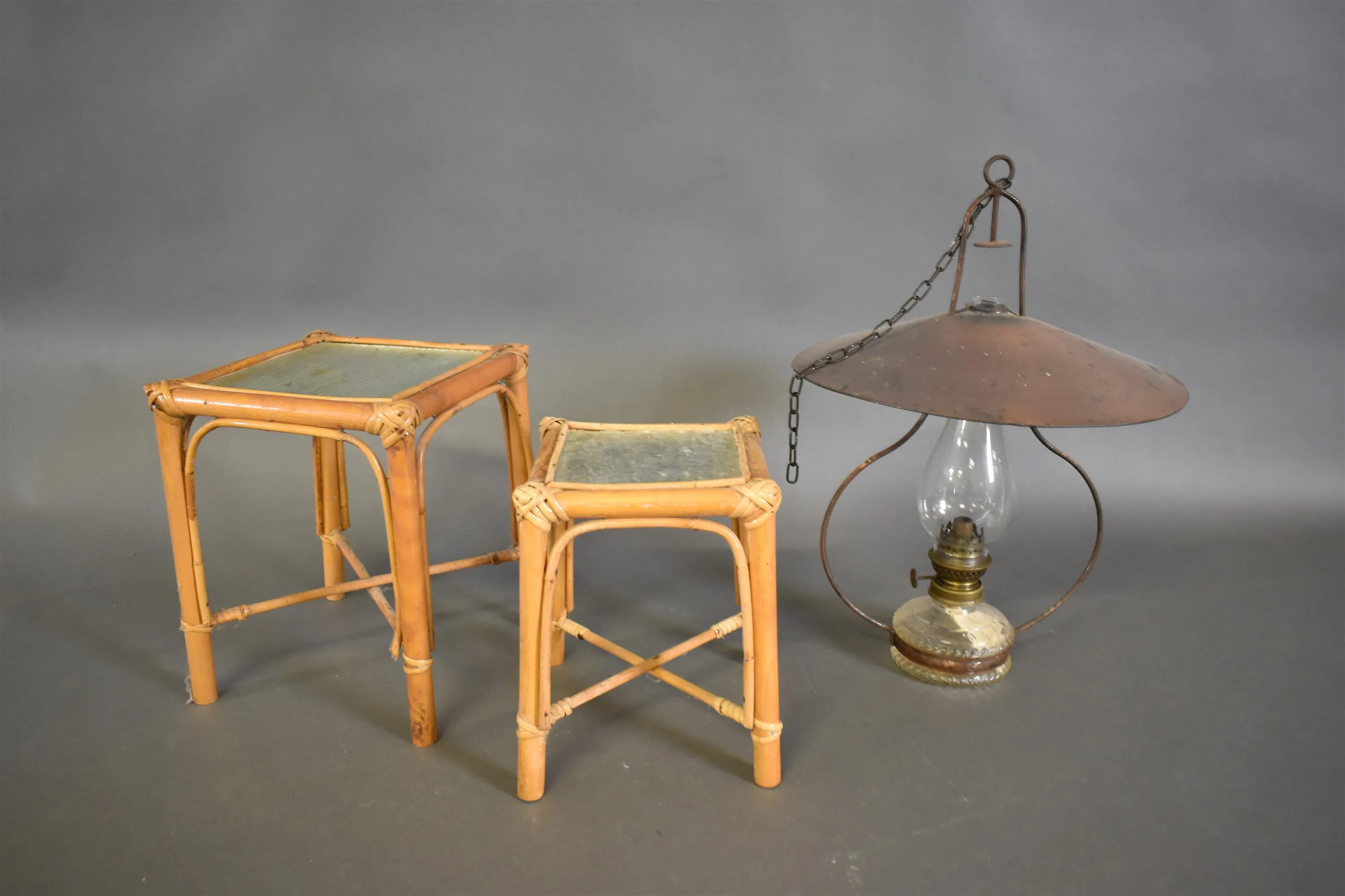 15220. Fotogenlampa ampelmodell och piedestaler 2 st, högsta höjd 51 cm
