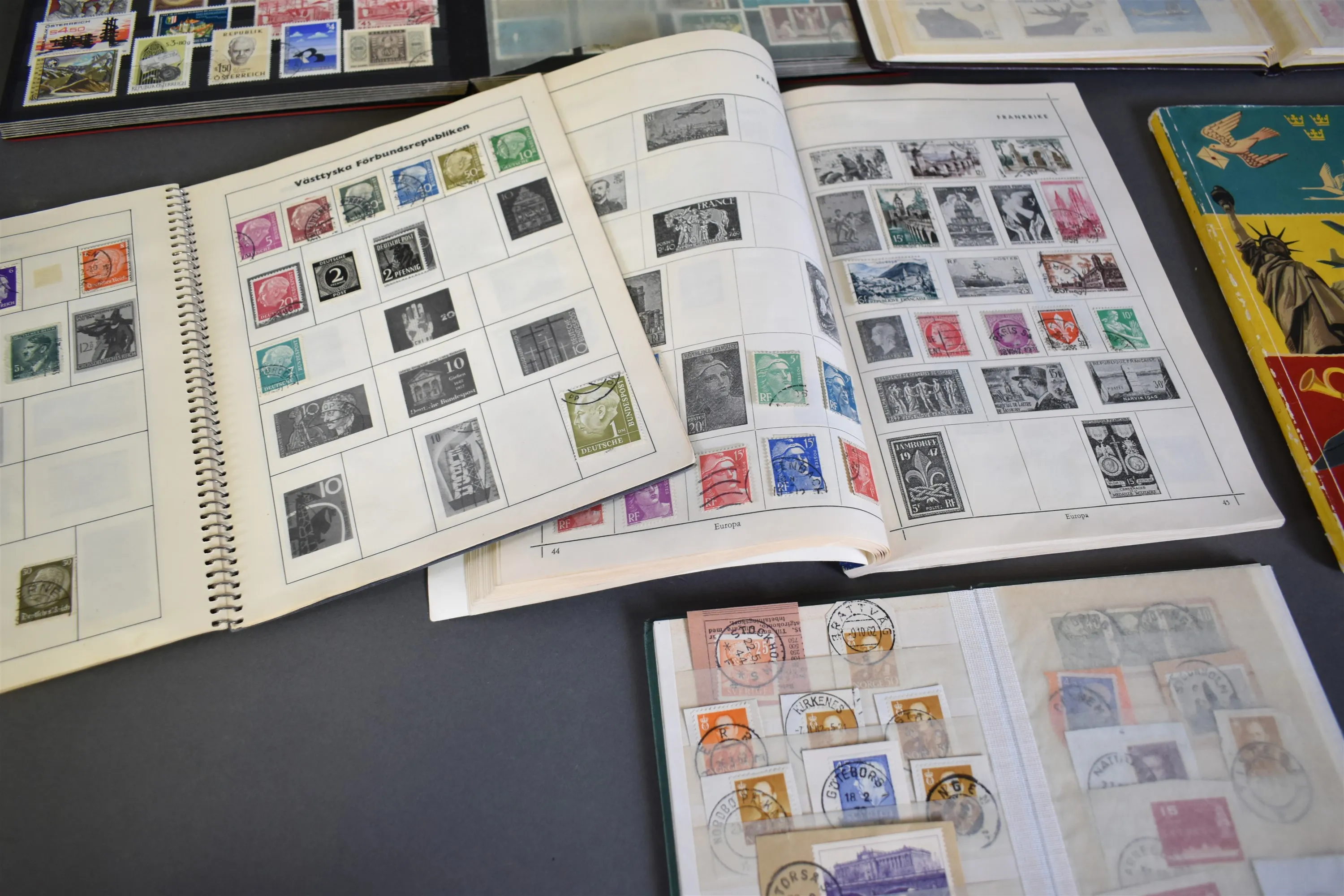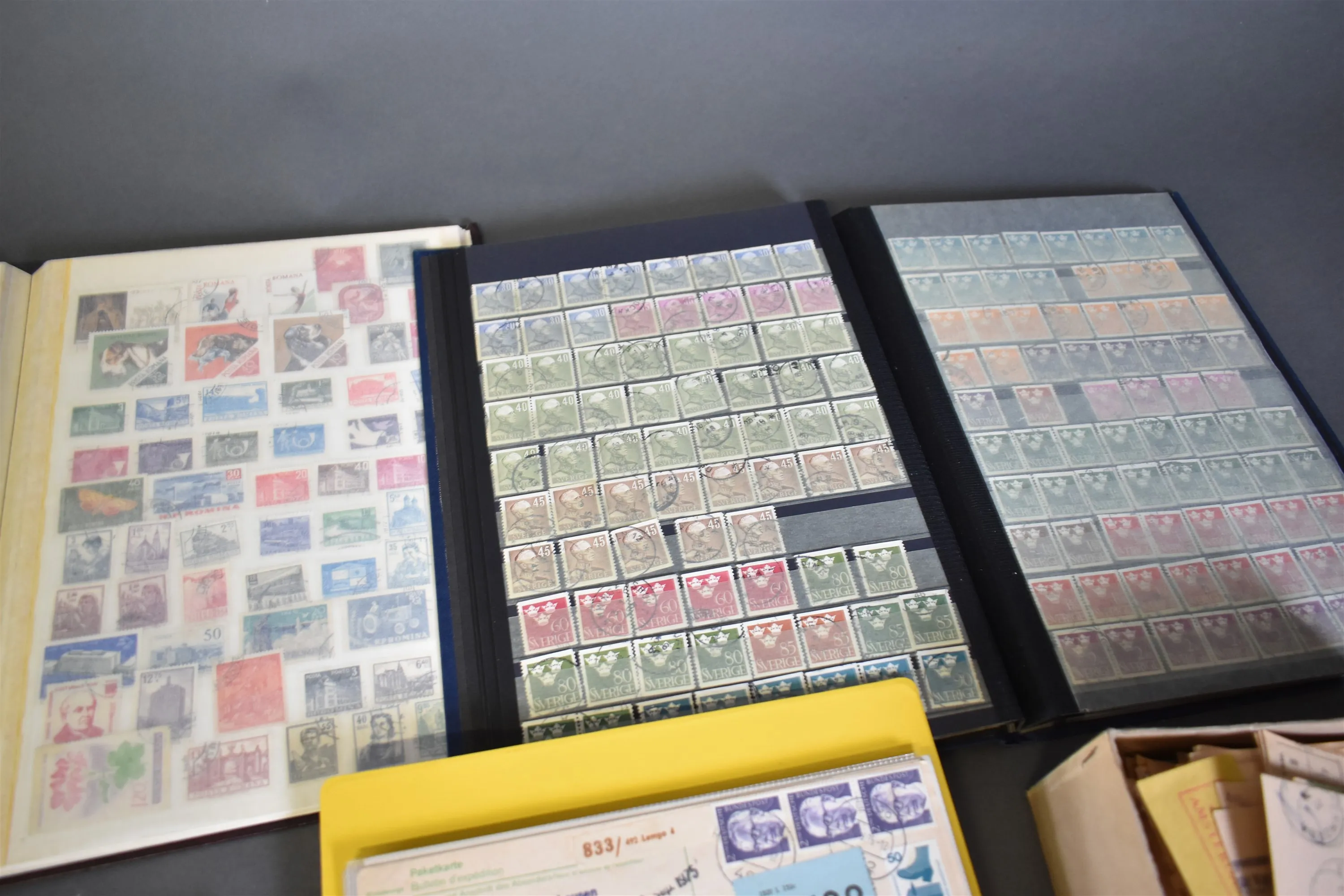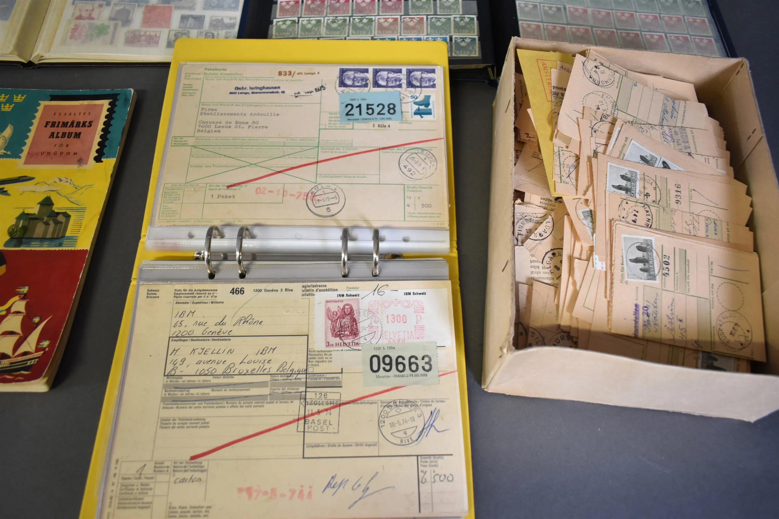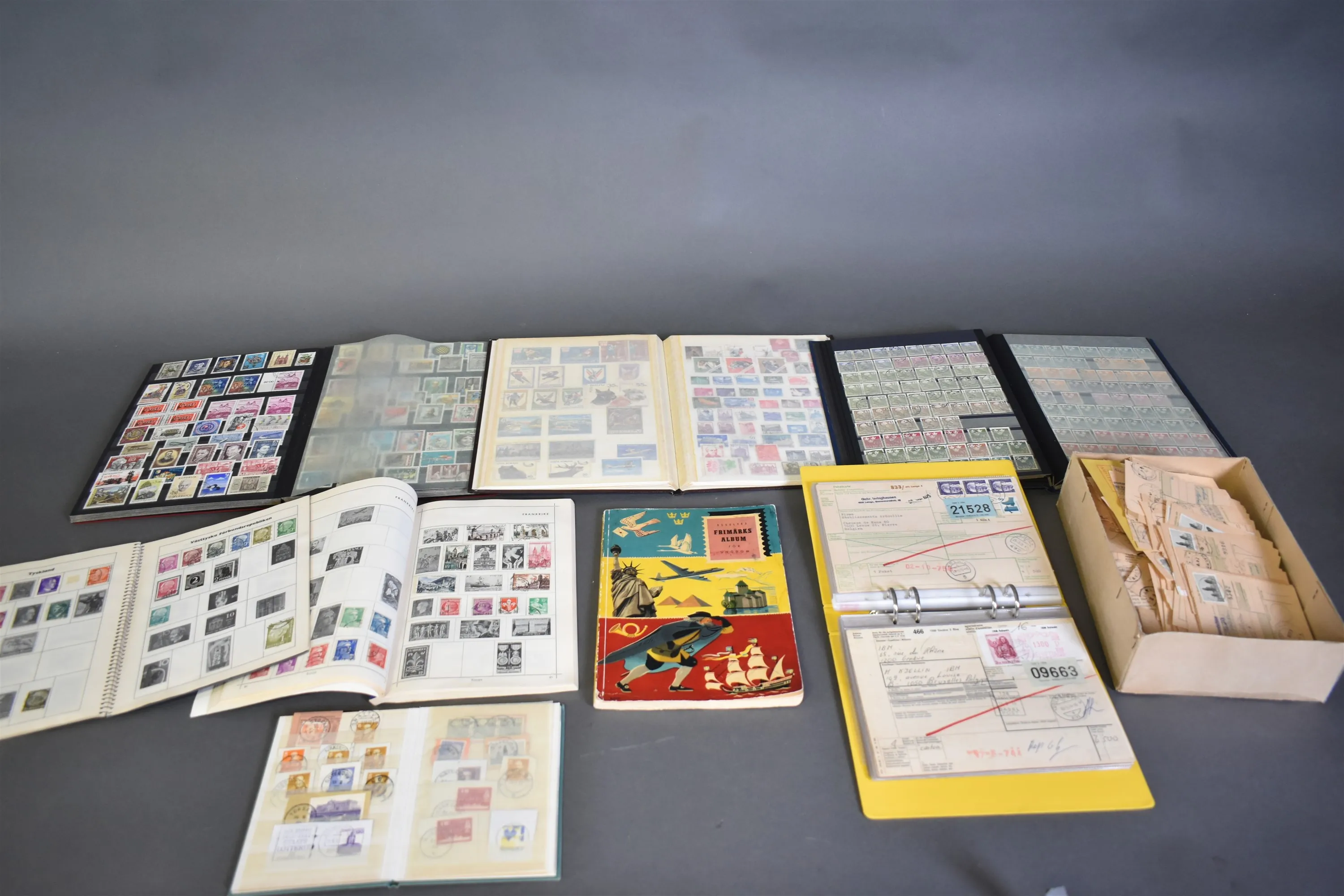 4482. Frimärkesalbum 7 st varav 1 album tomt och frankerade paketsedlar