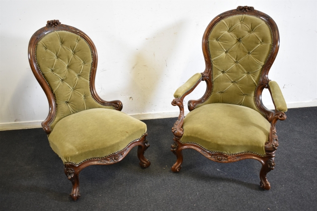 15427. Fåtöljer 2 st för dam & herr, England, slutet 1800-tal, höjd 96 & 100 cm