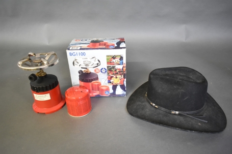 7635. Gasolkök i förpackning och cowboyhatt Wrangler Riata, högsta höjd 21 cm