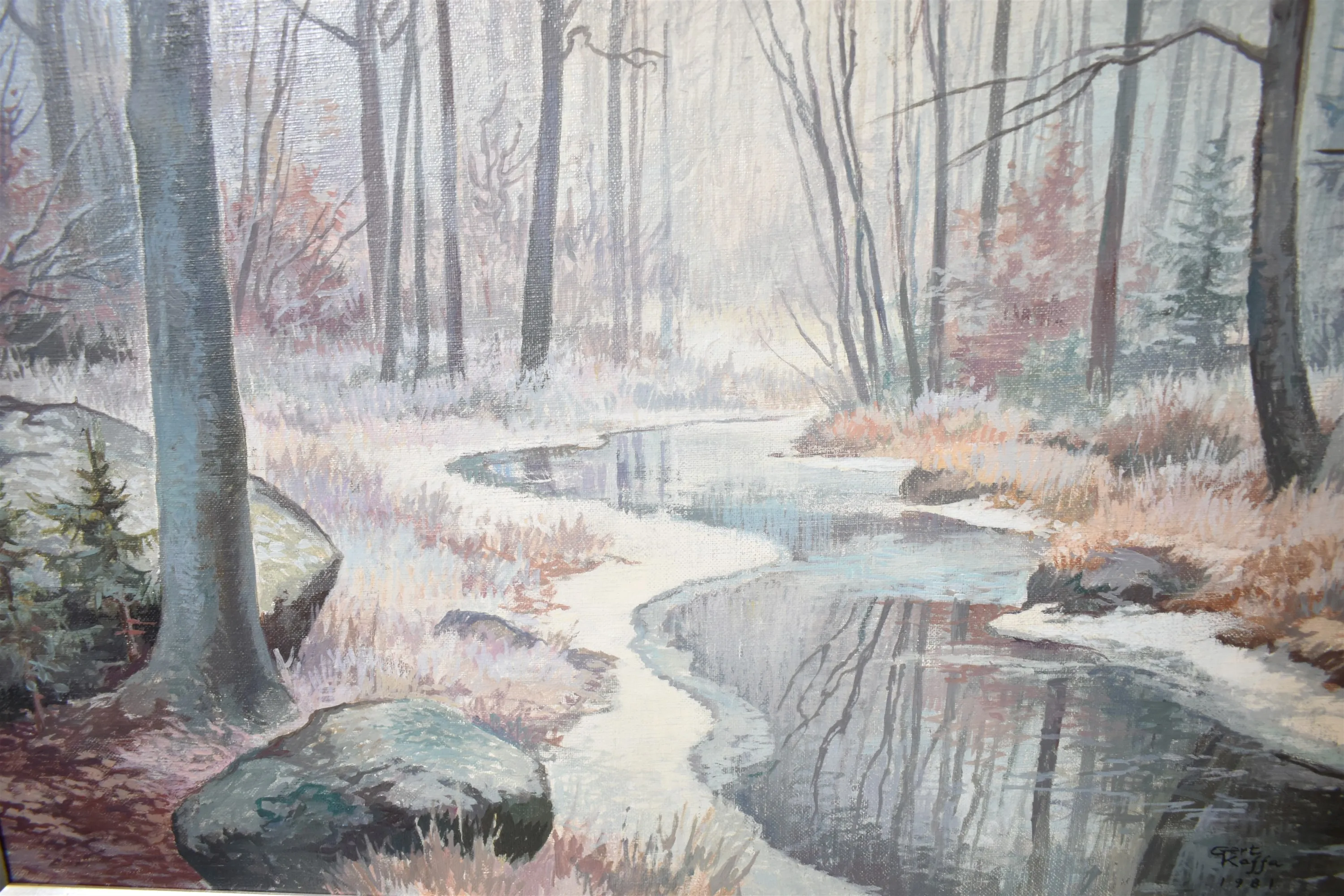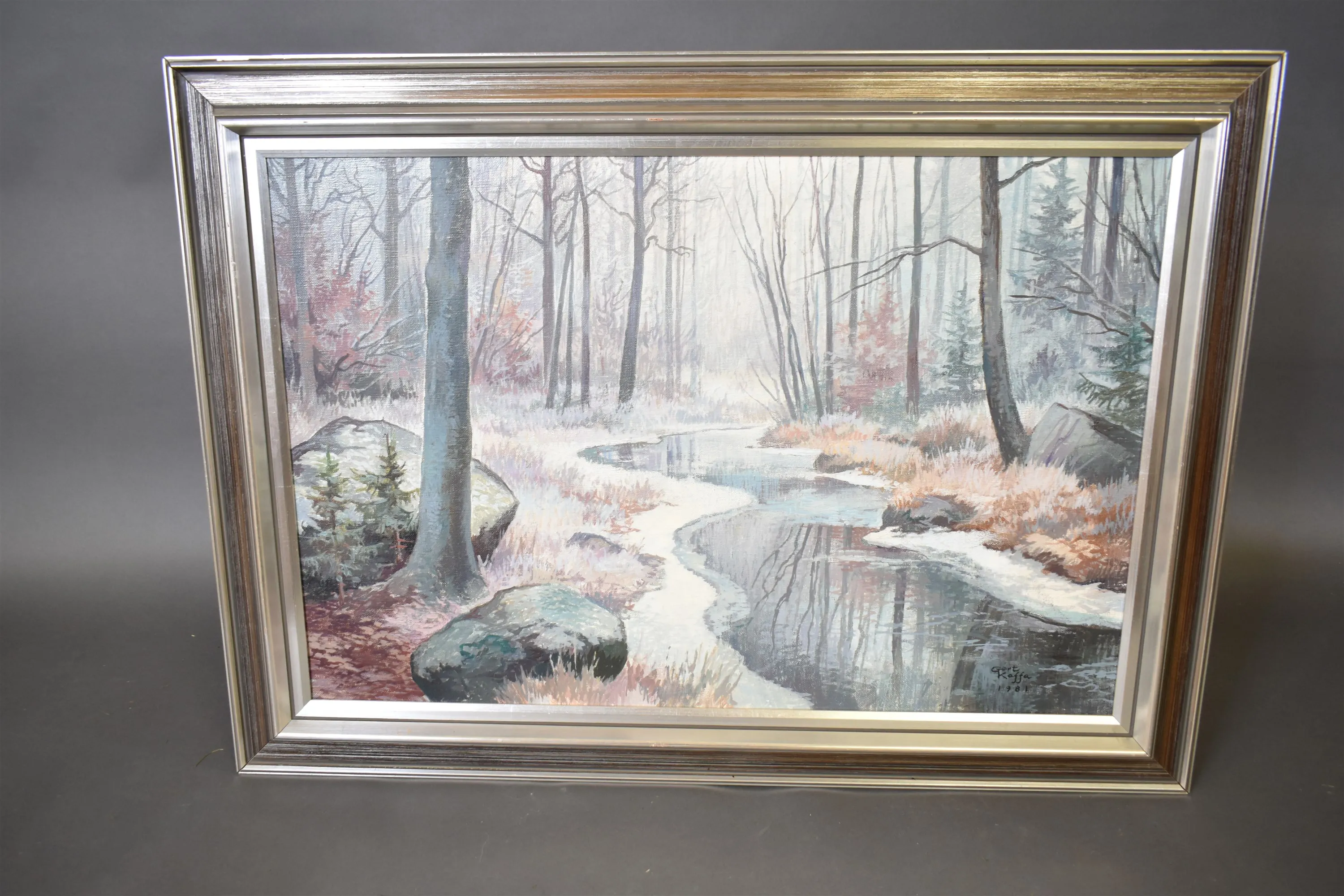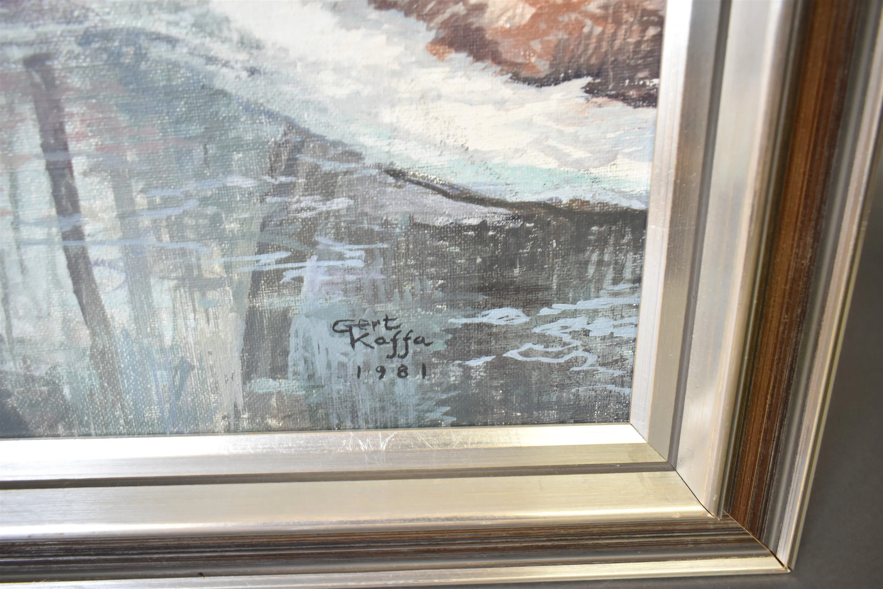 12632. Gert Kaffa olja på duk 1981 "Vinterbäck", mått 65 x 91 cm