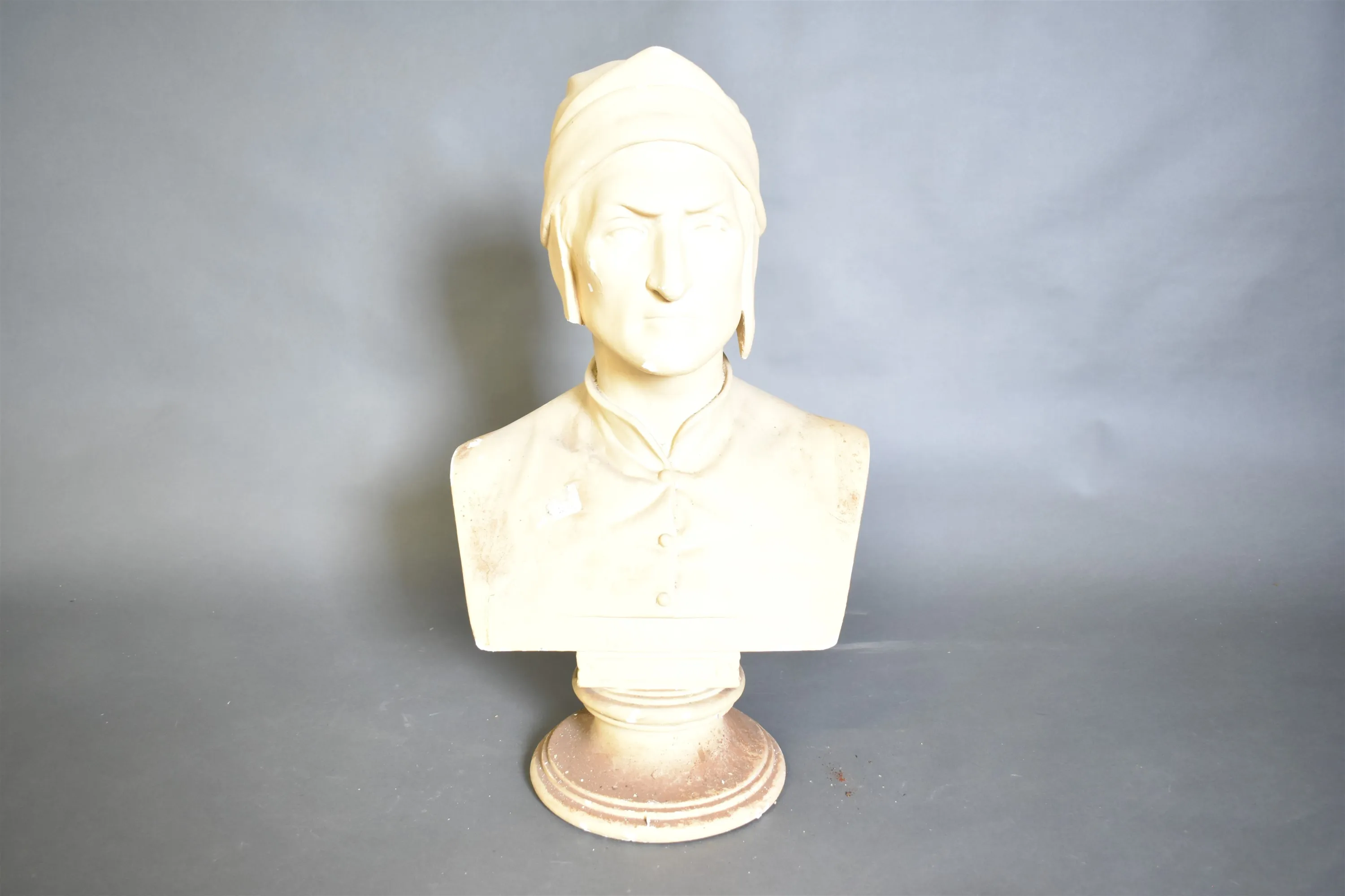 6025. Gipsbyst, Dante, höjd 67 cm, färgskav finns