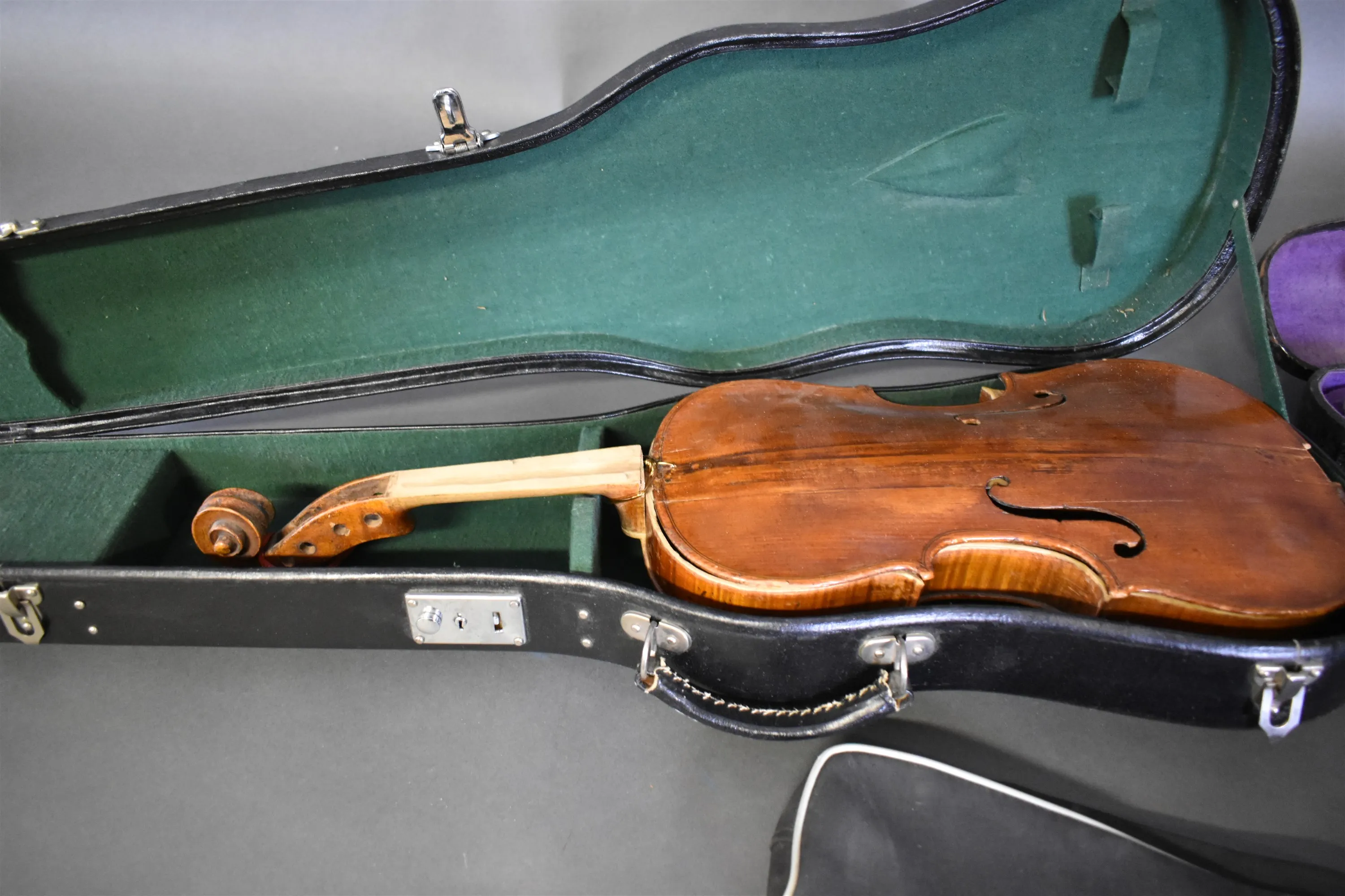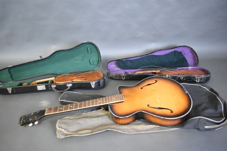7353. Gitarr och fioler i låda 2 st, längsta mått 100 cm