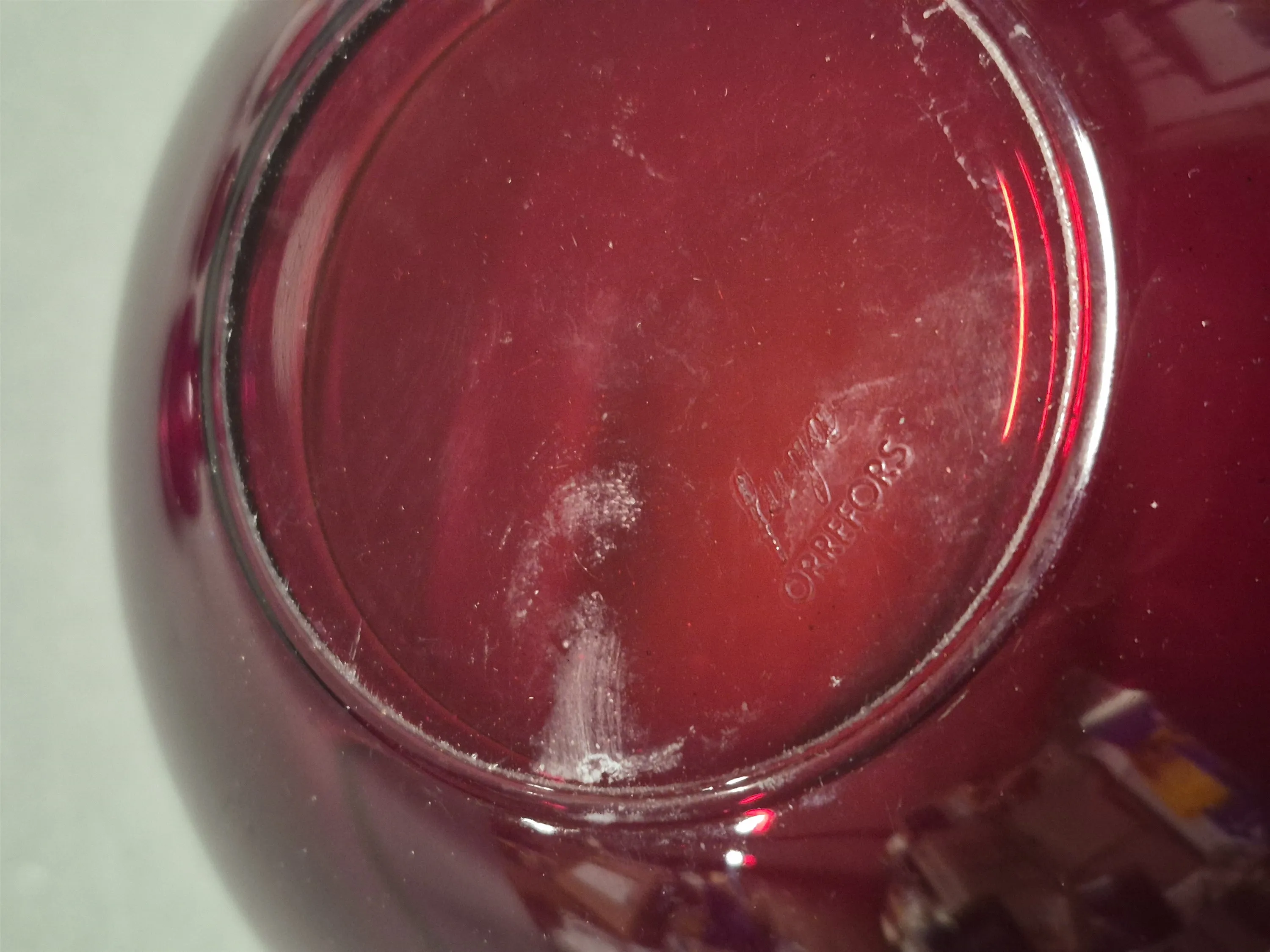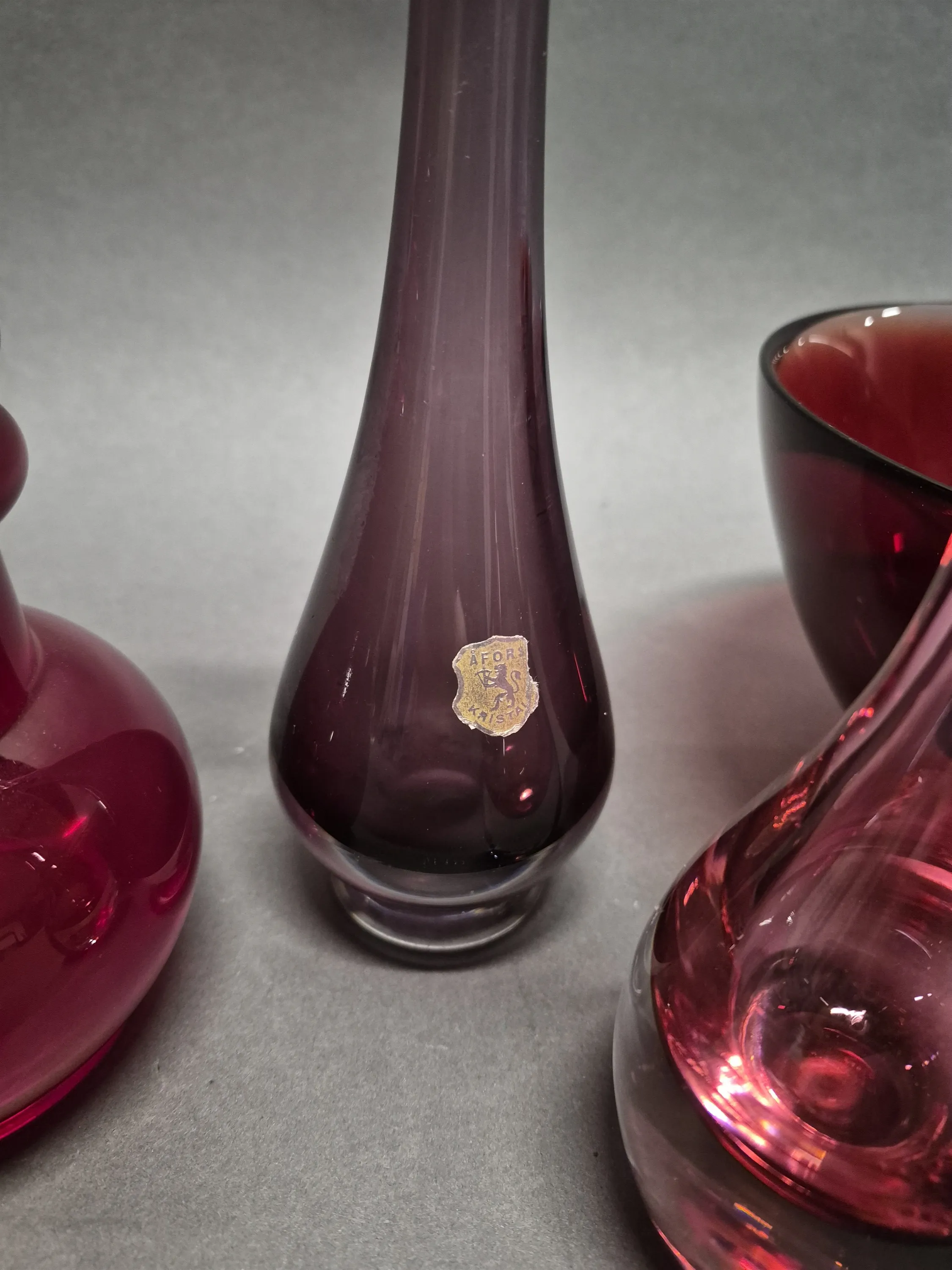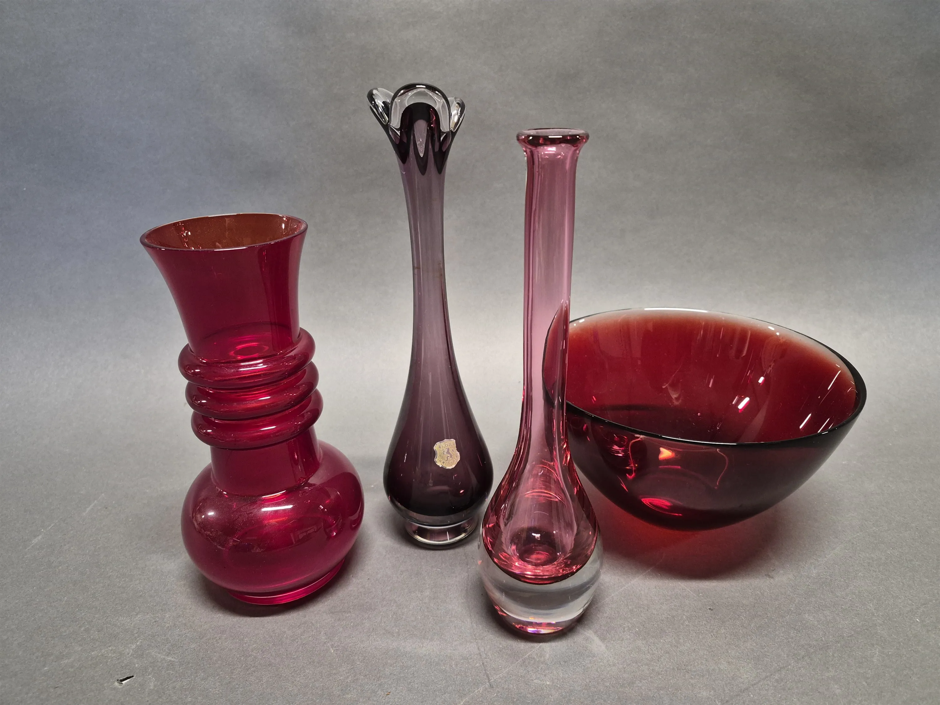 18066. Glas 4 delar bla vas Åfors "Rubin 2095" och skål Orrefors "Fuga", högsta höjd 27 cm