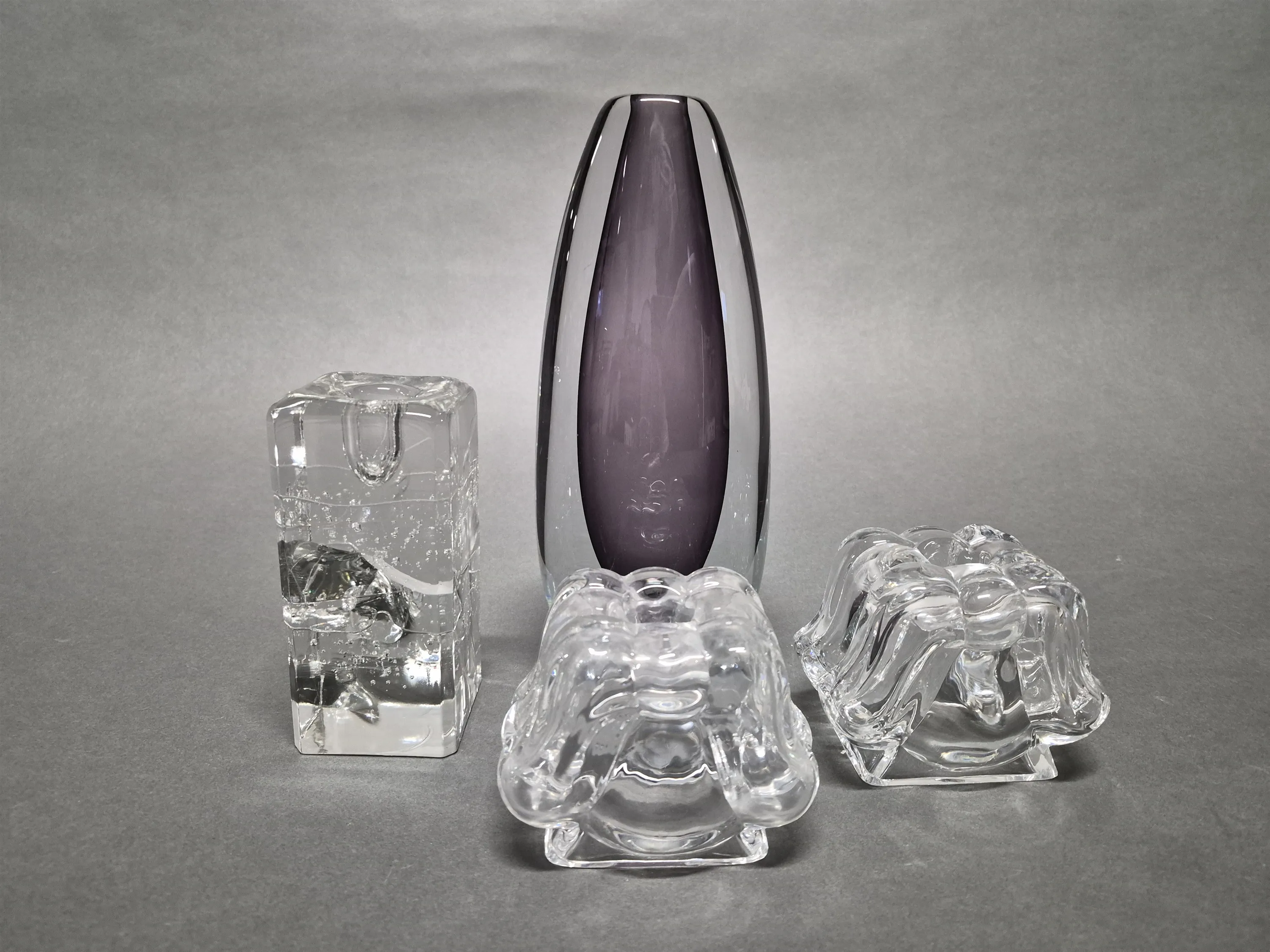 18094. Glas 4 delar bla vas Gunnar Nylund Strömbergshyttan, osignerad och ljusstakar Ängel Design Lars Hellsten, signerade Orrefors 4304-321, högsta höjd 23 cm