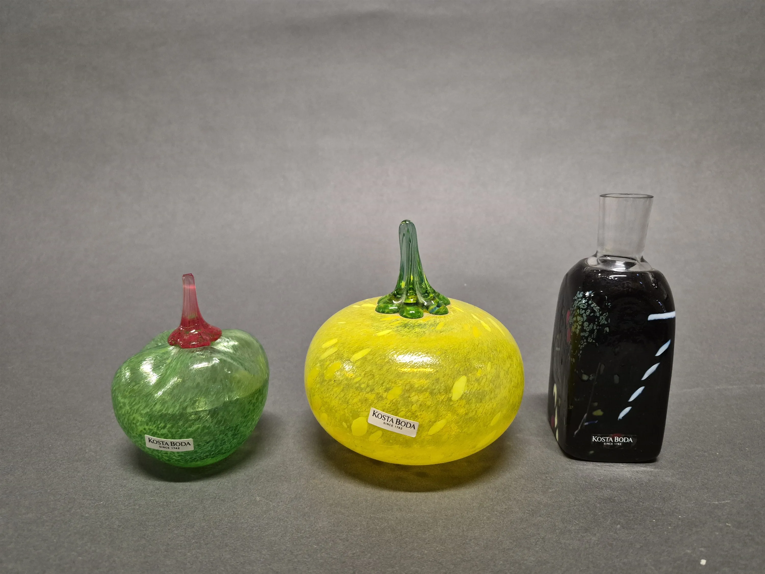 18090. Glas Kosta Boda 3 delar, konstglasfrukter och liten flaska/vas signerad Vallien, högsta höjd 13 cm