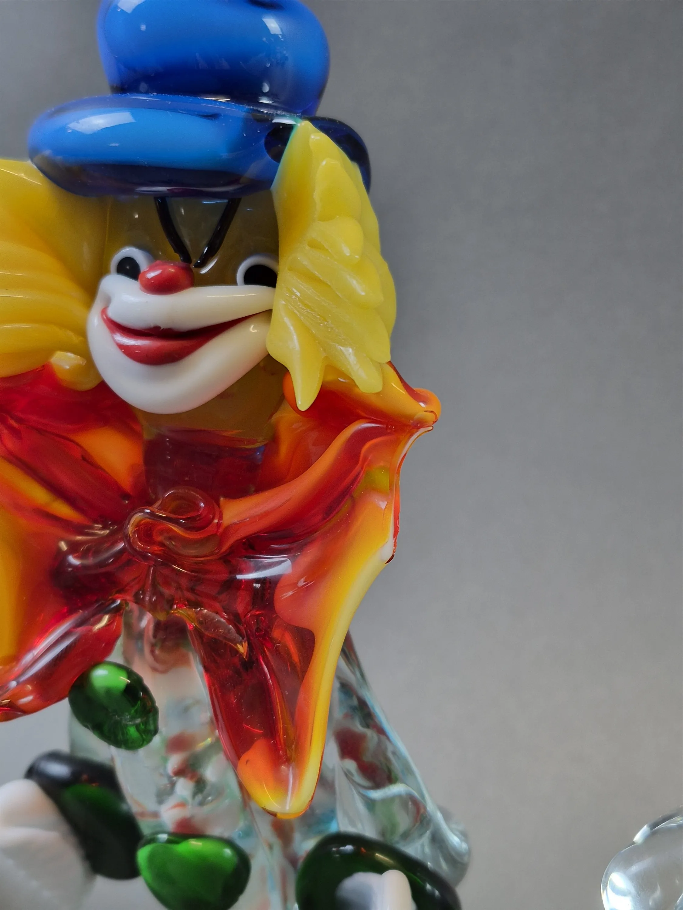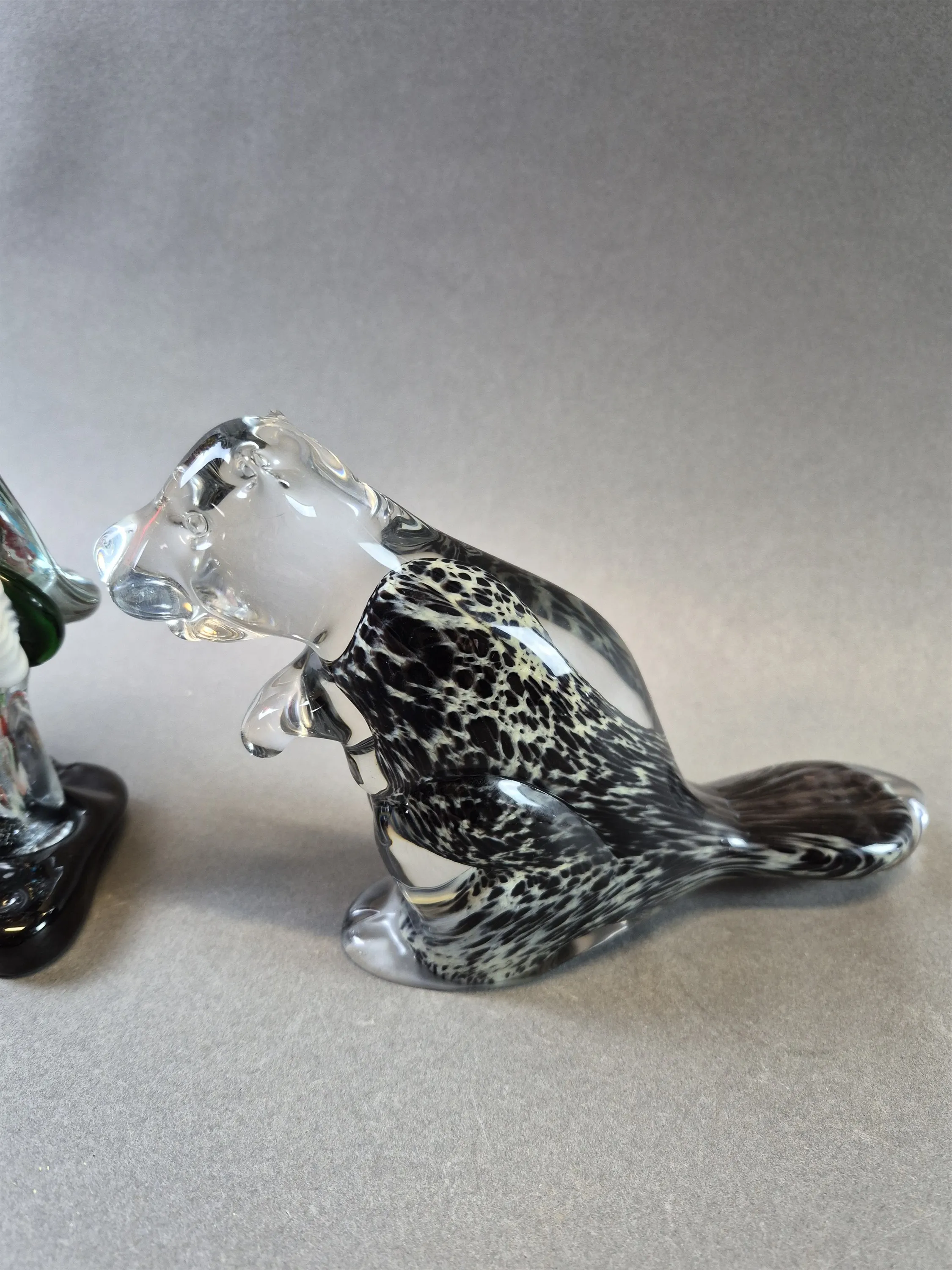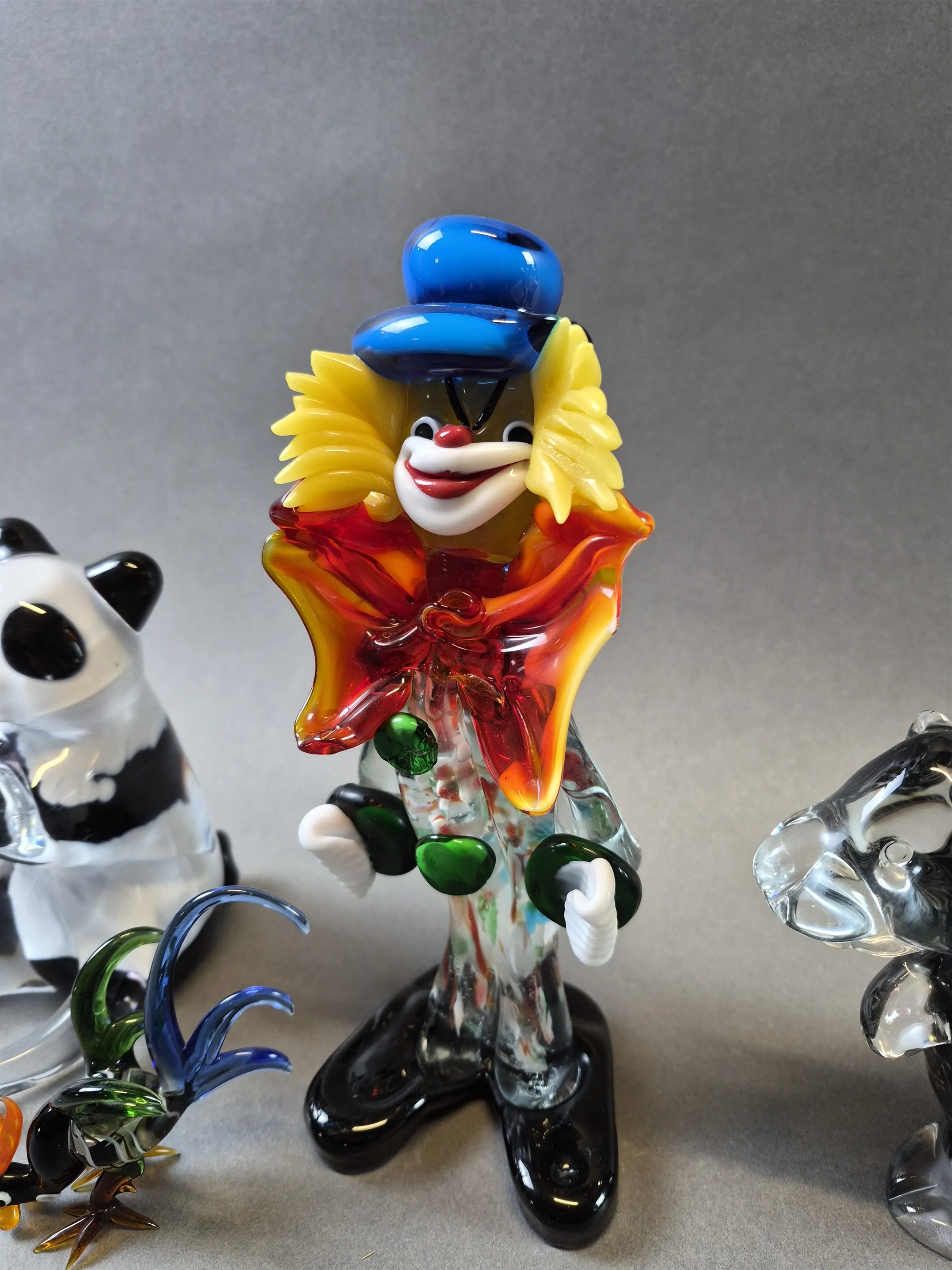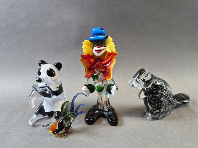 20441. Glaskonst 4 delar bla clown och bäver, skada på clown, högsta höjd 22 cm