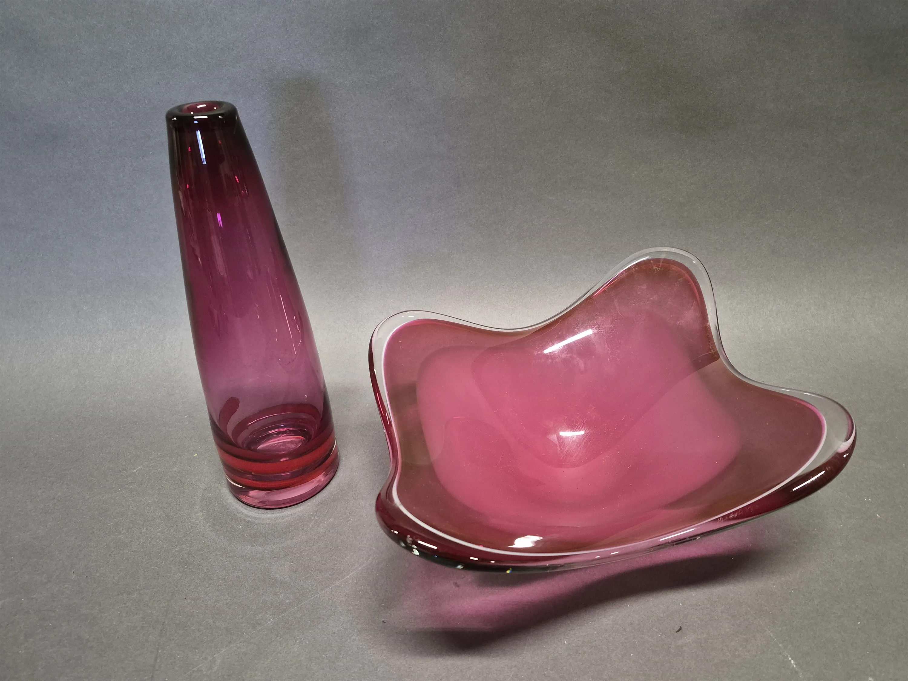18067. Glasvas signerad Berndt (Victor Berndt) och skål Flygfors Coquille Paul Kedelv, högsta höjd 26 cm