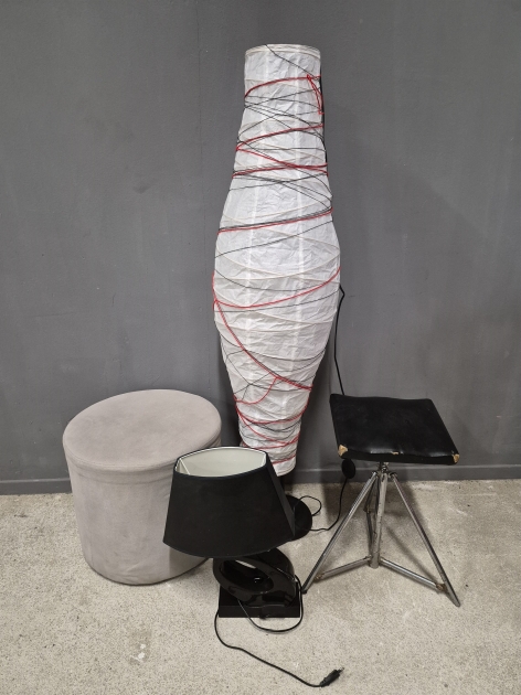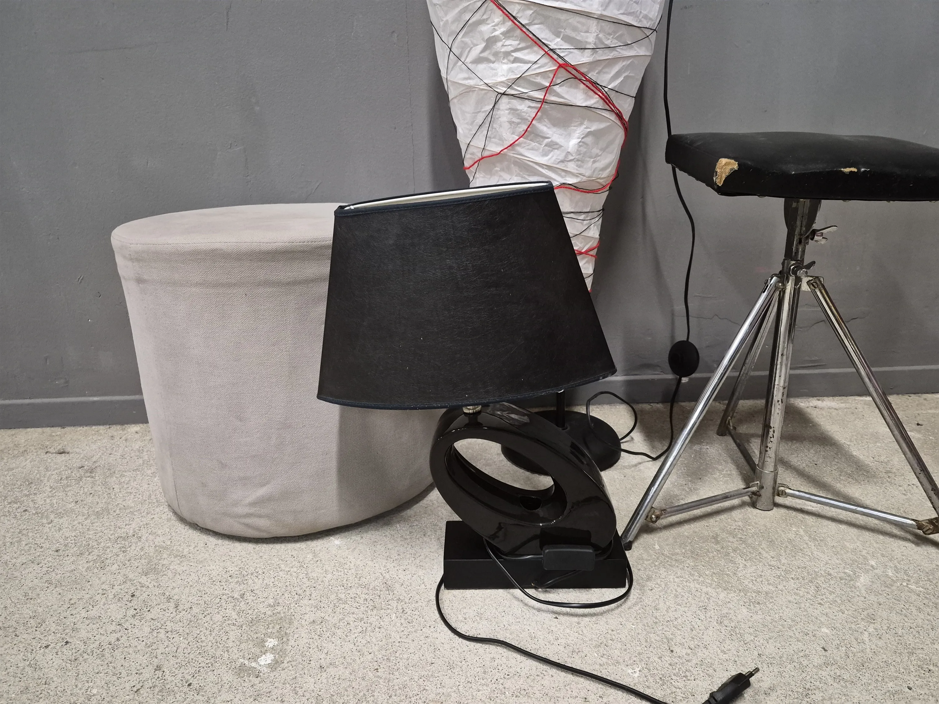 18027. Golvlampa, bordslampa och pallar 2 st, högsta höjd 141 cm