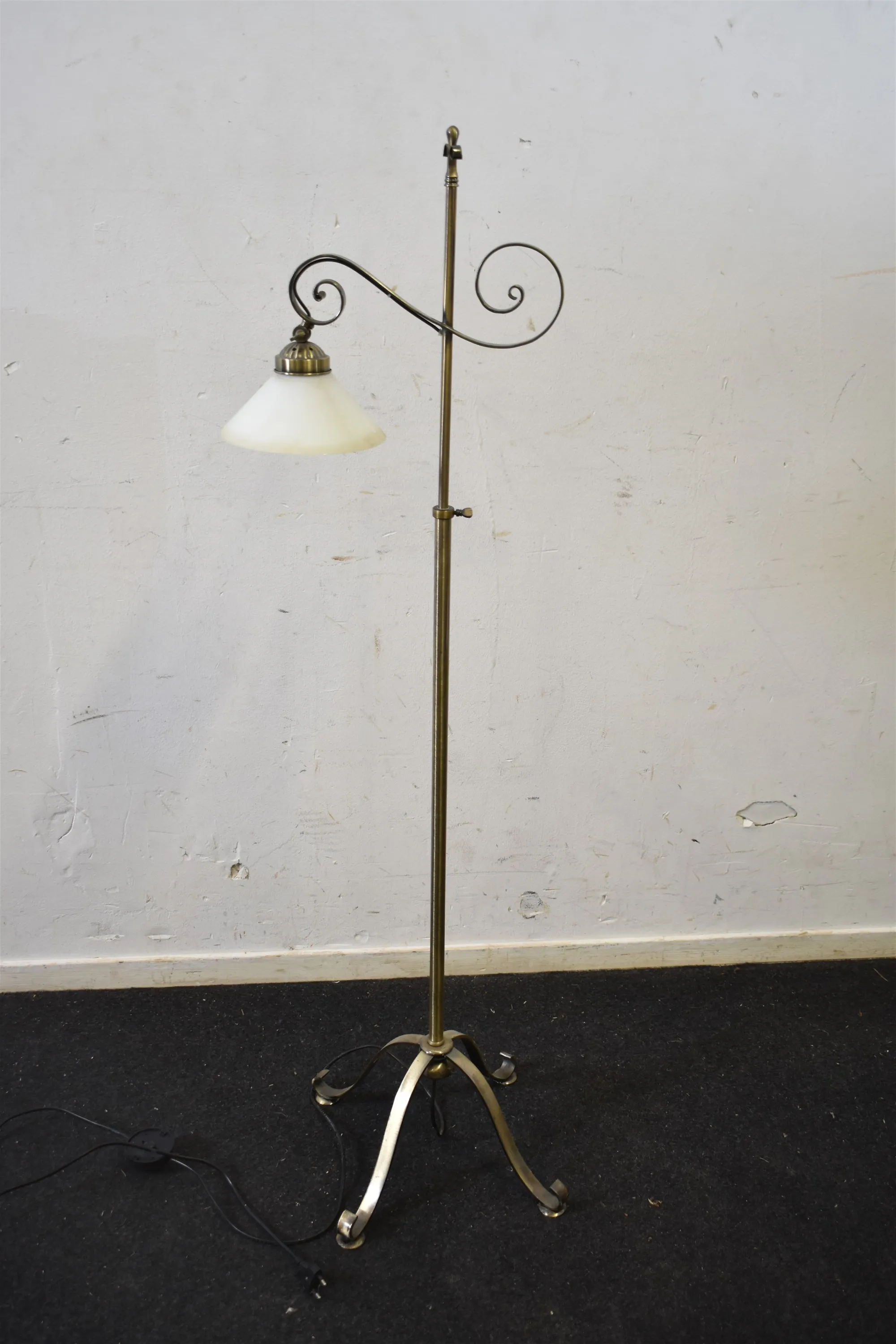 11414. Golvlampa metall, höj & sänkbar, skomakarskärm, mått 140 cm