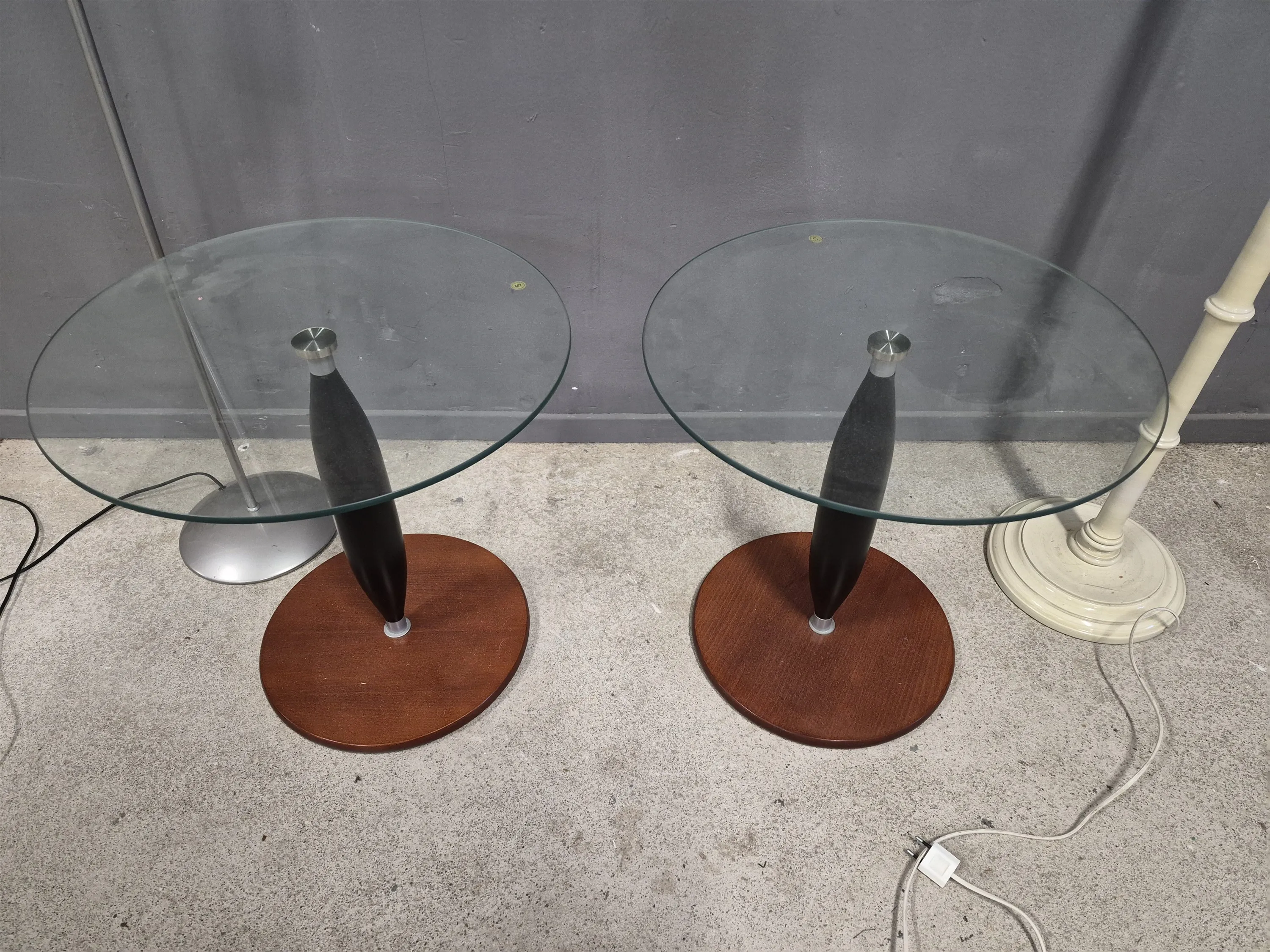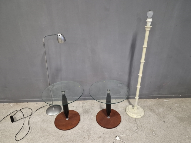 18560. Golvlampor 2 st högsta 135 cm & pelarbord 1 par med glasskiva höjd 50 cm