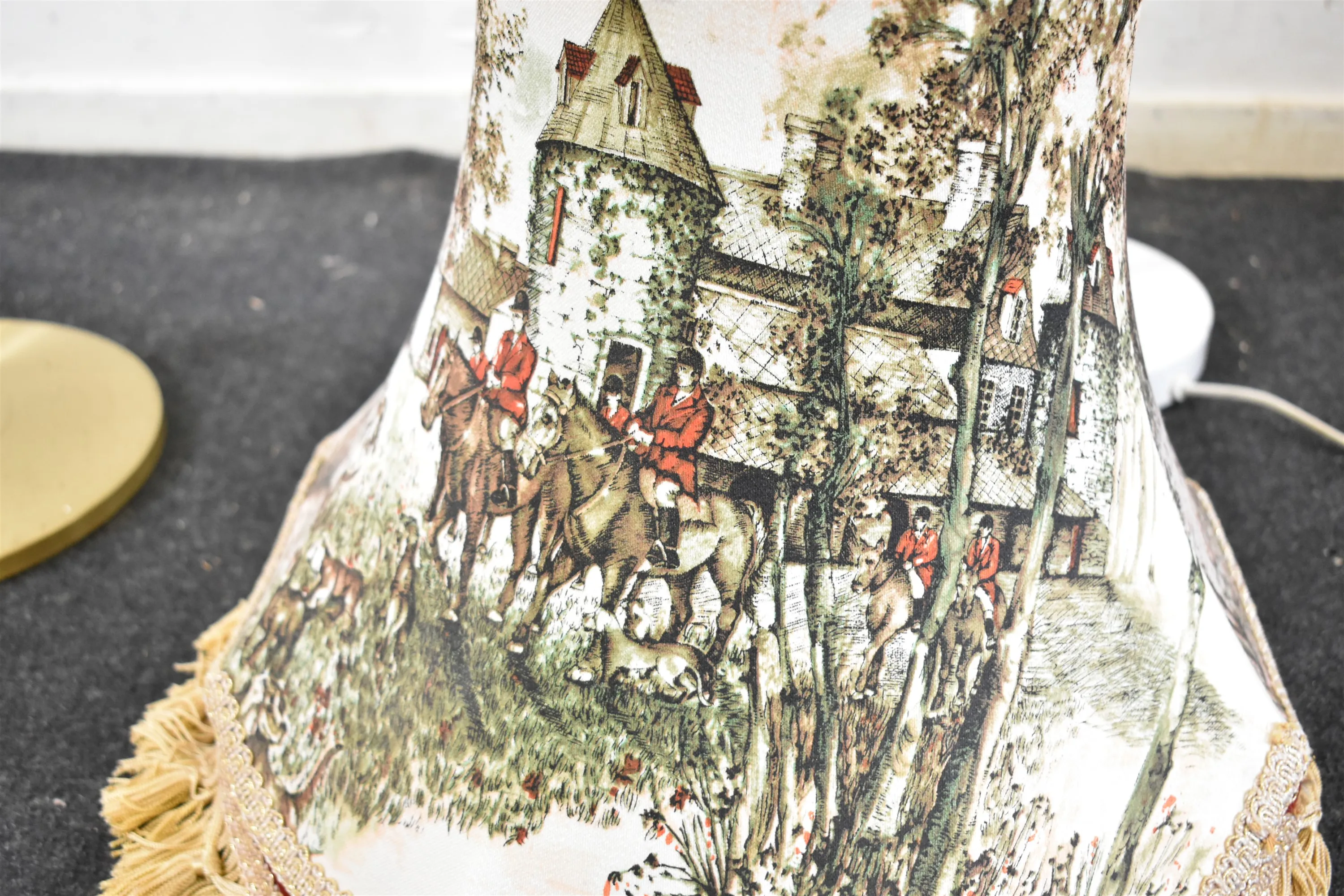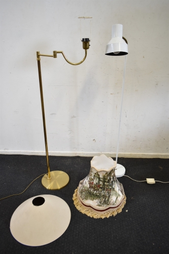 5974. Golvlampor 2 st och skärmar 2 st bla skärm med engelskt jaktmotiv, högsta höjd 145 cm